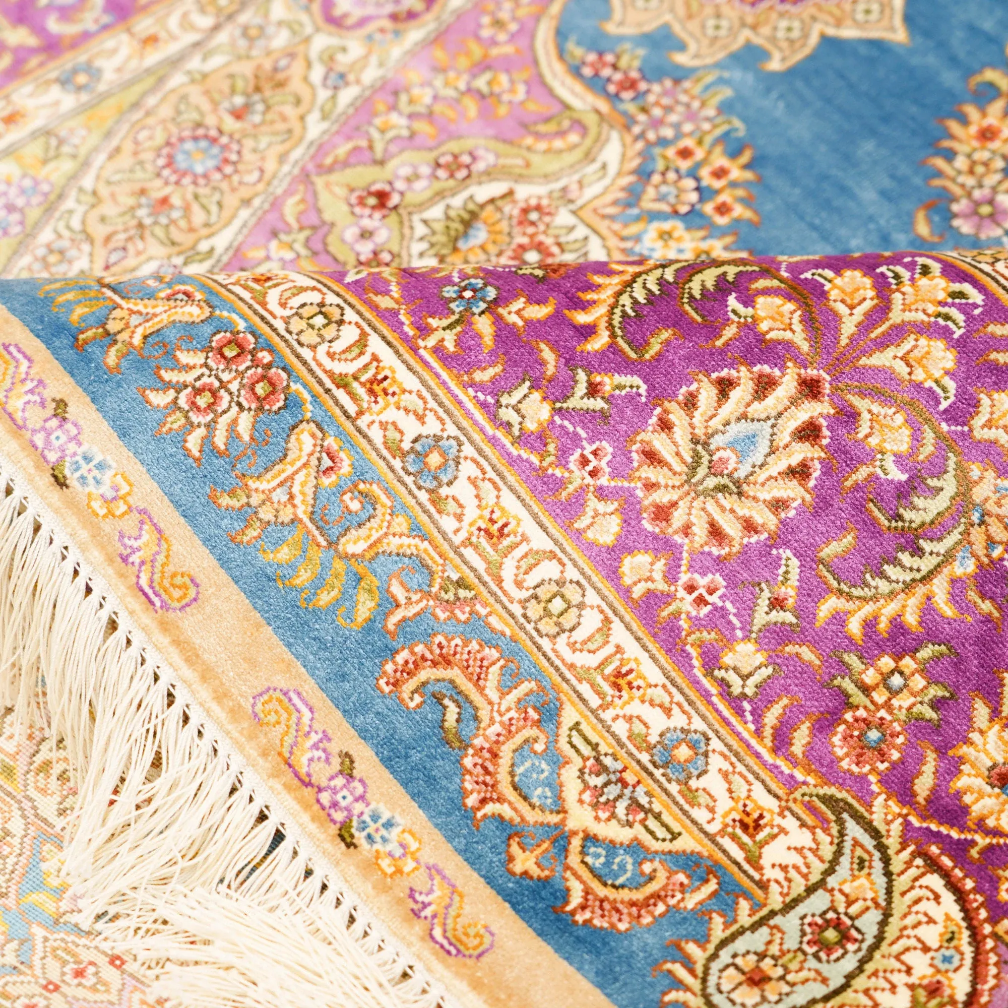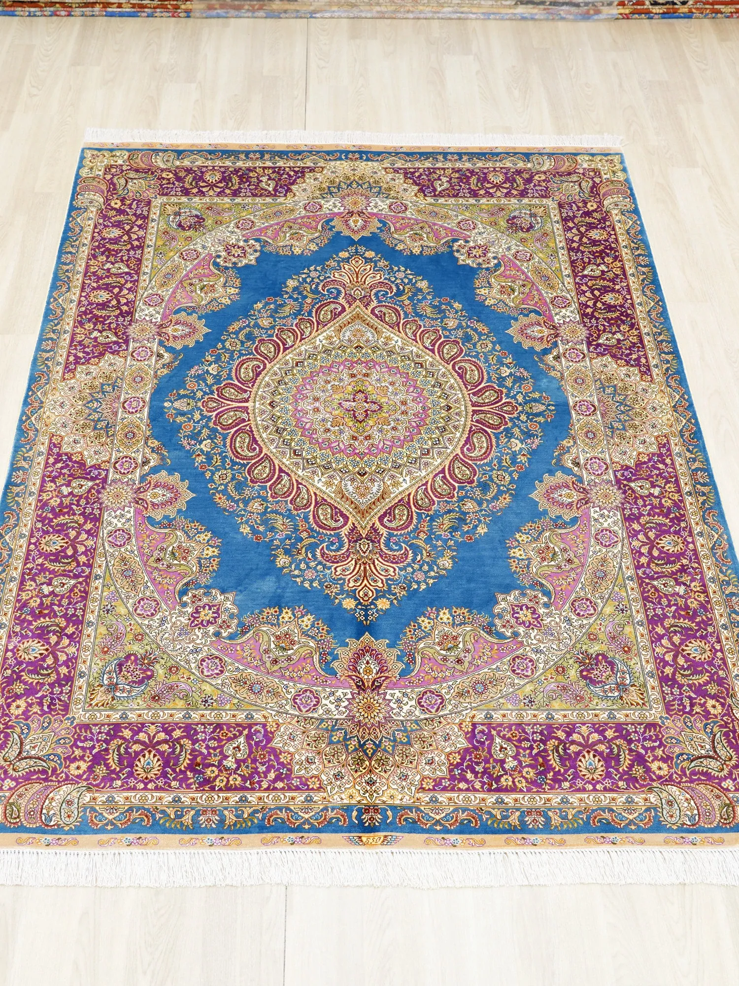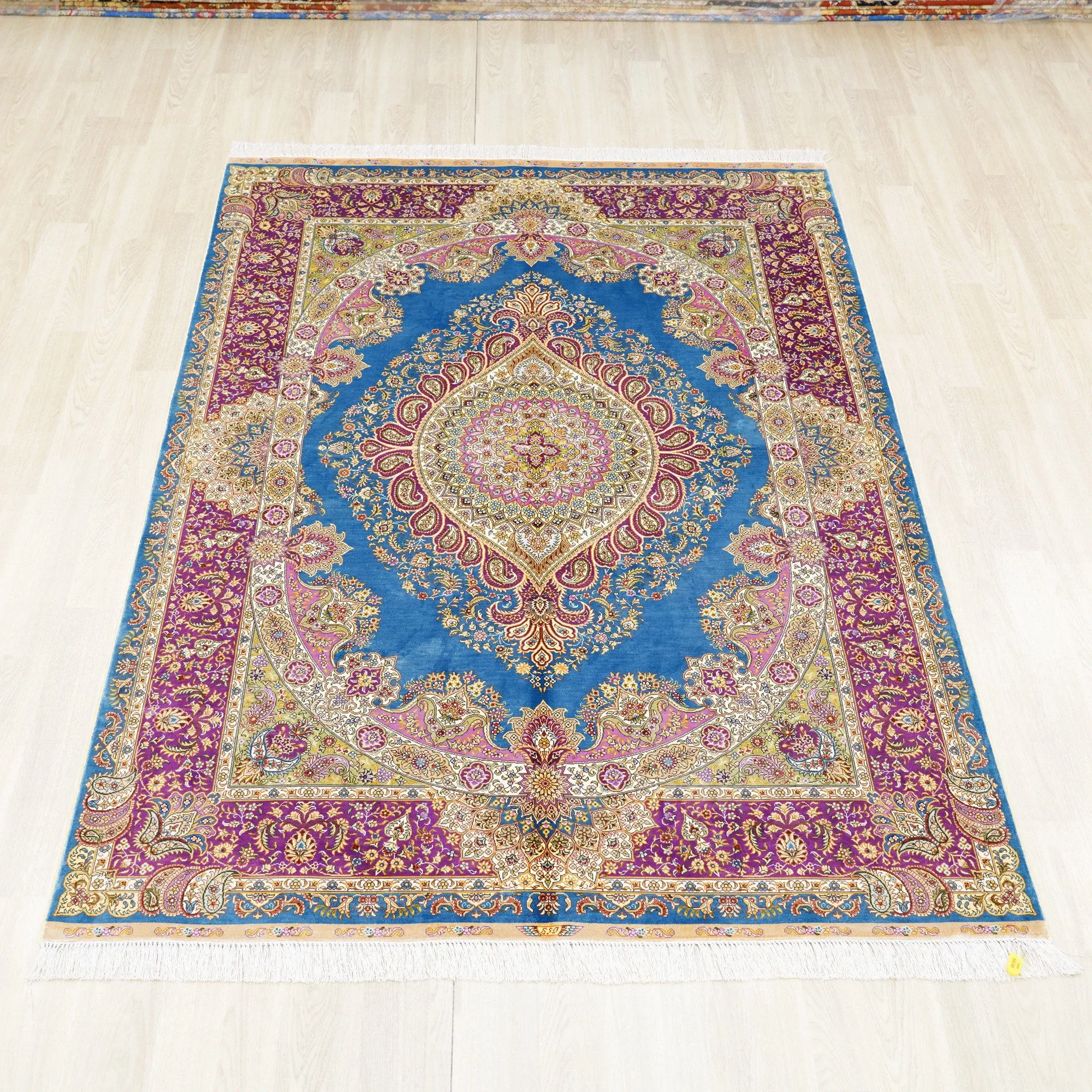 Artisan Handcrafted Blue Silk Carpet - Classic Persian Design for Villa, Bedroom, or Study - 150x230cm Perfect Size for Elegance and Comfort