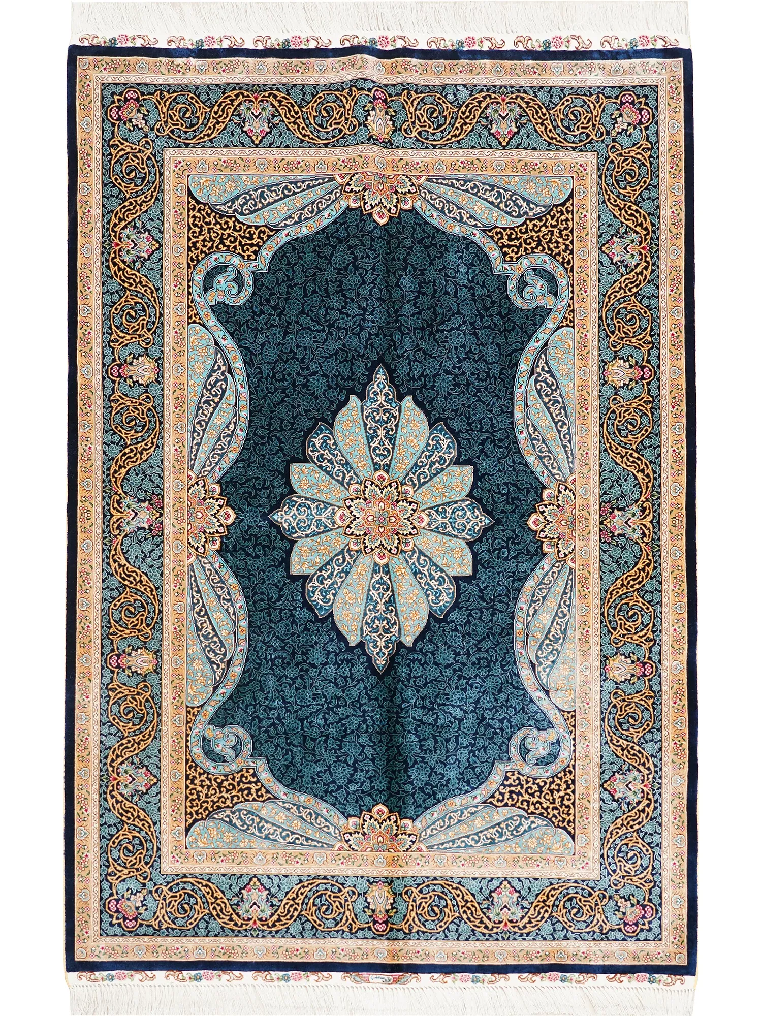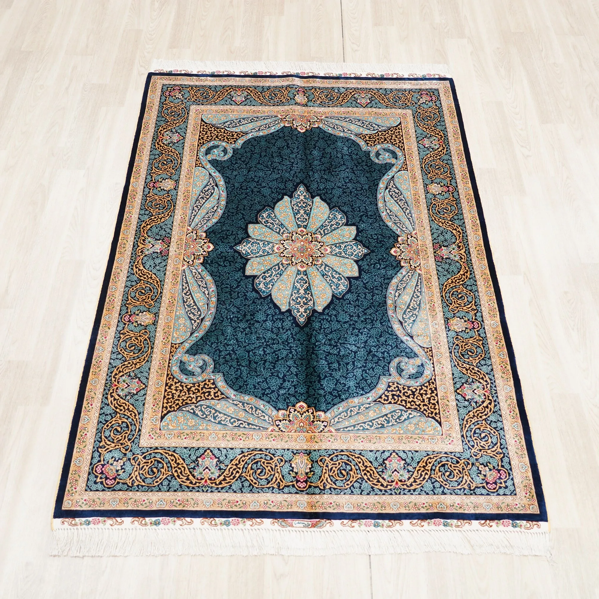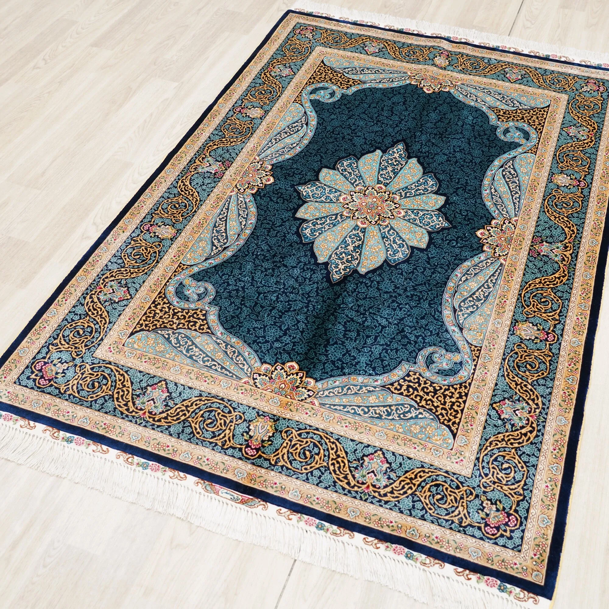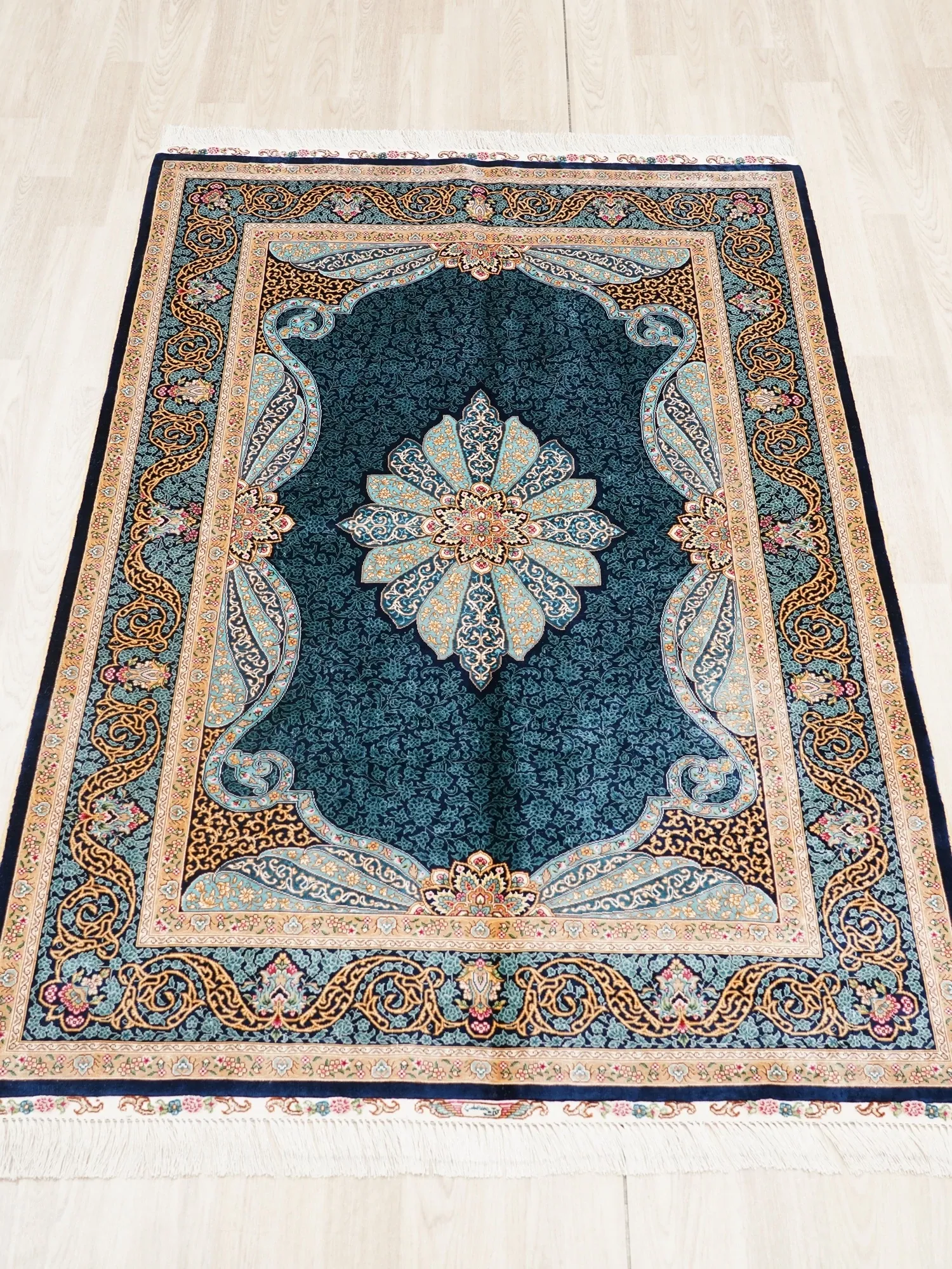 Artisan Handmade Silk Carpet - Exquisite Persian Design in Blue, Perfect for American Bedrooms, 120x180cm Bed Runner Rug