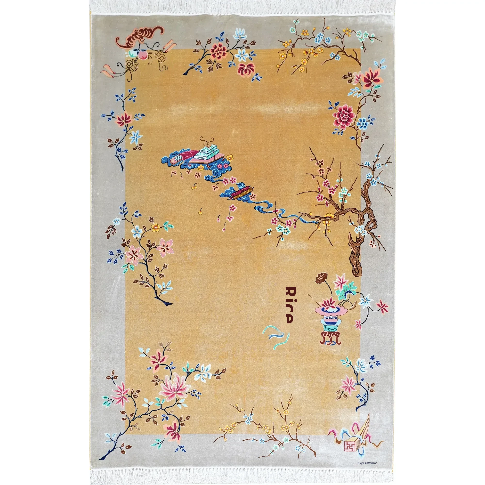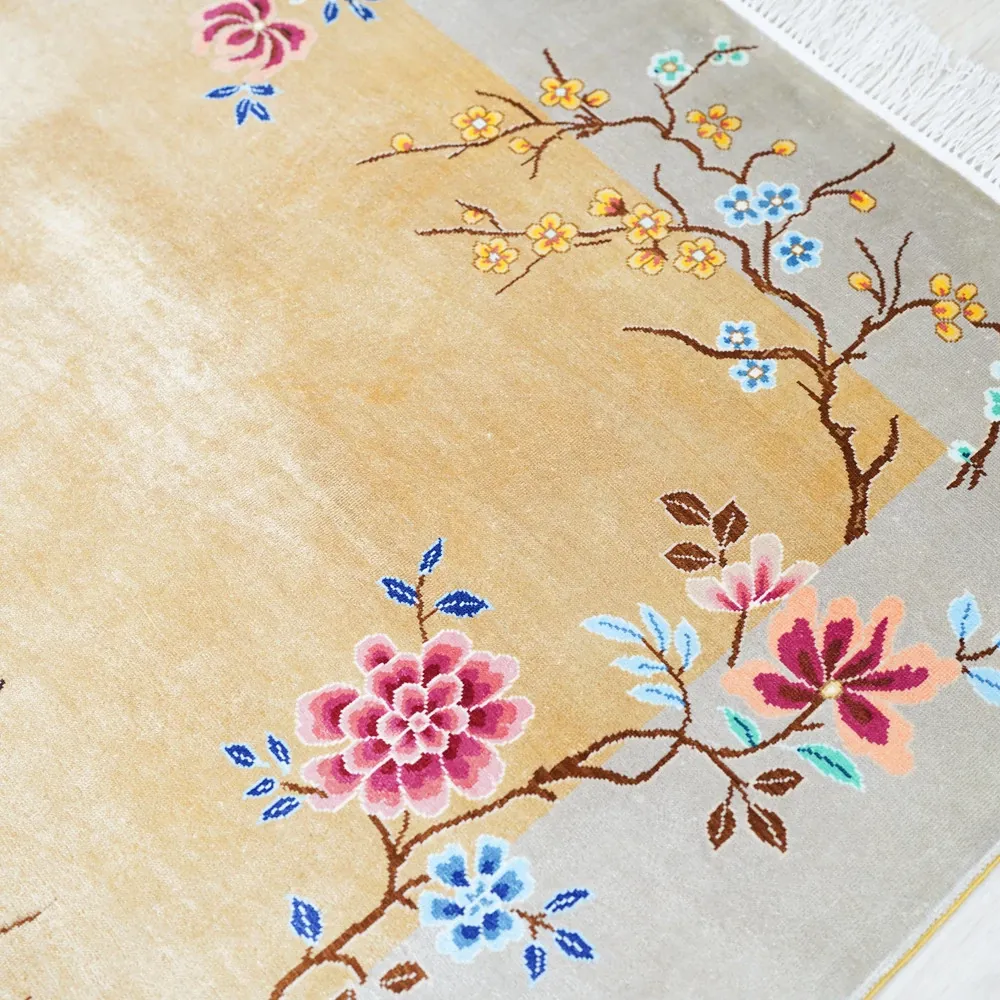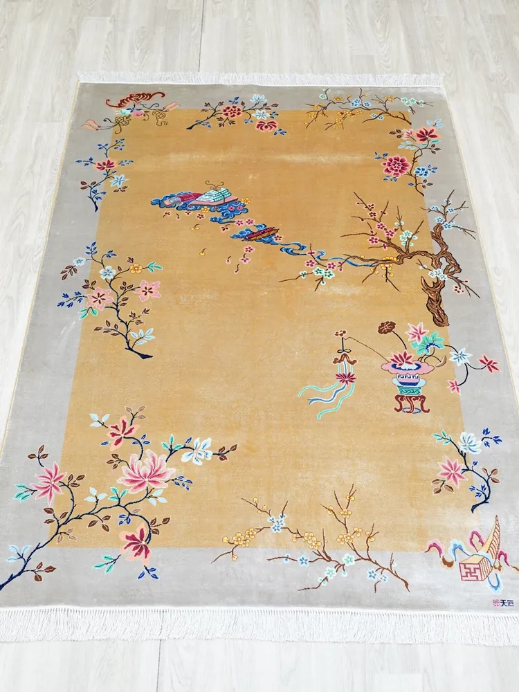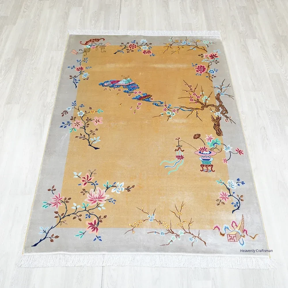 Handcrafted Genuine Silk Carpet in Khaki - Elegant Chinese Style Rug for Living Room, Bedroom, and Study - 120x180cm