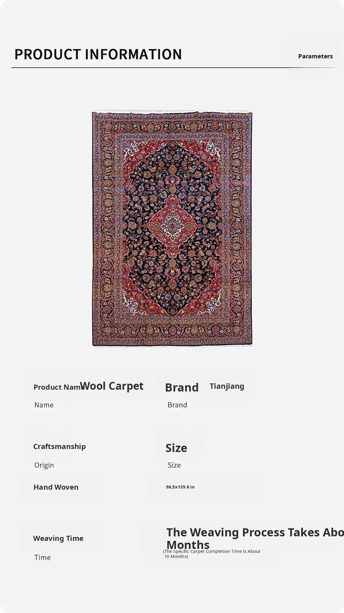 Luxury Handcrafted Persian-Style Wool Carpet - Glue-Free, Odorless, Ideal for Living Rooms - 245x355cm, Imported by TianJiang