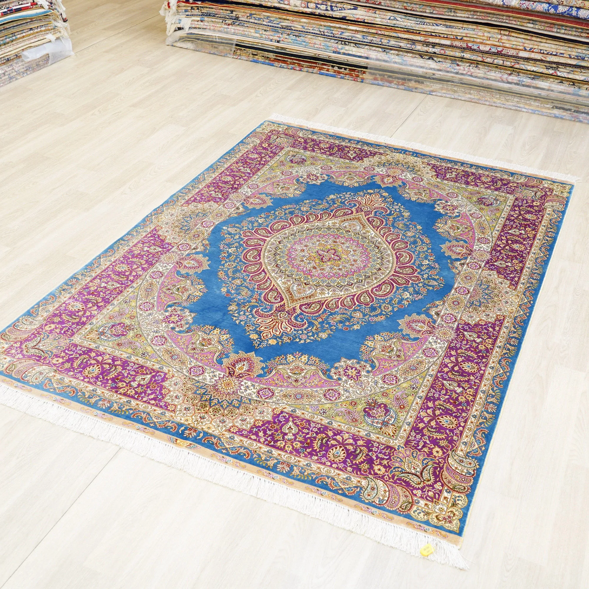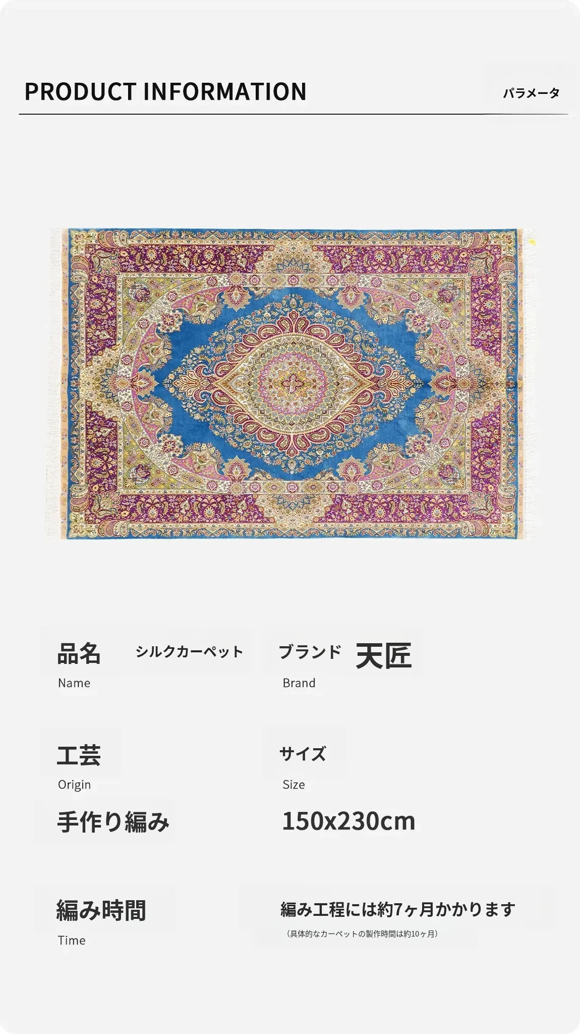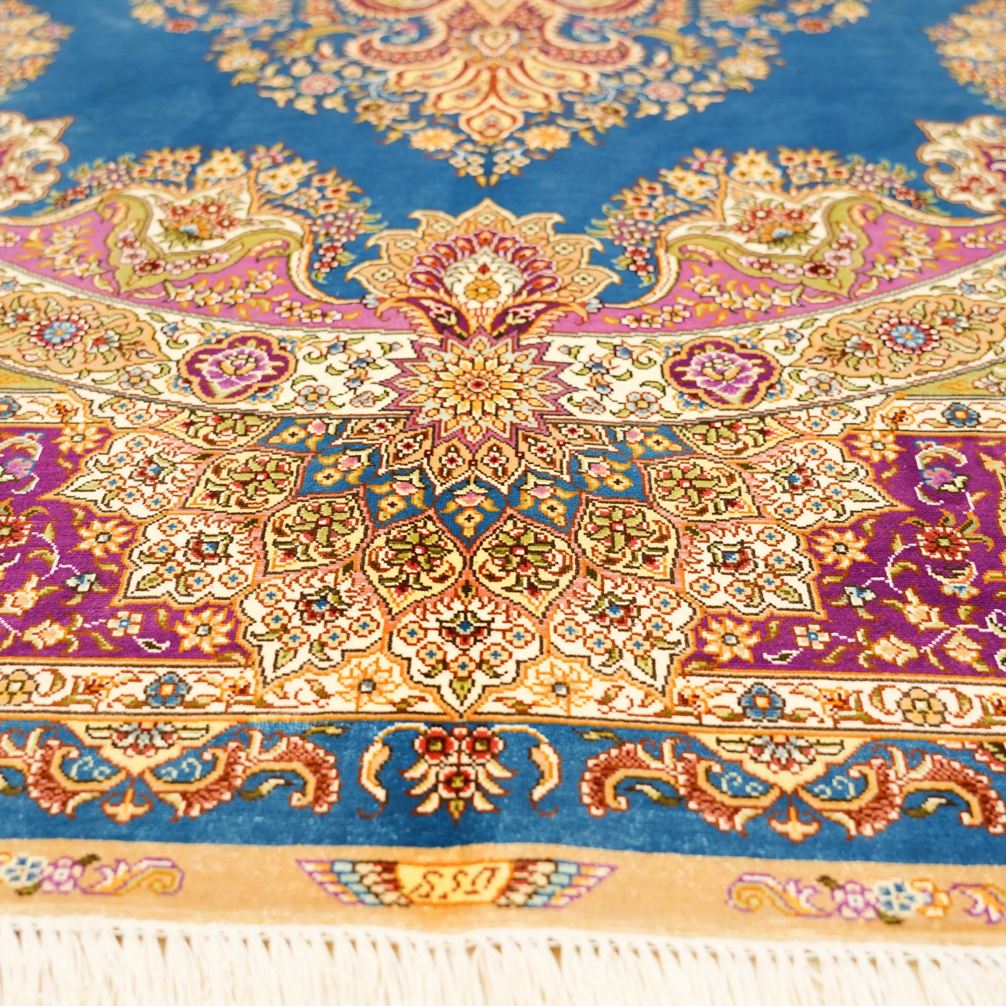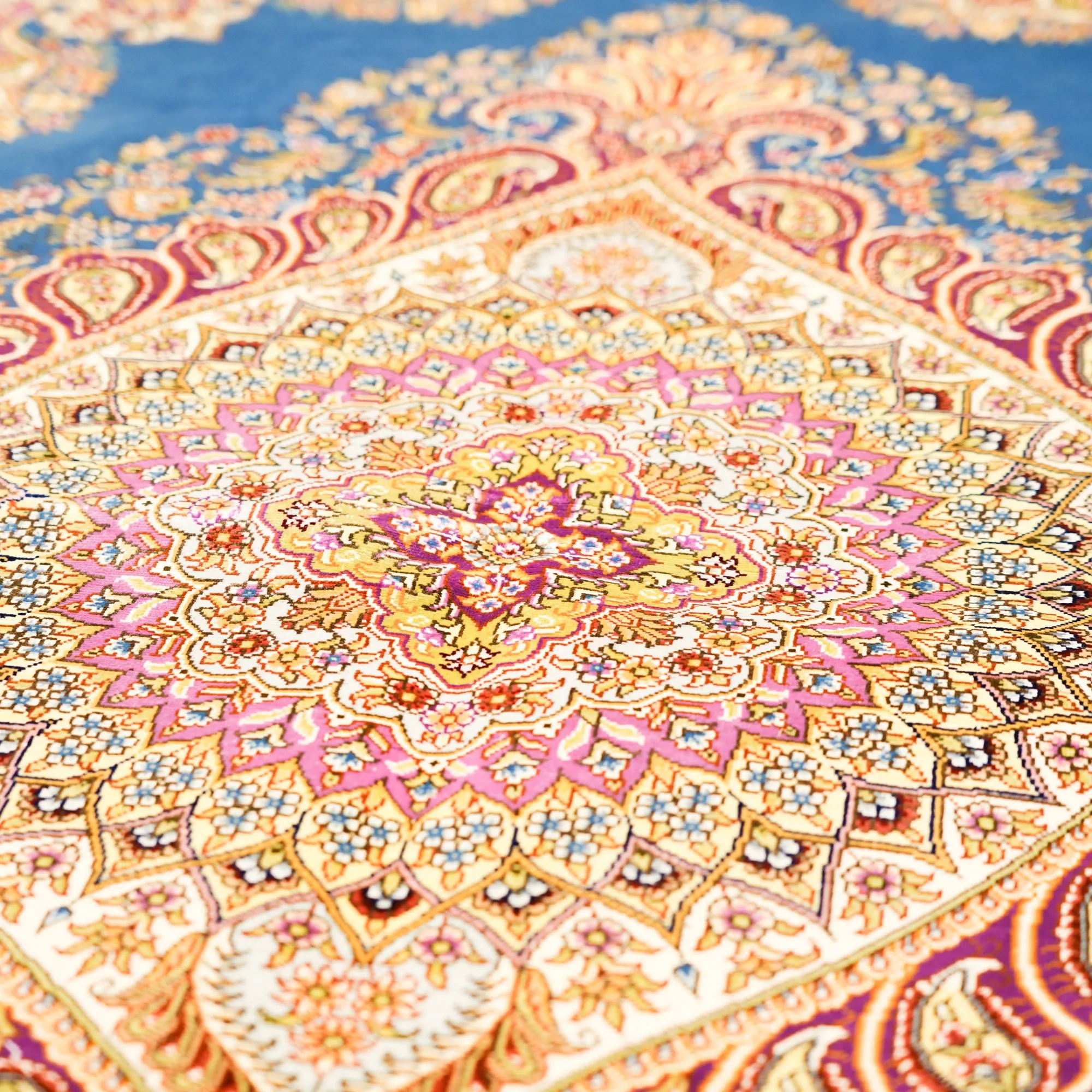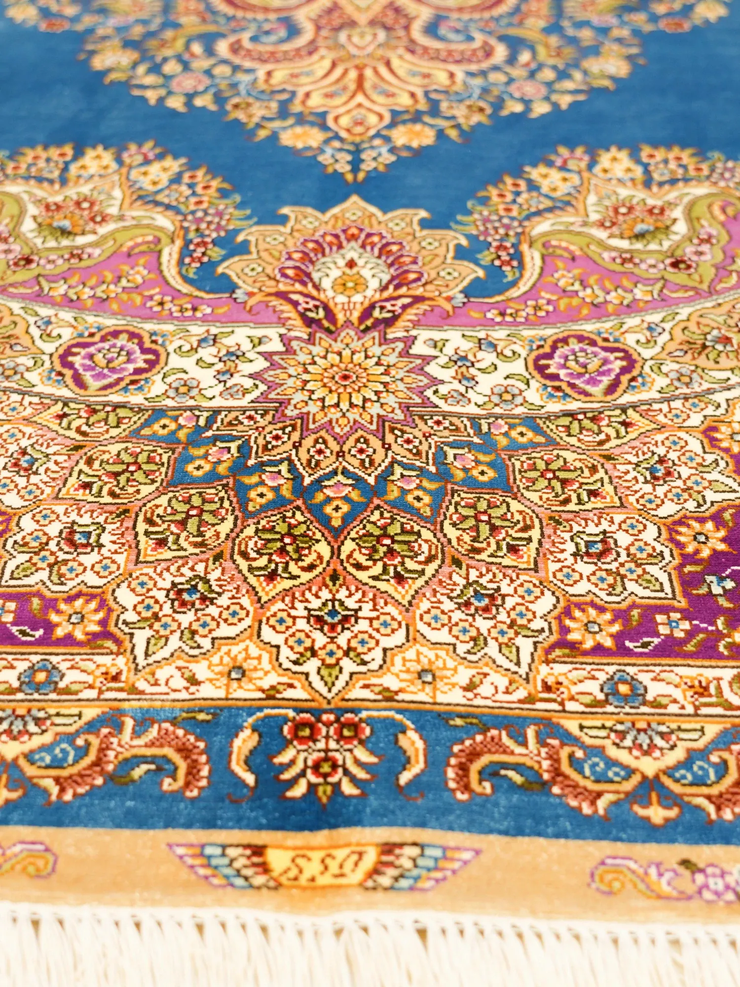 天匠手作の本物シルクラグ - クラシックなブルーのペルシャラグ、ヴィラの寝室や書斎に最適!サイズ150x230cm、洗練された空間を演出します。