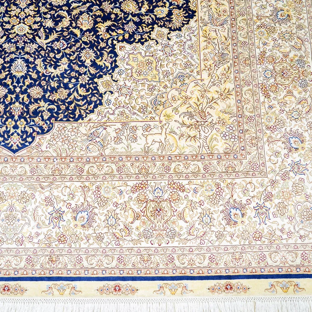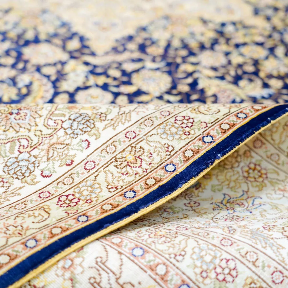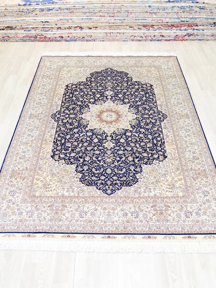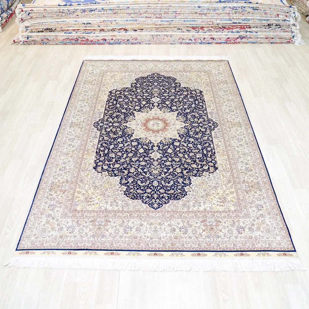 天匠手作の本物シルクカーペット、クラシックな青色ペルシャカーペット。欧米輸出向け、豪華な別荘にぴったりな180x270cmサイズ。高品質と優雅さを兼ね備え、特別な空間を演出します!