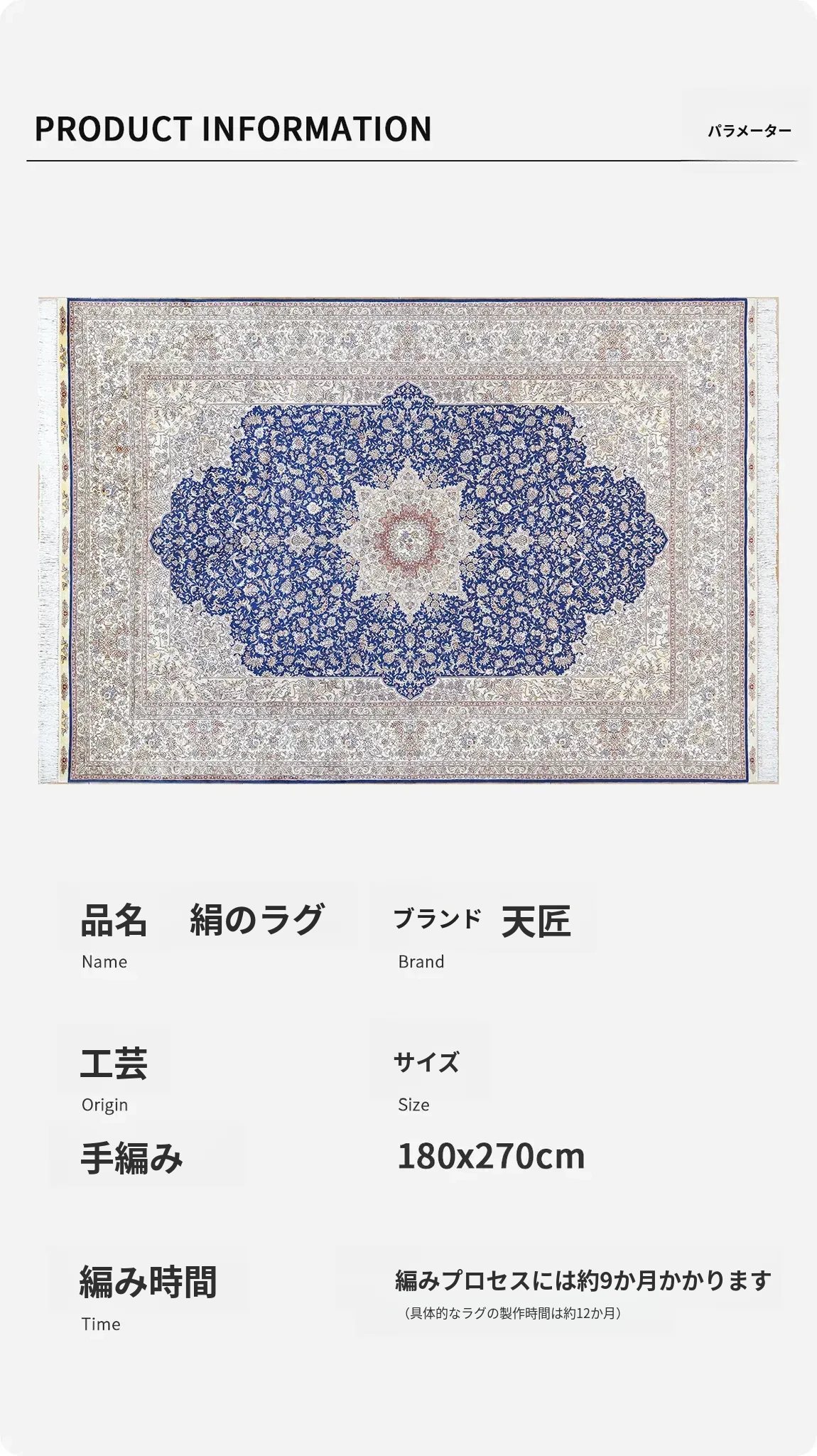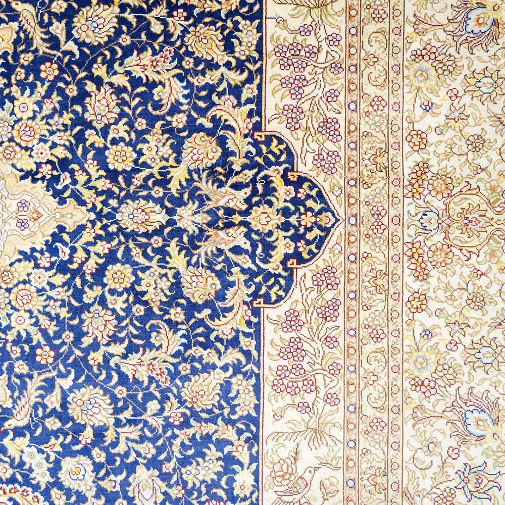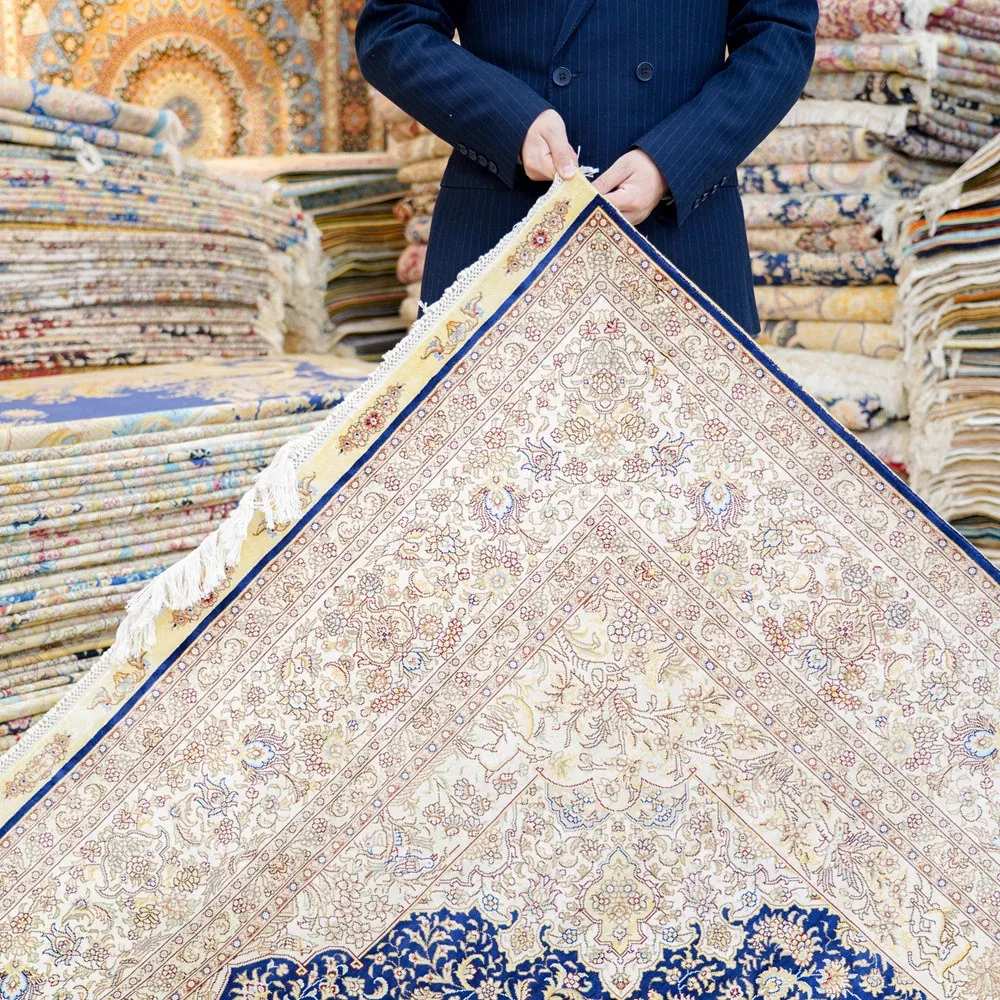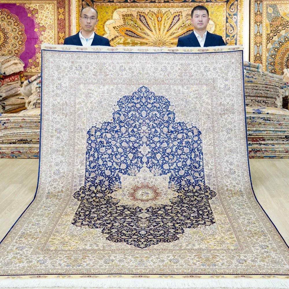天匠手作の本物シルクカーペット、クラシックな青色ペルシャカーペット。欧米輸出向け、豪華な別荘にぴったりな180x270cmサイズ。高品質と優雅さを兼ね備え、特別な空間を演出します!