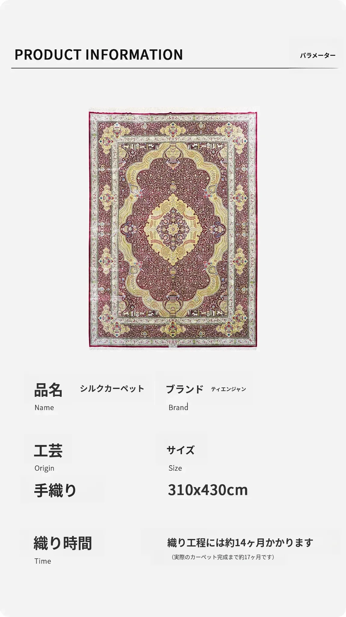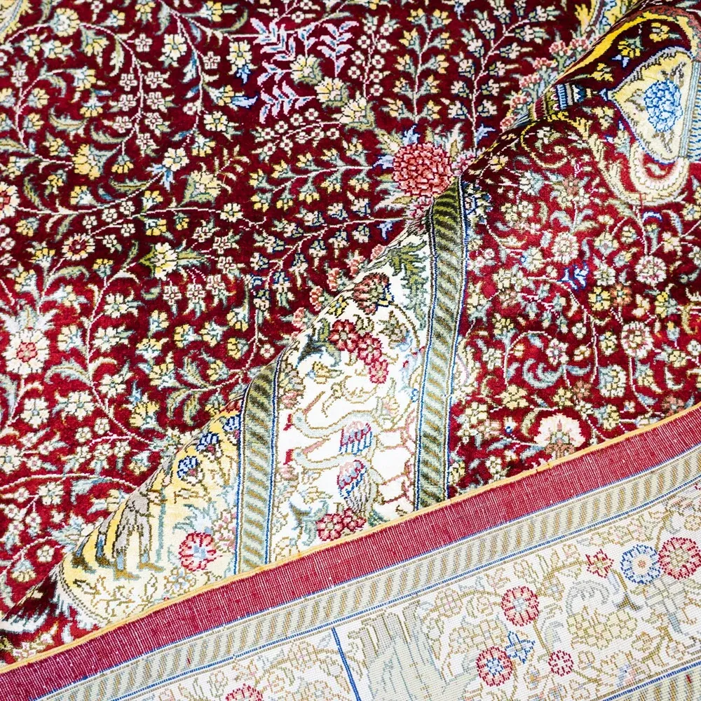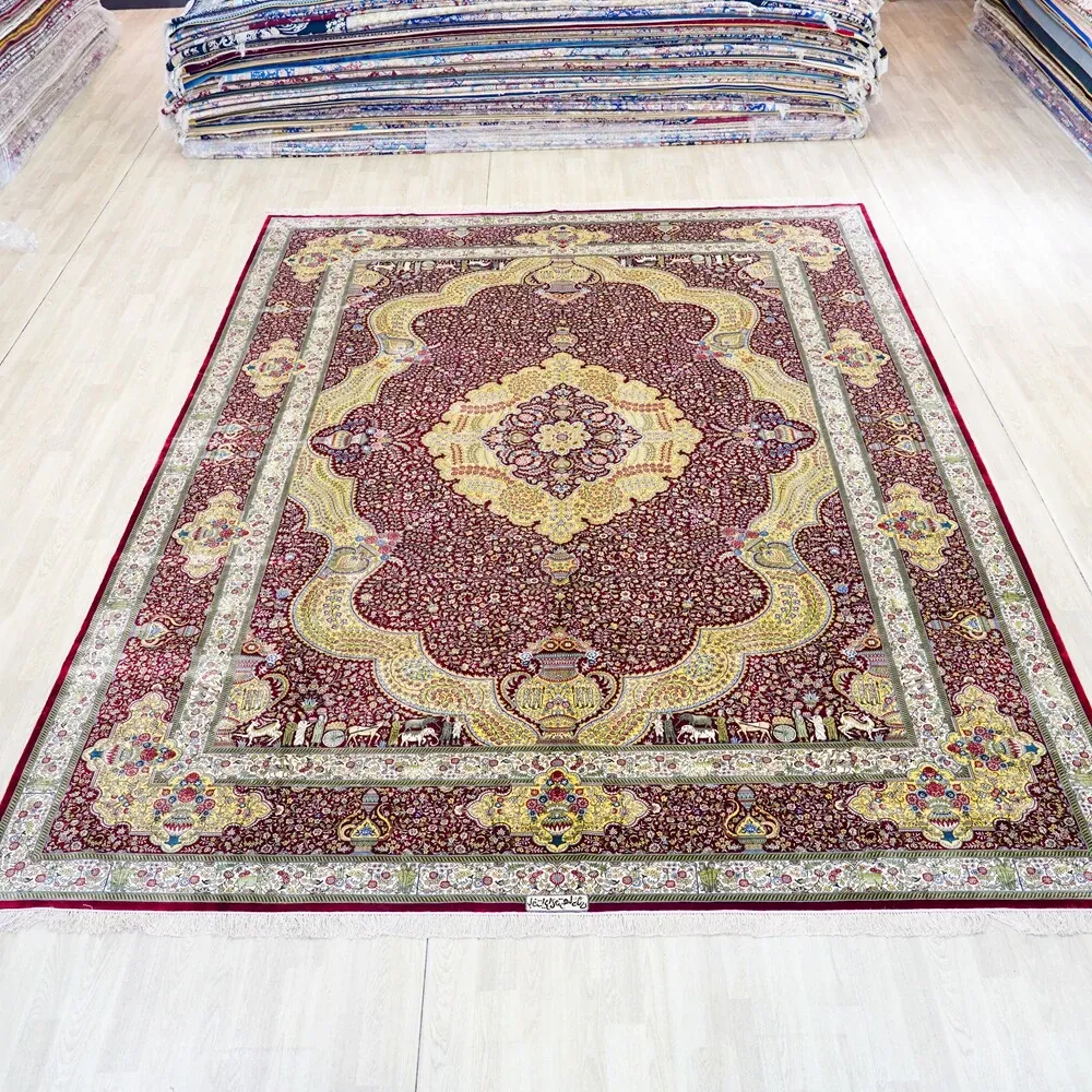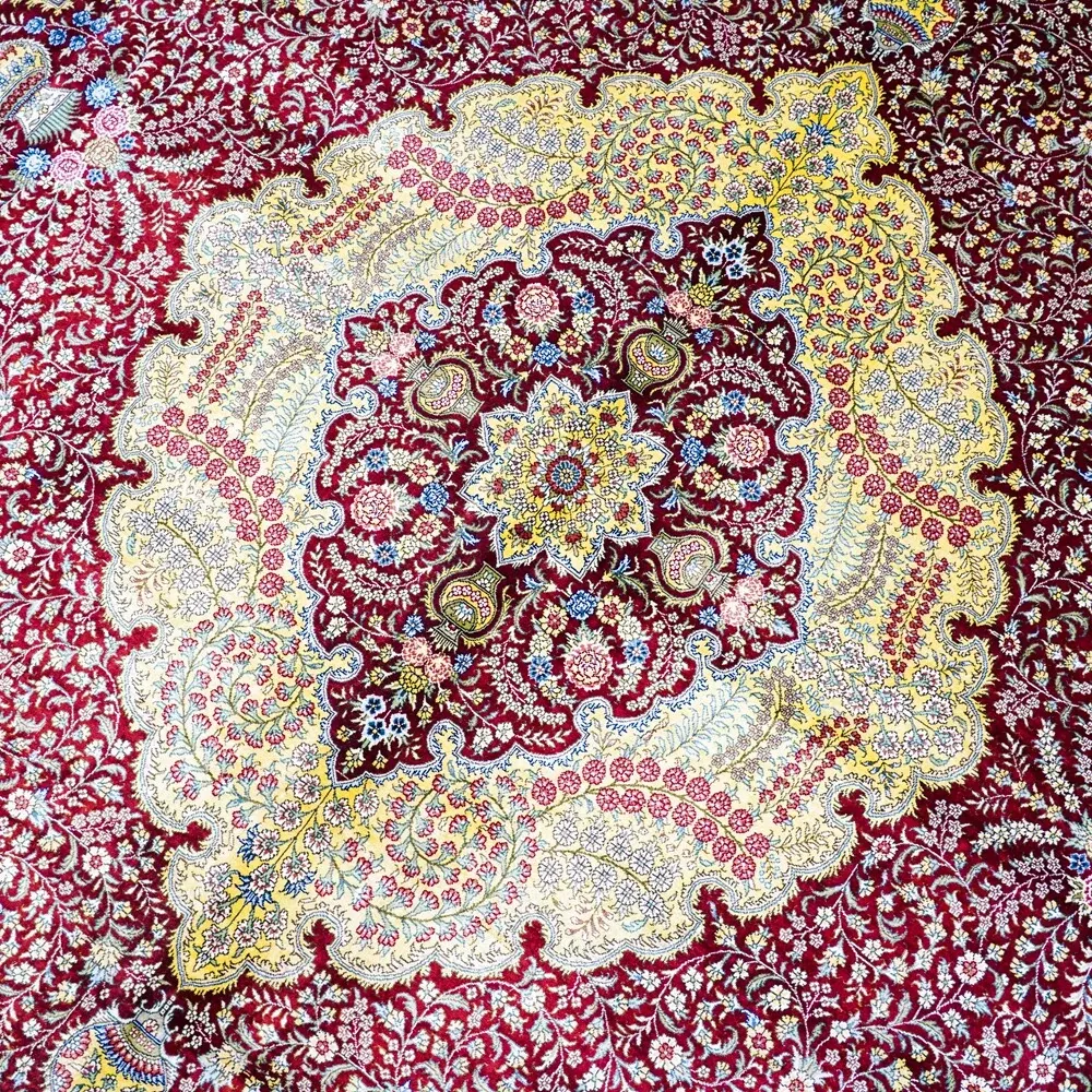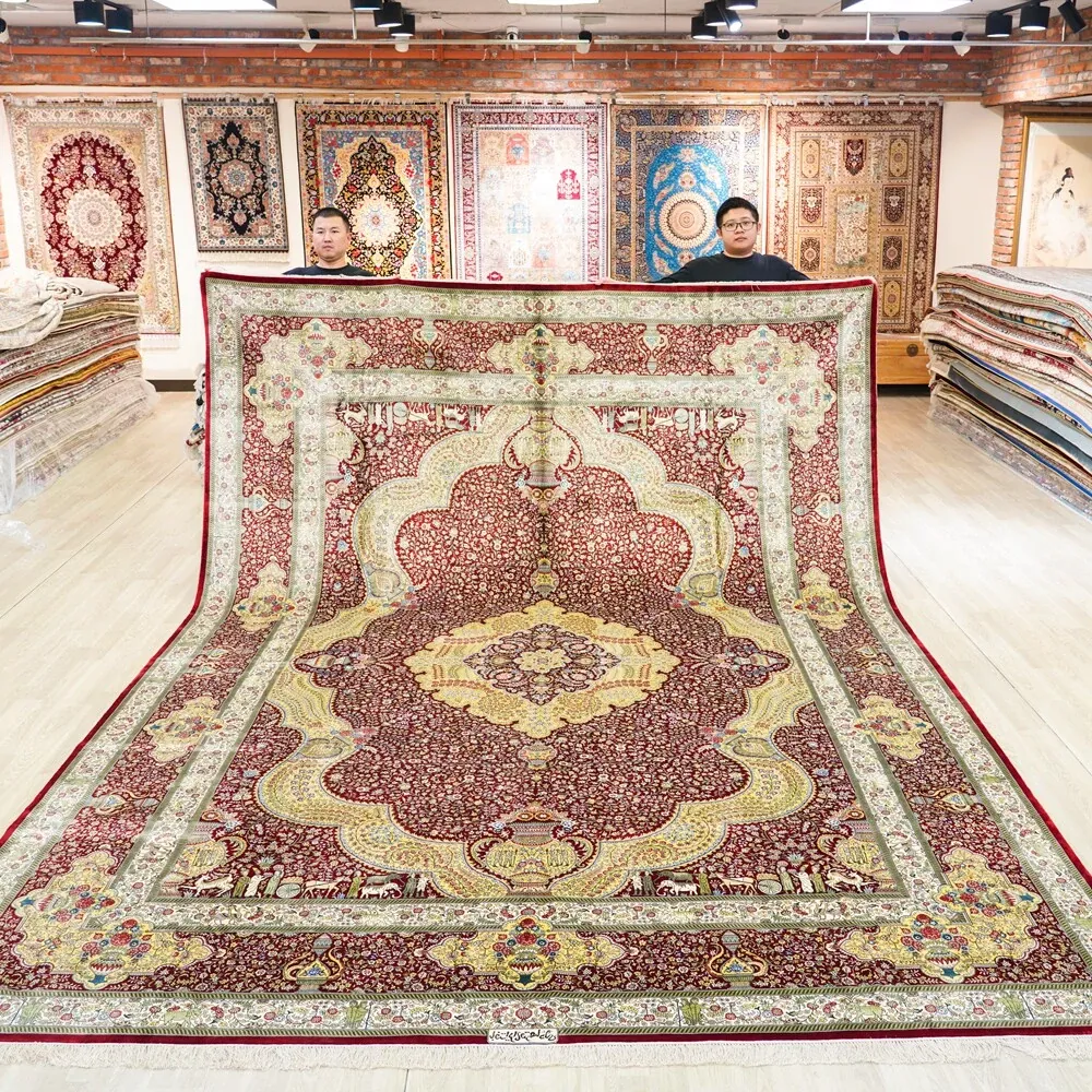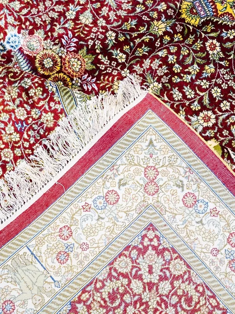 匠心手作の本真綿シルクカーペット 鮮やかな赤色のペルシャ絨毯 イラン直輸入のアメリカンスタイル 310x430cmの広々サイズ!お部屋を華やかに彩ります。