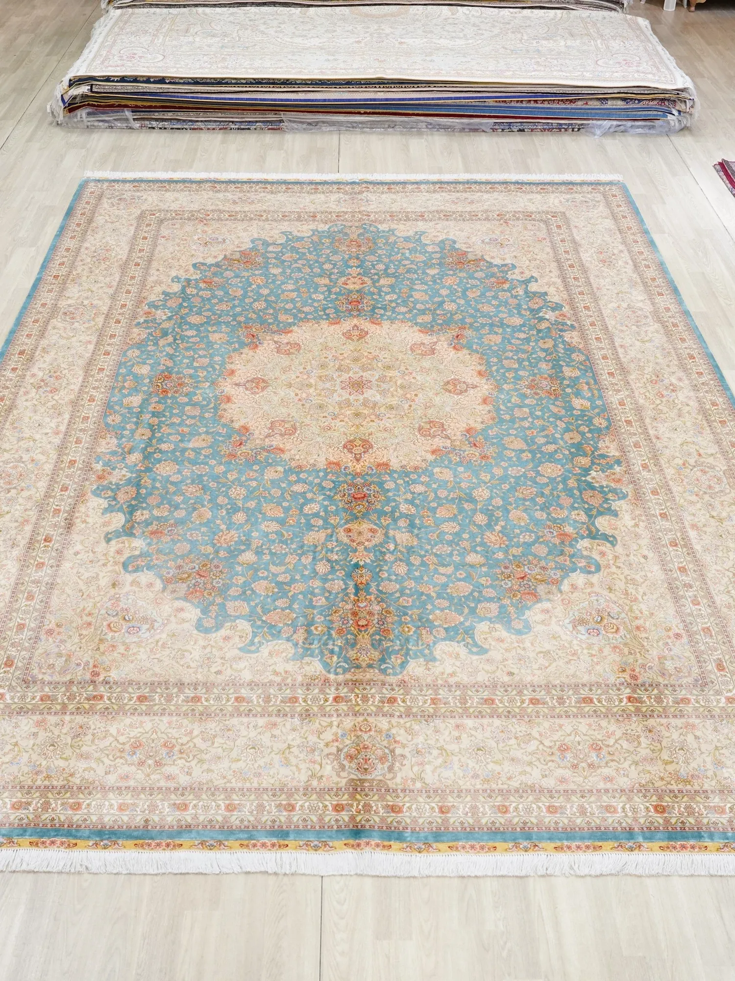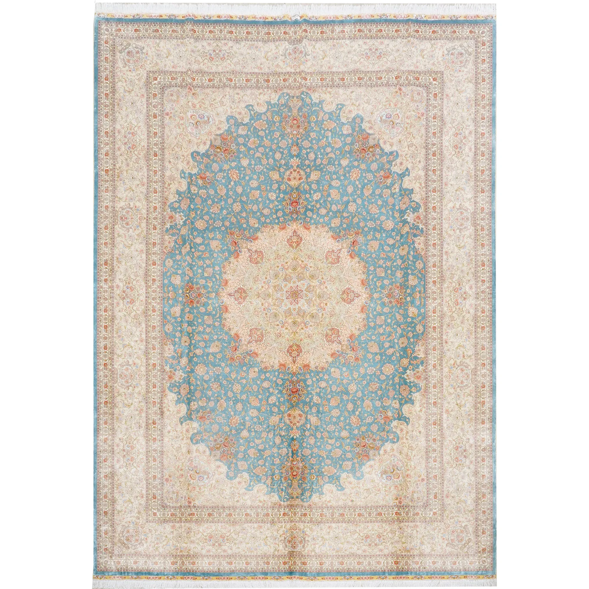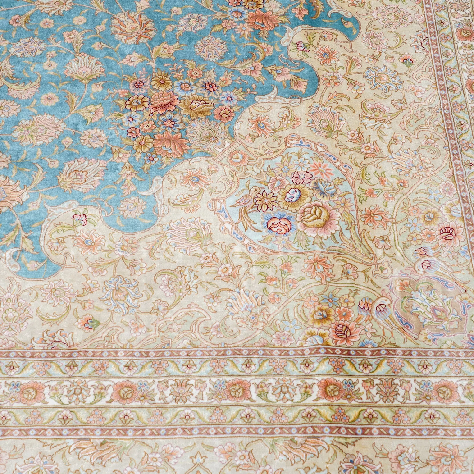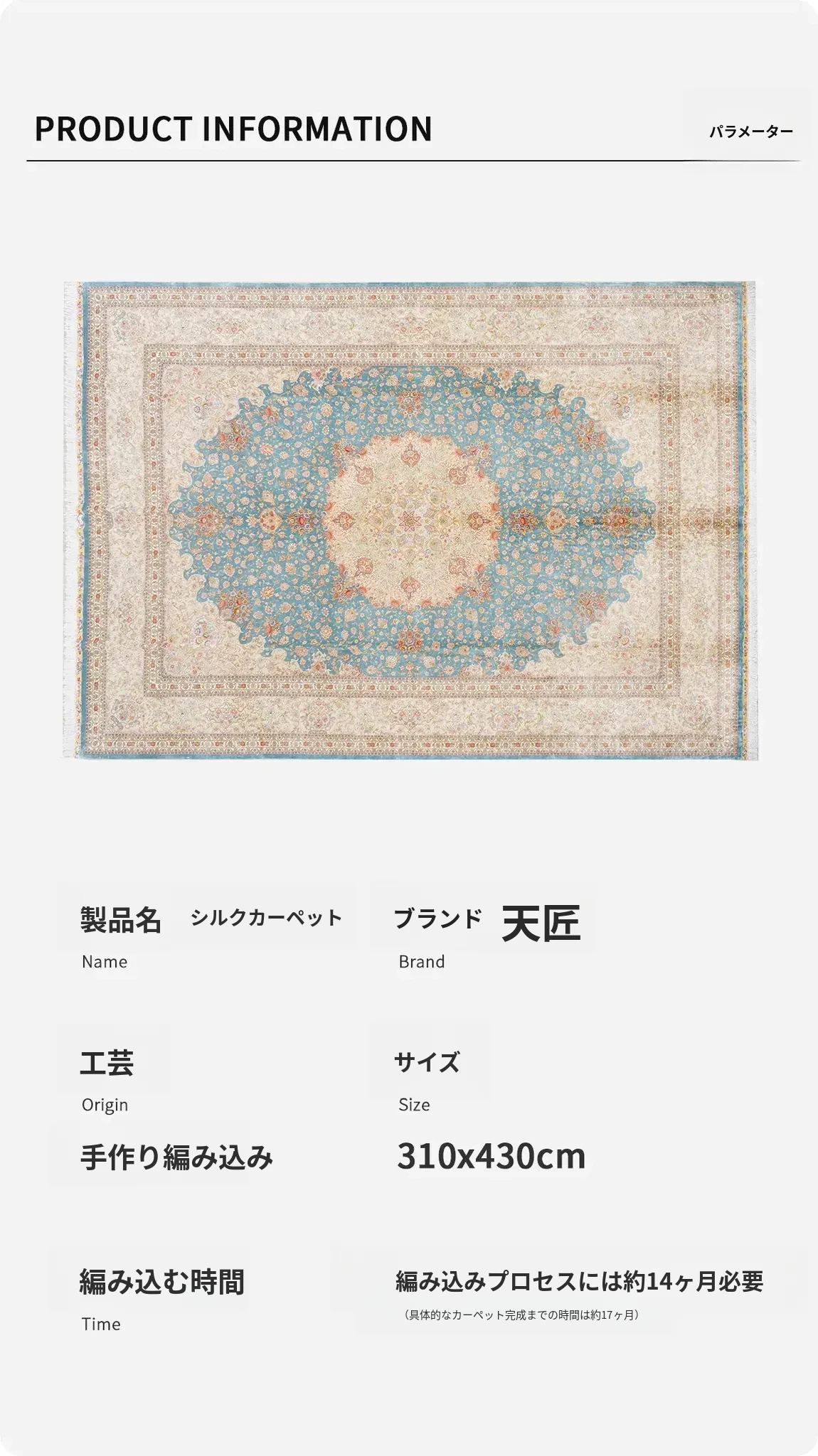 天匠の手作りシルクカーペット - イラン製の高級シルクカーペット、リビングや寝室にぴったり!豪華な310x430cmサイズ、羊毛の柔らかさと美しさを兼ね備えた一品で、あなたの空間を華やかに彩ります。