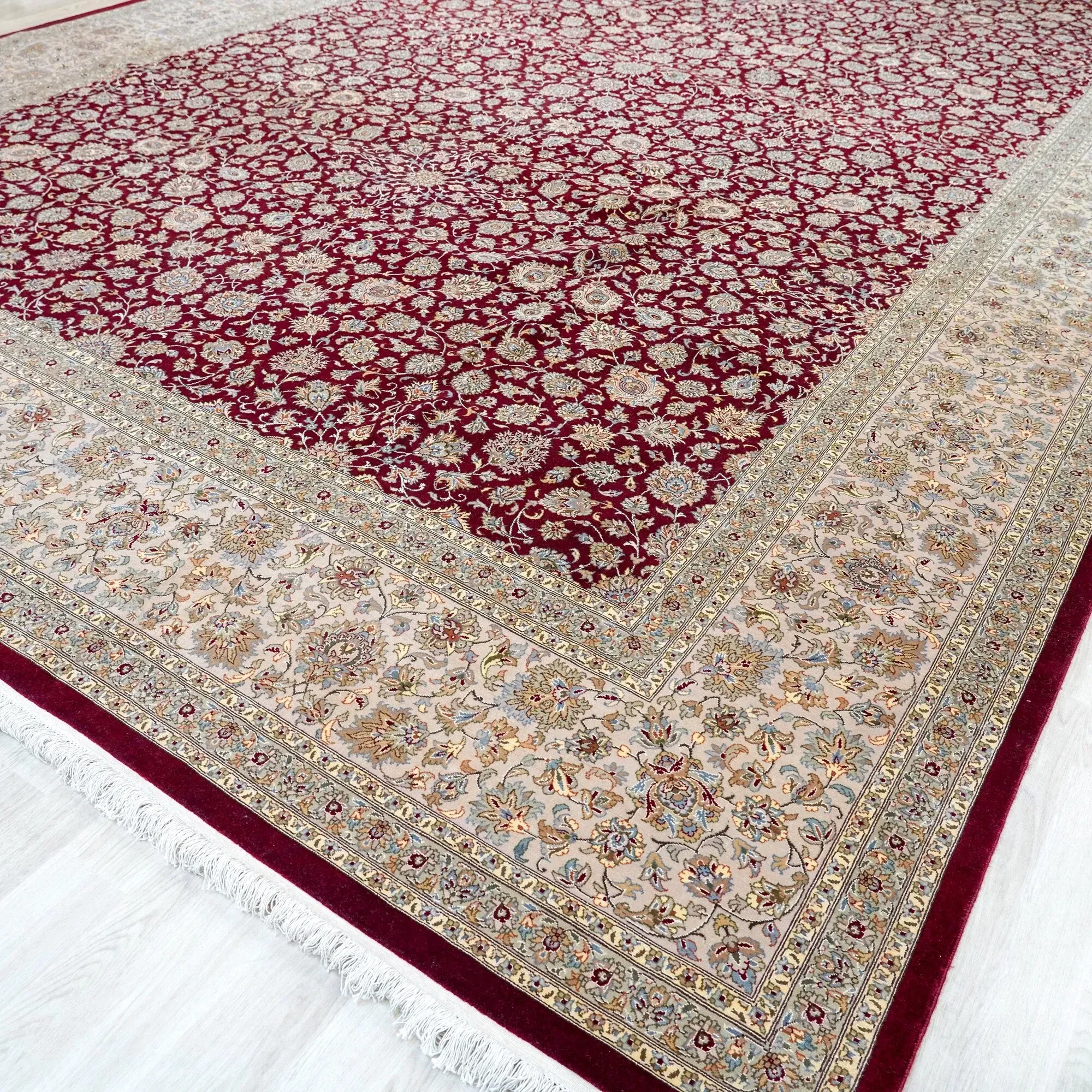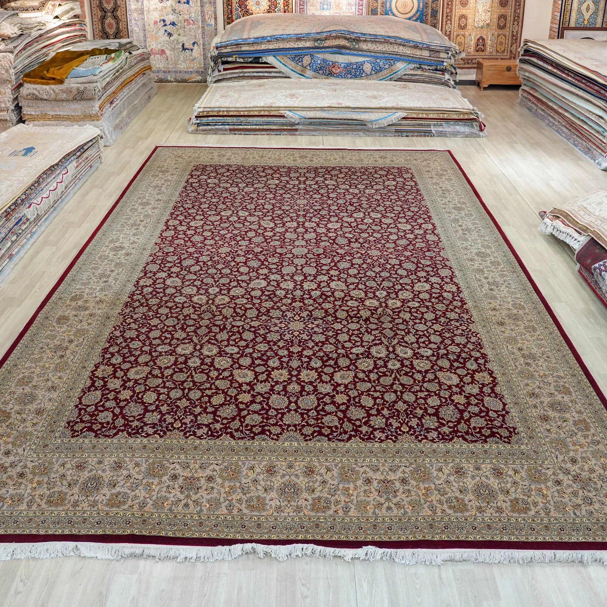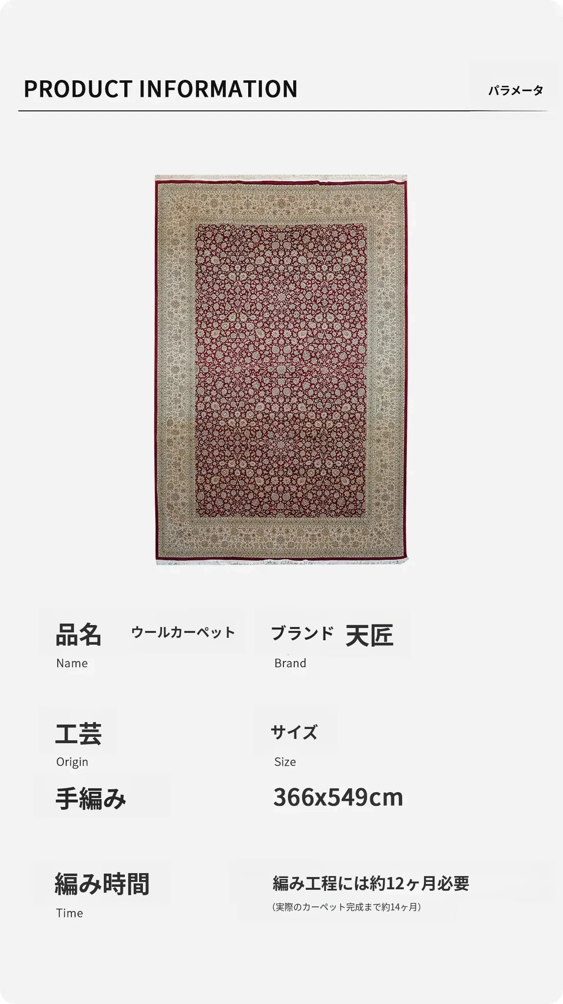 職人の手作りウールカーペット、ペルシャ風デザイン!広々とした366x549cmのサイズで、欧米スタイルのリビングにぴったり。おしゃれで温かみのある空間を演出します!