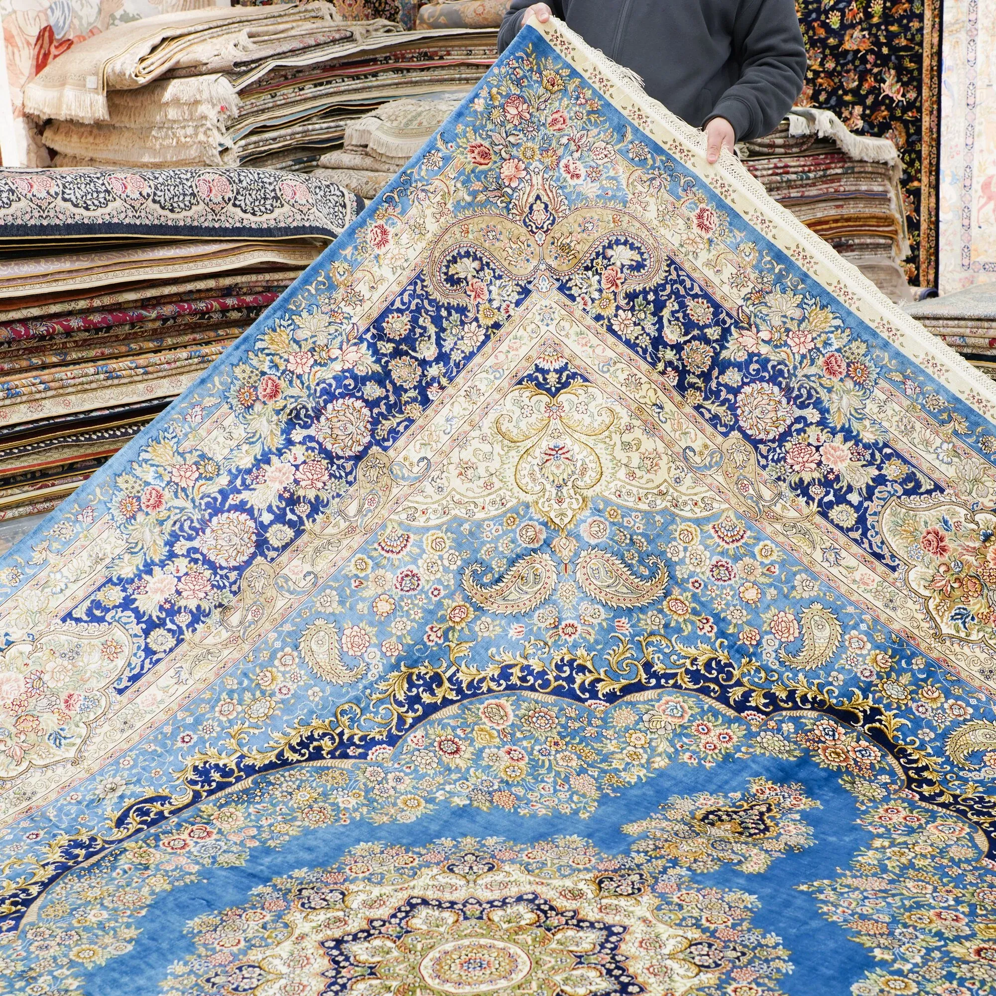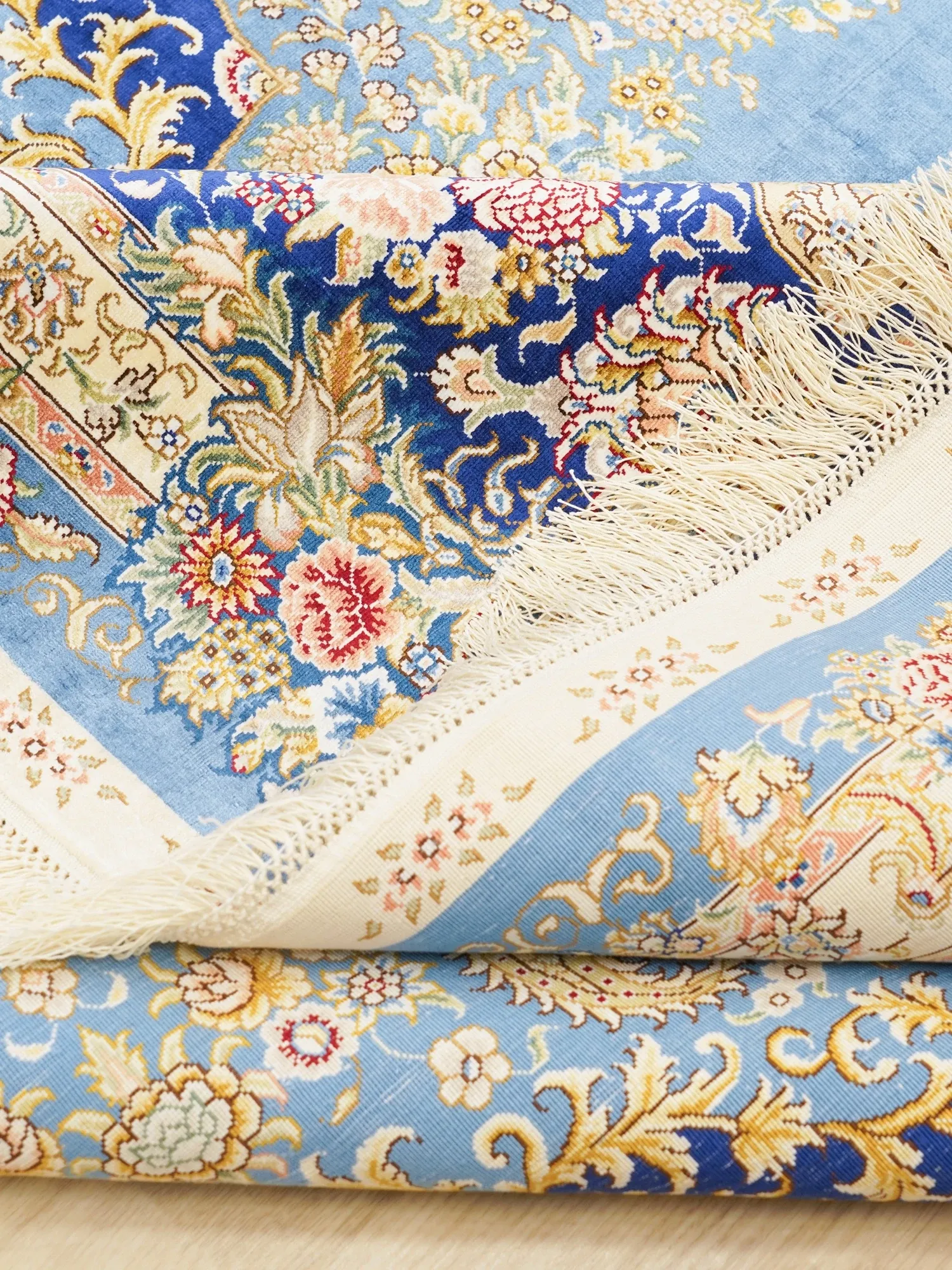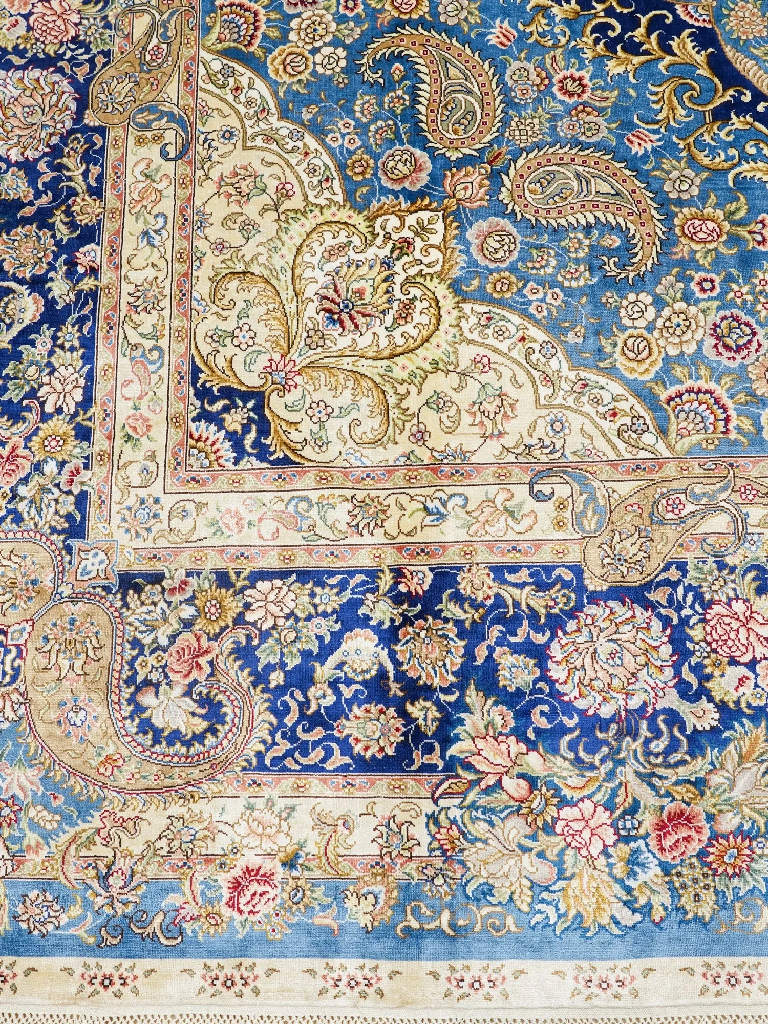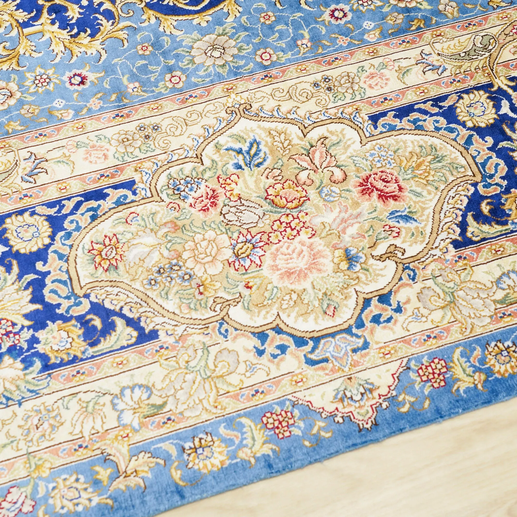 天匠の手作り本絹カーペット - ブルーのクラシックなペルシャ絨毯、240x310cmのサイズで書斎や寝室に最適!高級感あふれるシルク素材で、優雅な空間を演出します。