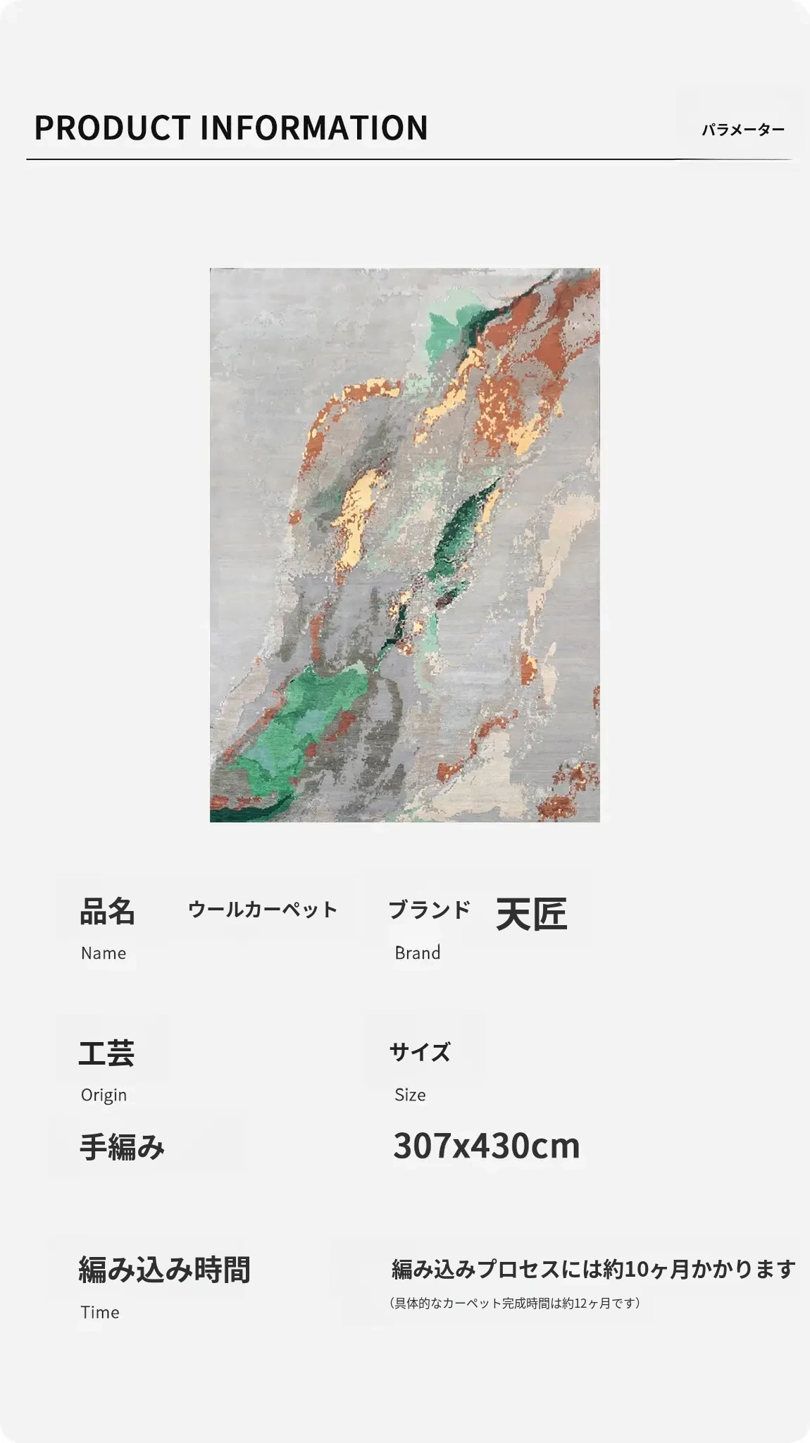 天匠の手織りウールカーペット - ソファやテーブルにぴったり!307x430cmの広々としたサイズで、リビングや書斎を優雅に彩ります。高品質な素材で、温かみのある空間を演出。あなたのスタイルにぴったりの一枚を!
