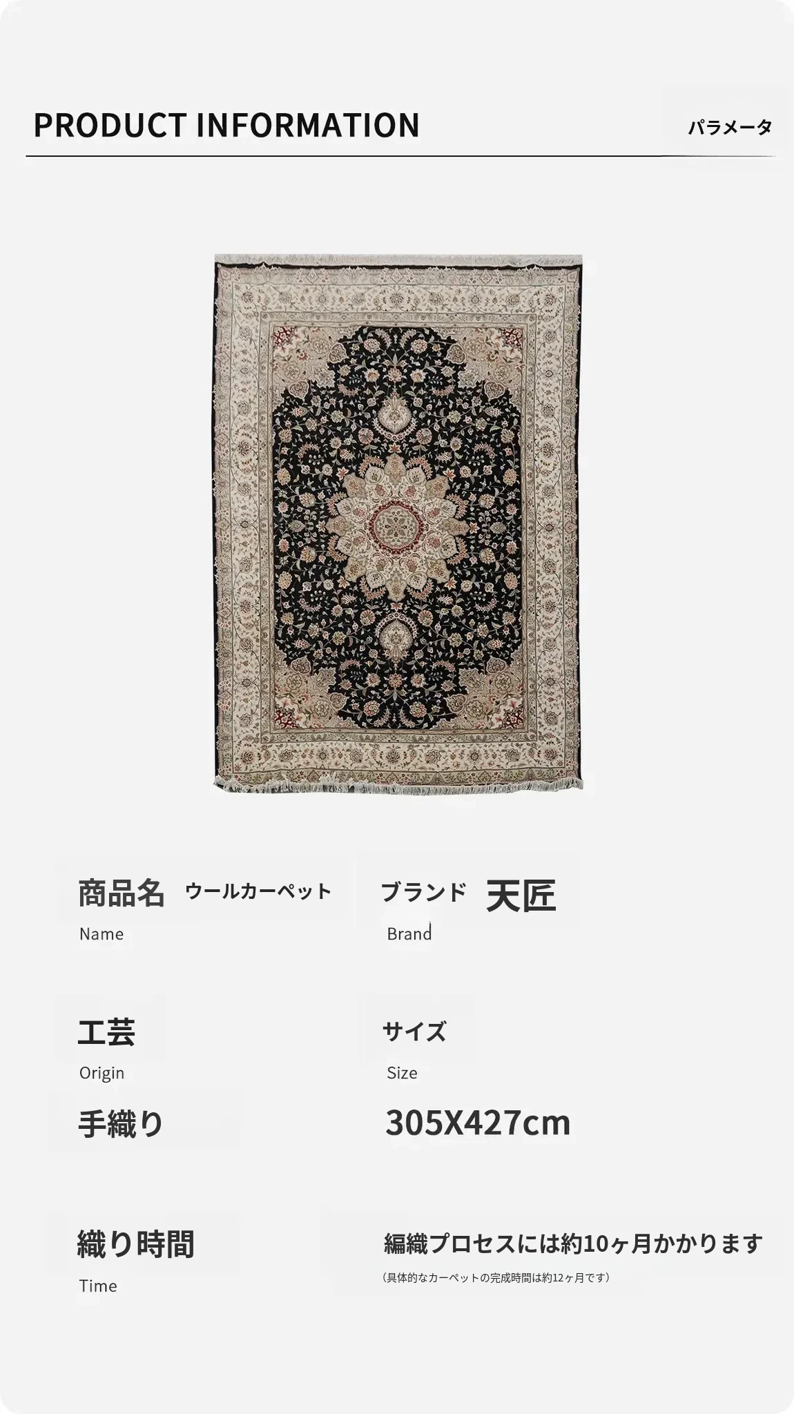 天匠の手作りウールカーペット - ペルシャスタイルの豪華なリビングルームに最適!305x427cmの大サイズで、耐汚れ性能も抜群。おしゃれで機能的な空間を演出します!