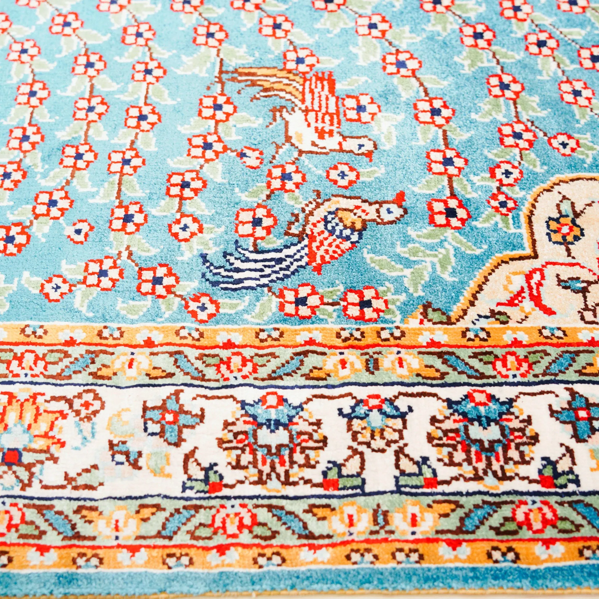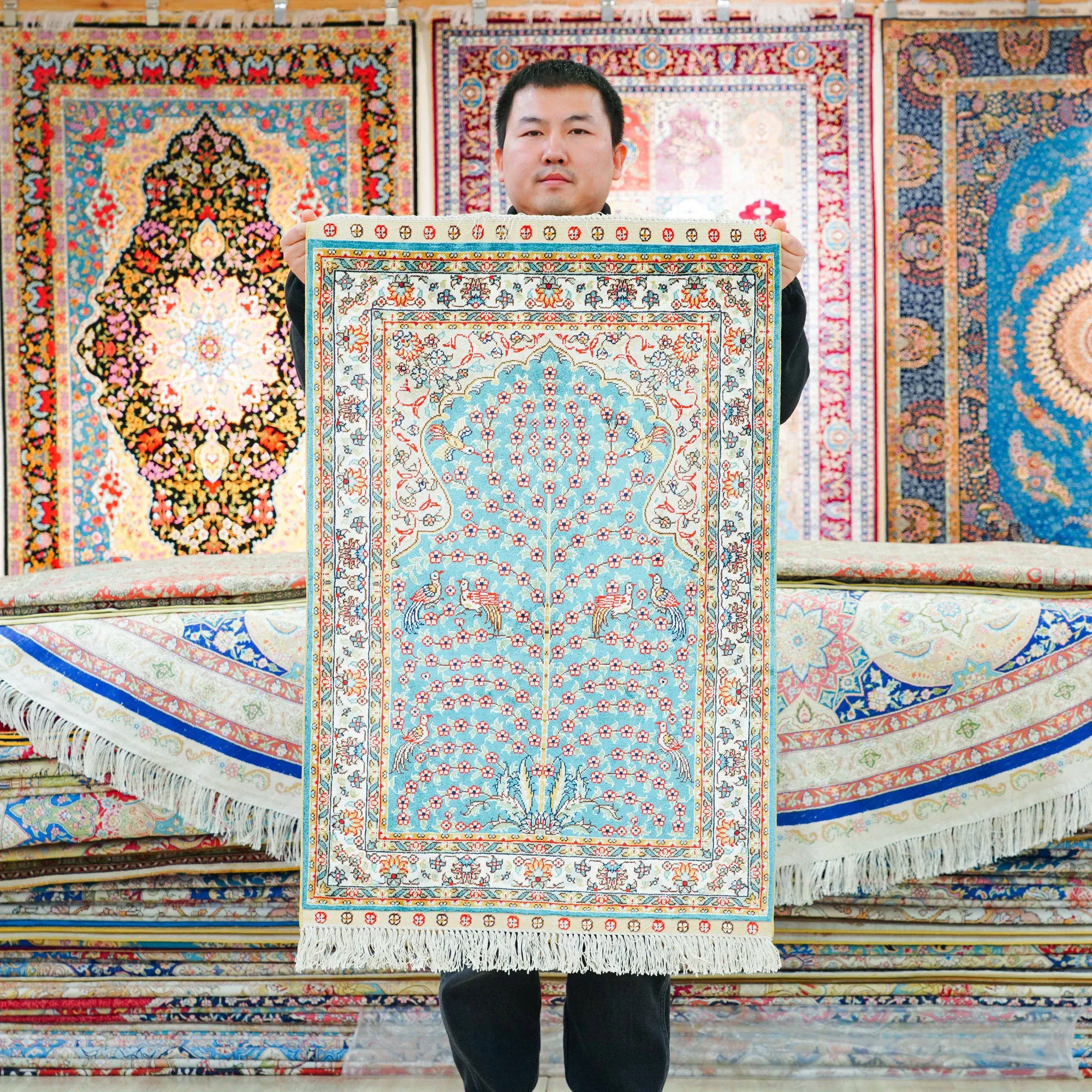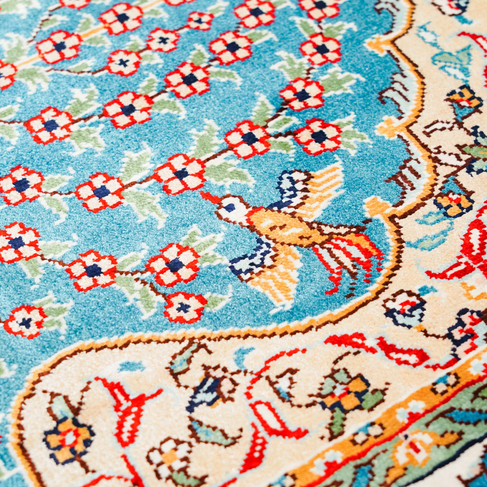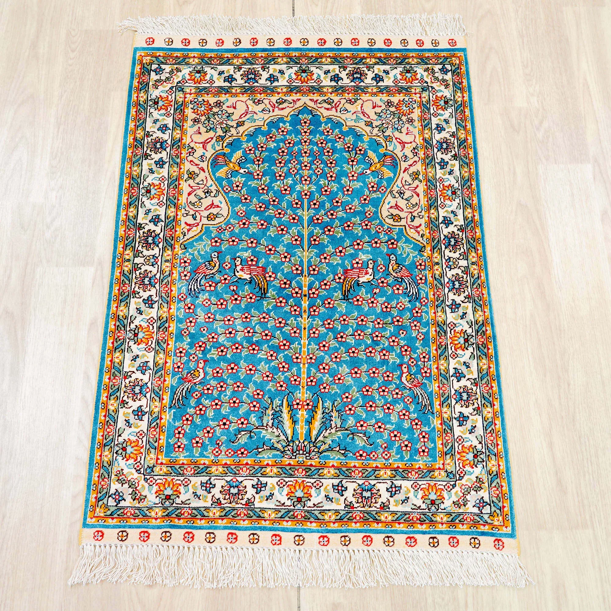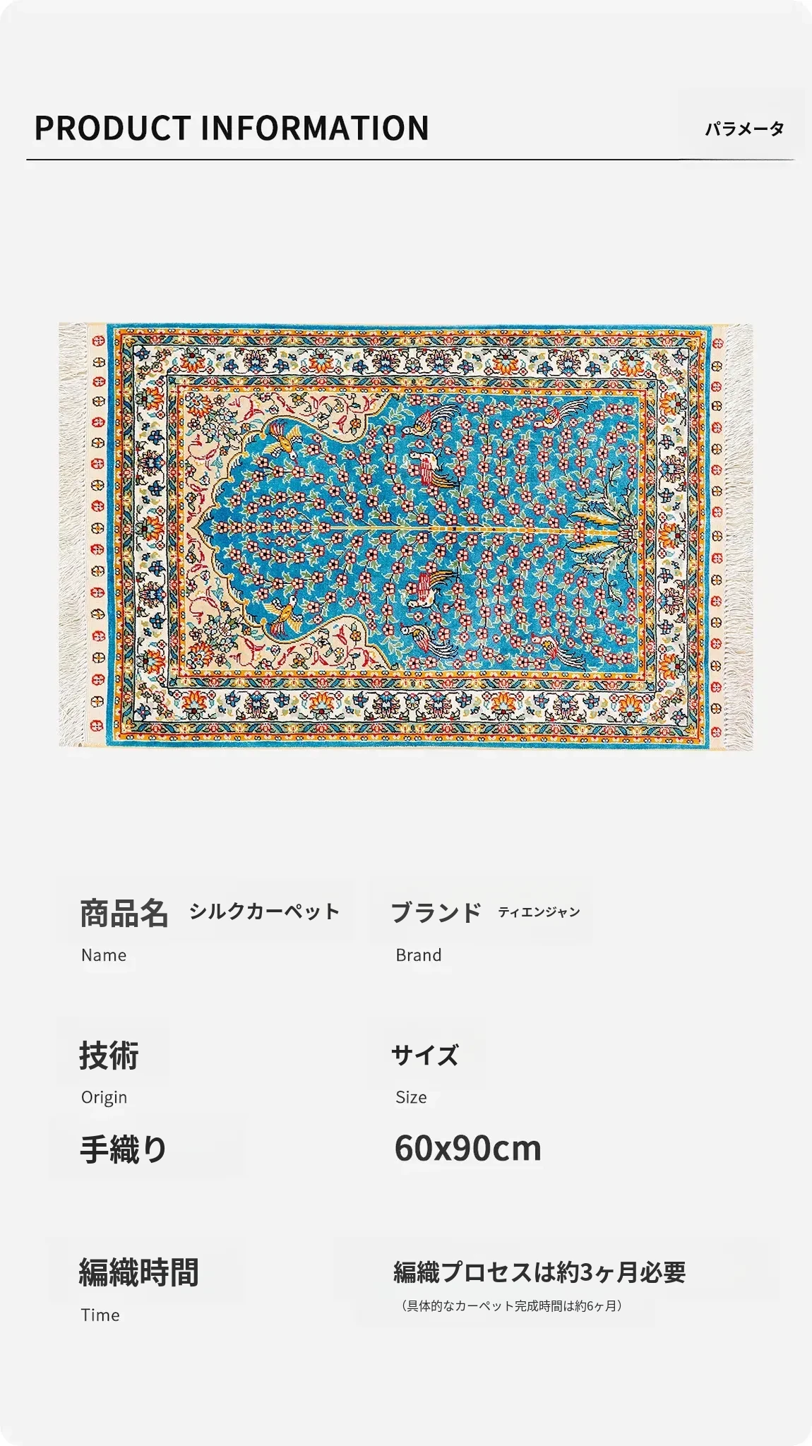天匠の手作りシルクカーペット - 美しい青のペルシャデザイン、結び目編みの欧米スタイルタペストリー (60x90cm) - お部屋を優雅に彩る高級感溢れる逸品!