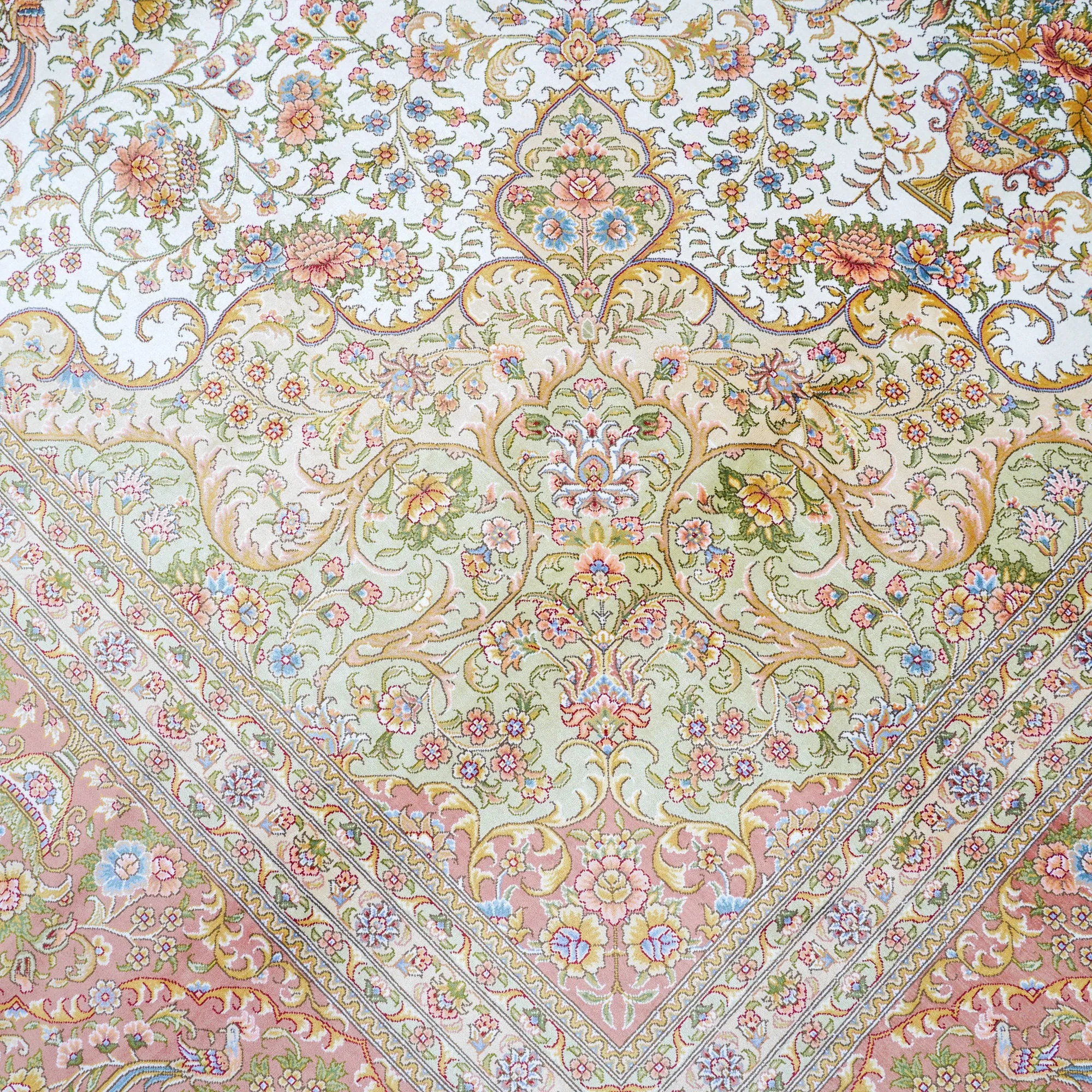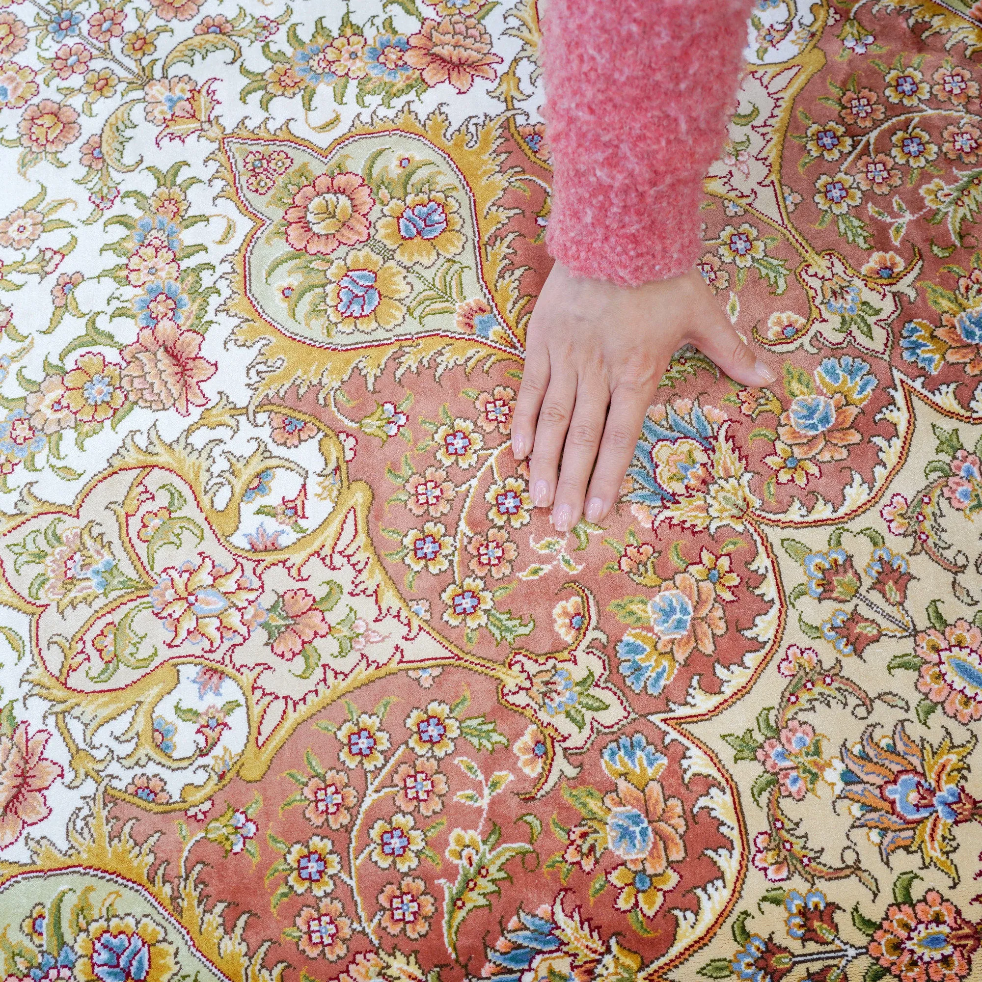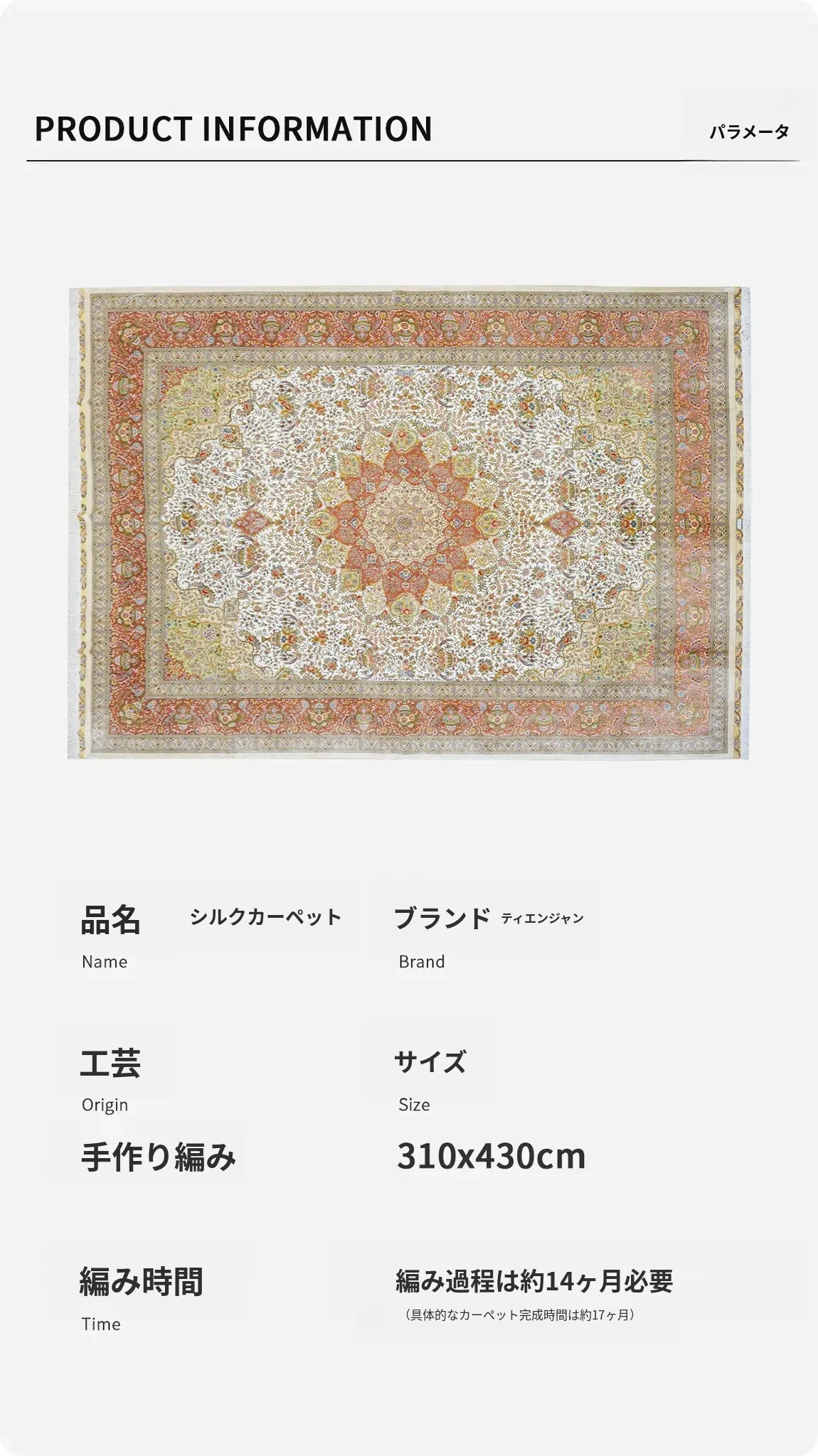 天匠手作の本物シルクカーペット - 南陽産、トルコ輸出向け、310x430cmの贅沢な純シルクカーペットで、優雅さと温かみをお部屋に。高品質で手触り抜群、特別な空間を演出します!