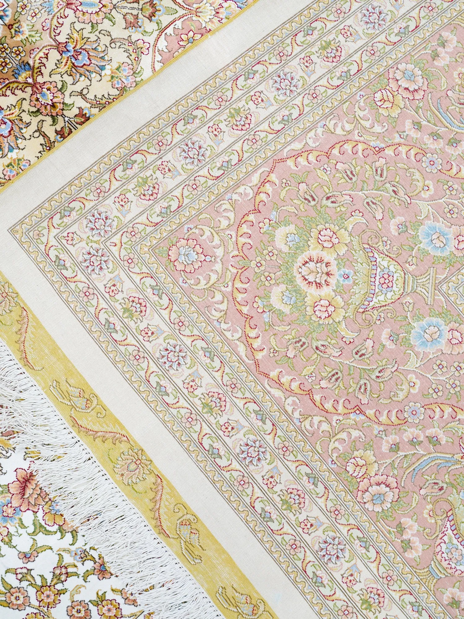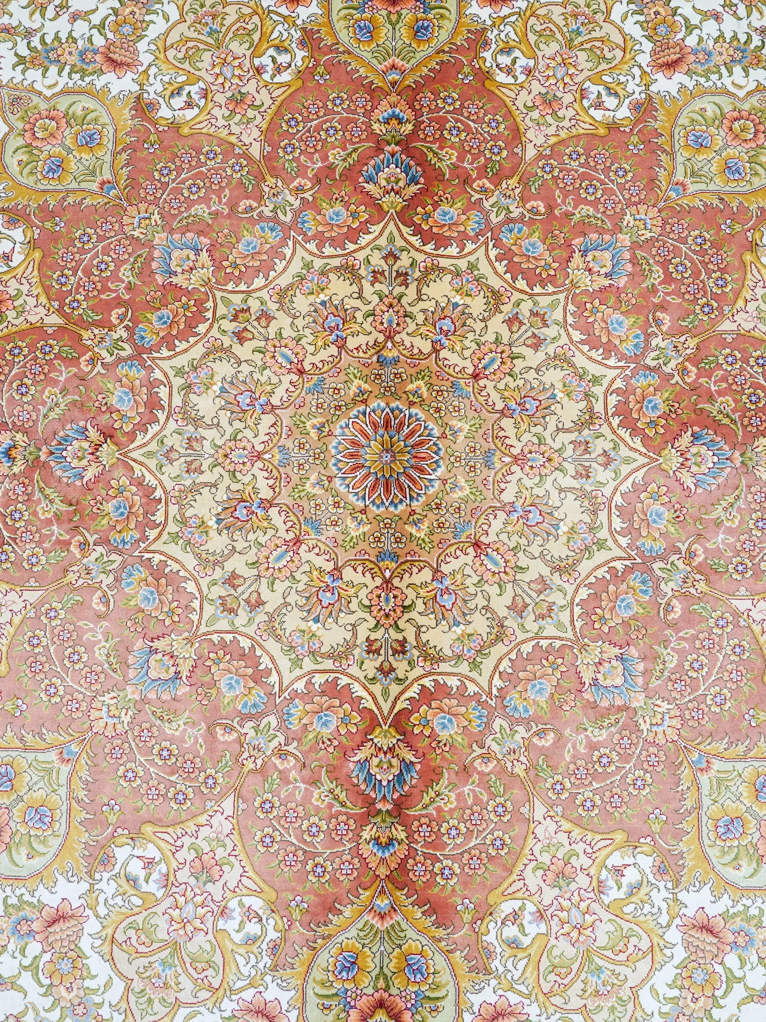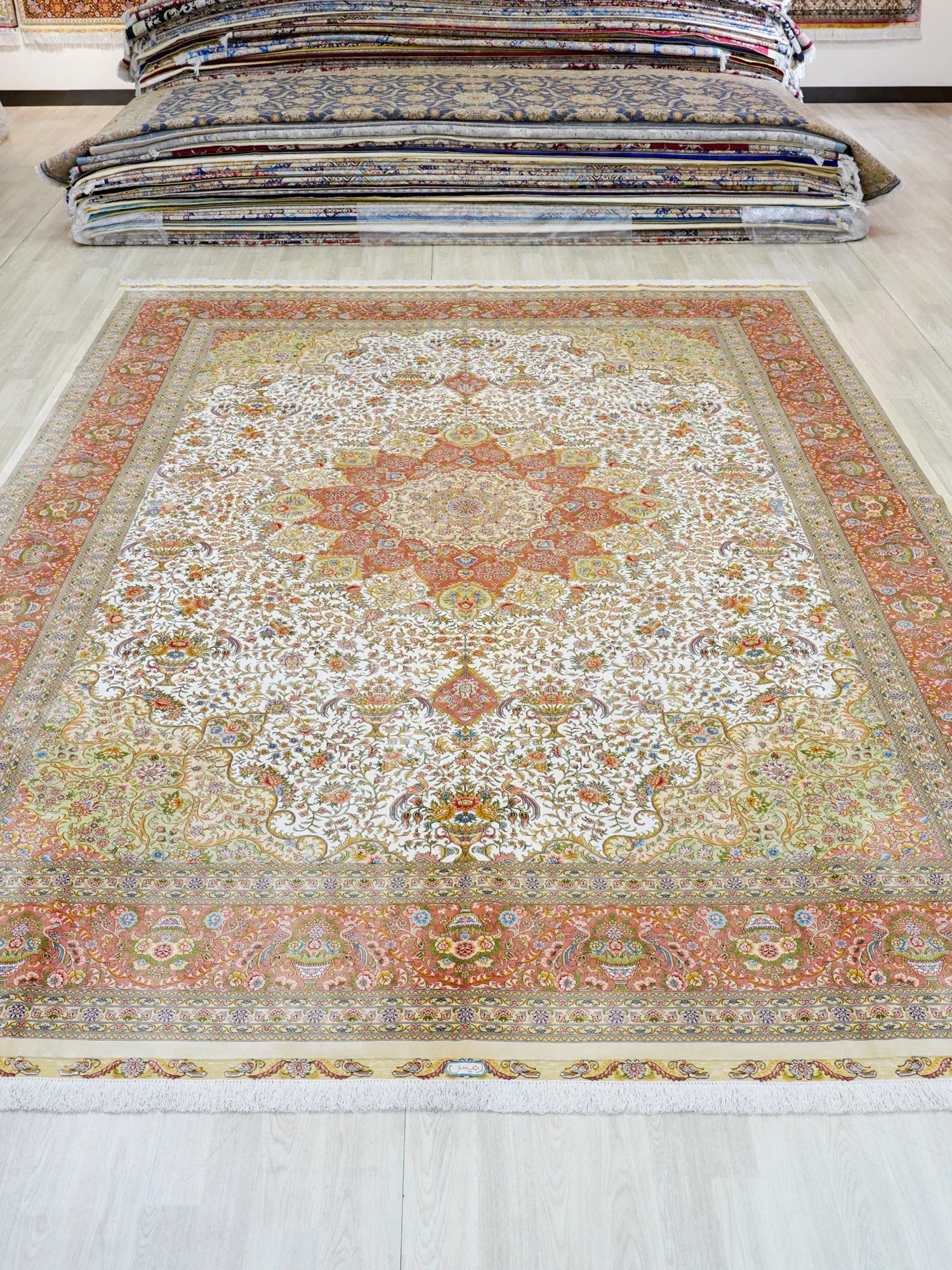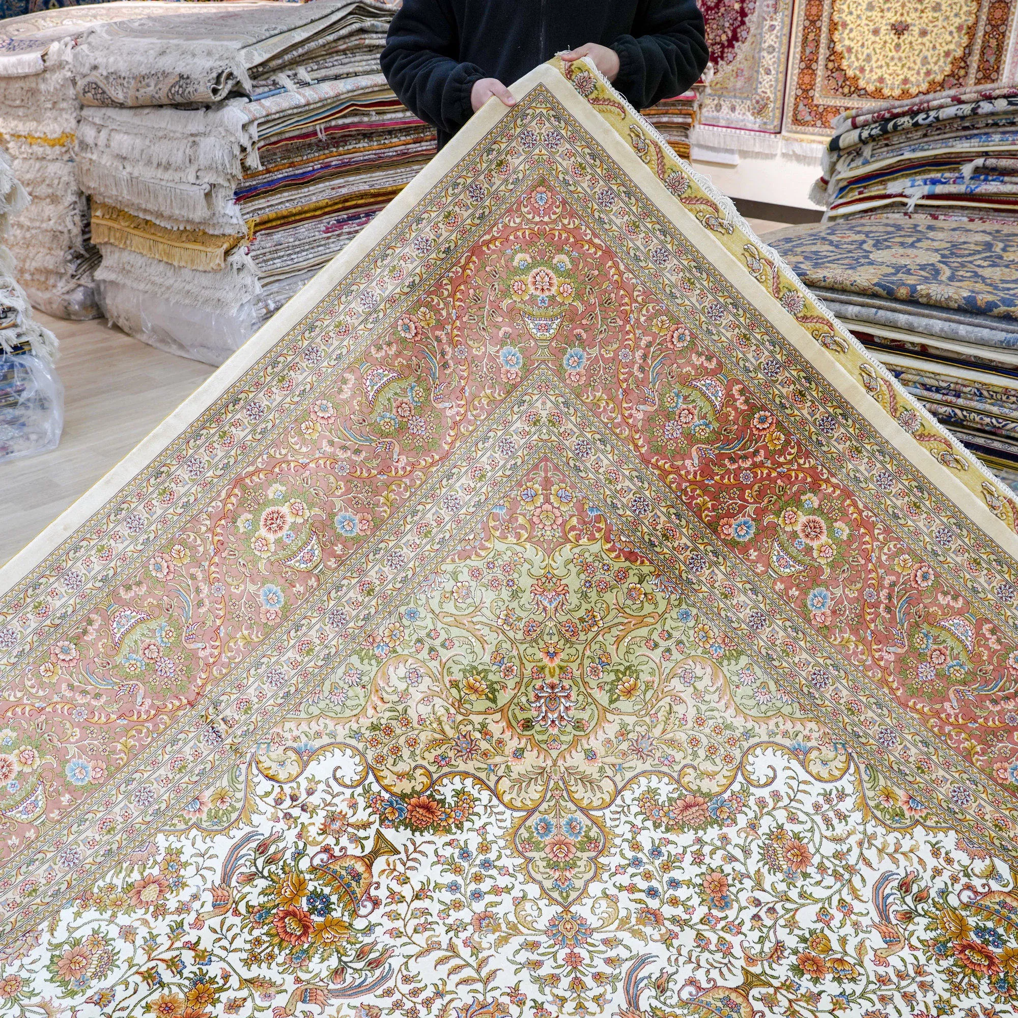 天匠手作の本物シルクカーペット - 南陽産、トルコ輸出向け、310x430cmの贅沢な純シルクカーペットで、優雅さと温かみをお部屋に。高品質で手触り抜群、特別な空間を演出します!