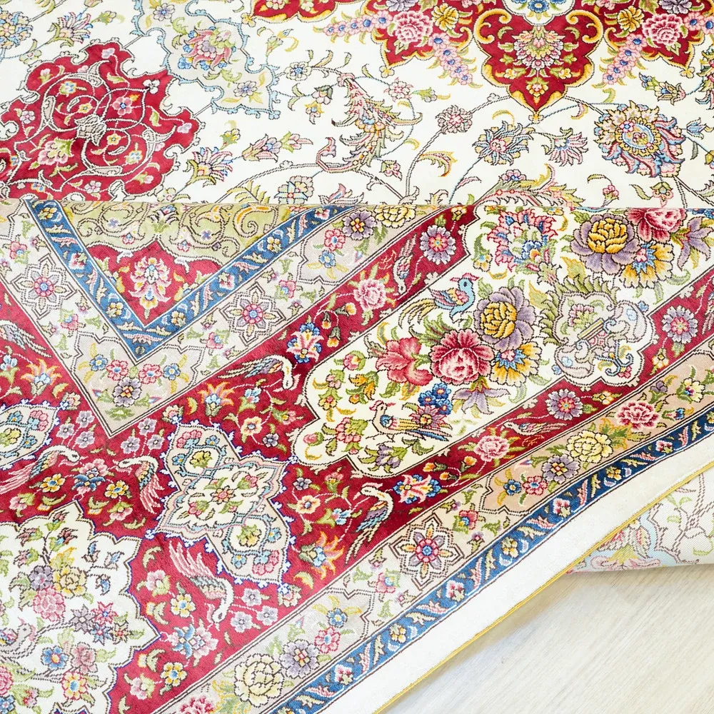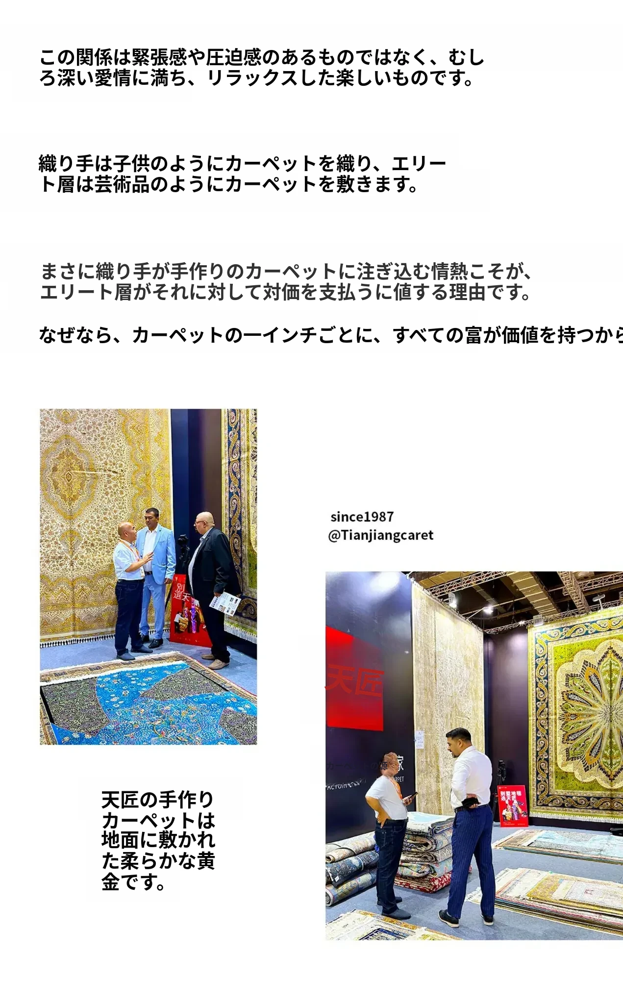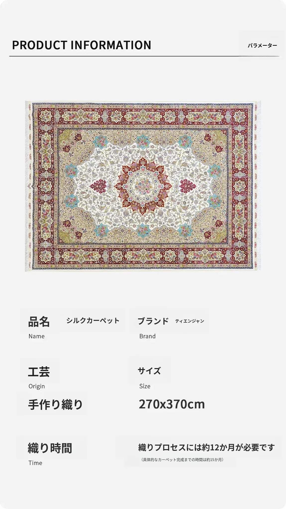 天匠の手作りシルクカーペット - 寝室やリビングにぴったりの270x370cmの贅沢な絹のラグ。高級感あふれるデザインで、あなたの空間を華やかに演出します。手触りも抜群で、心地よいひとときを提供します。