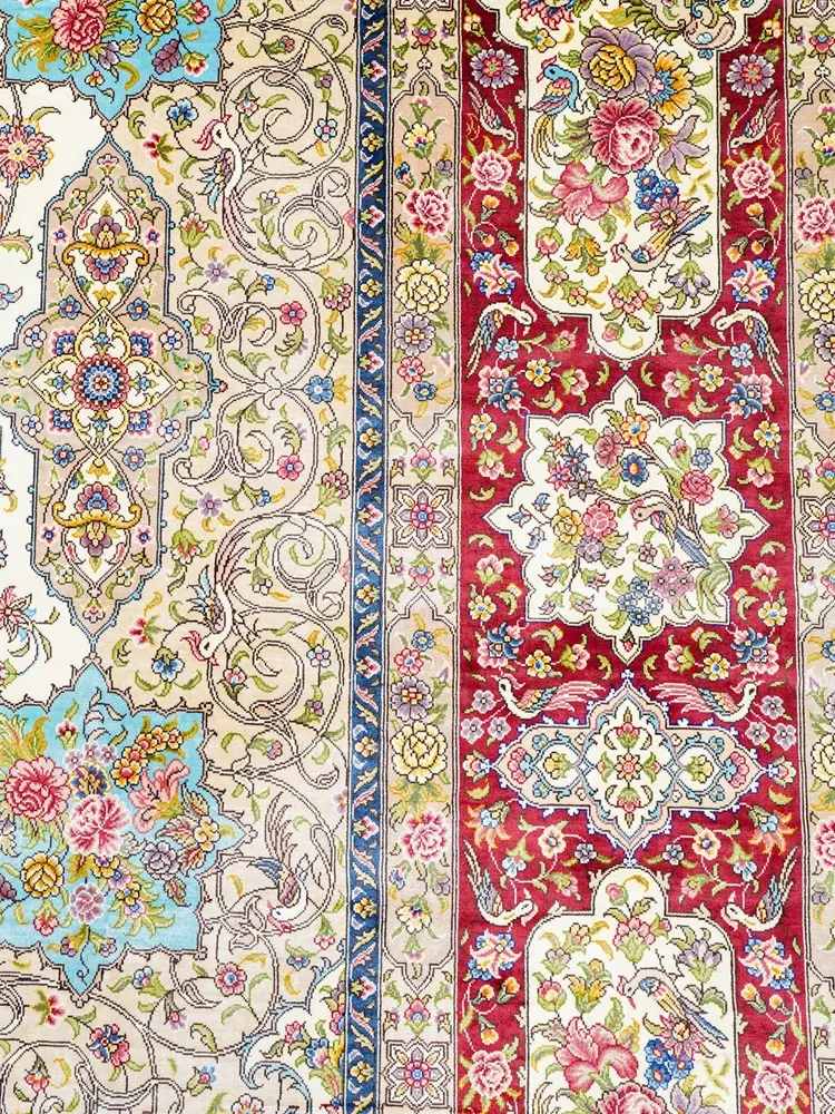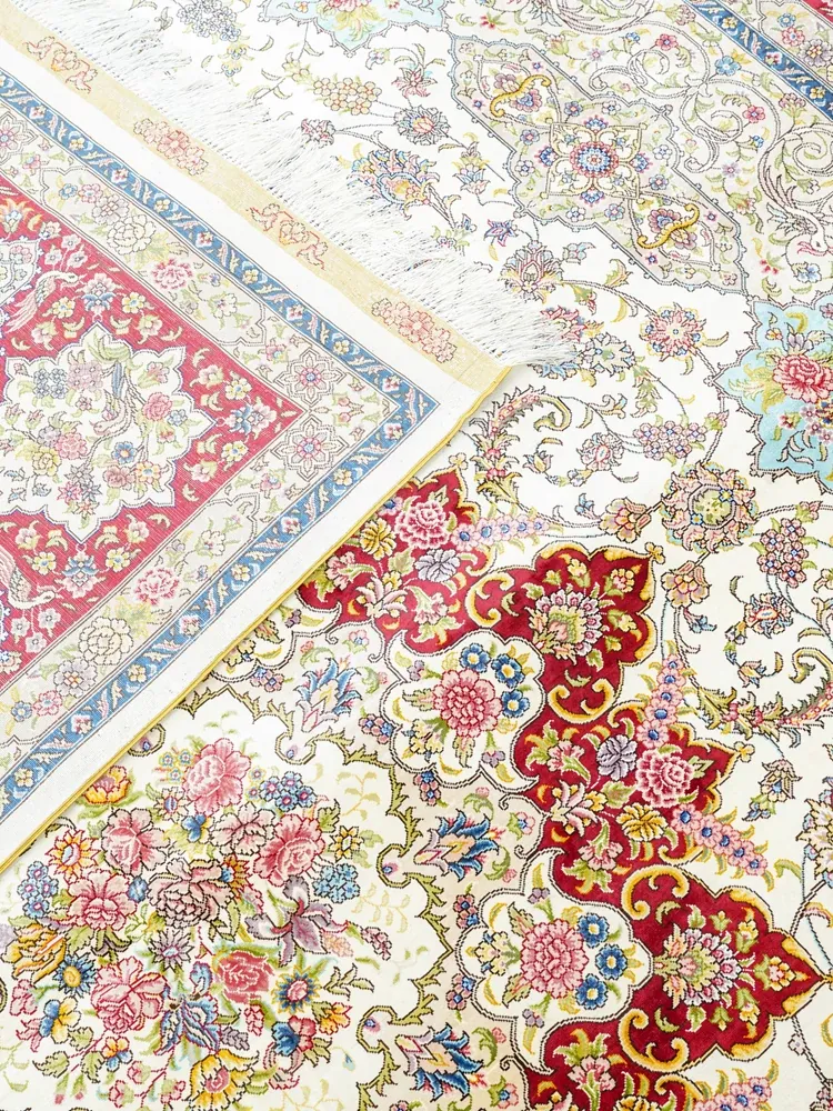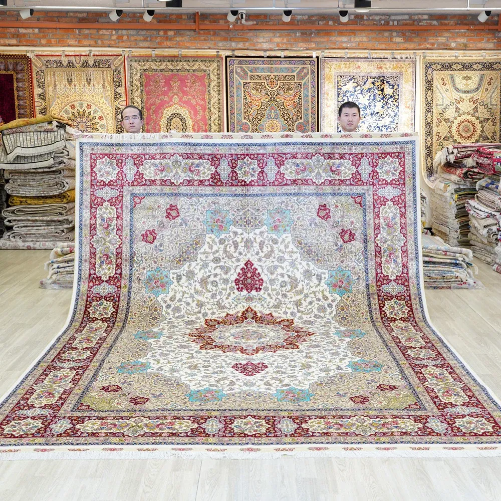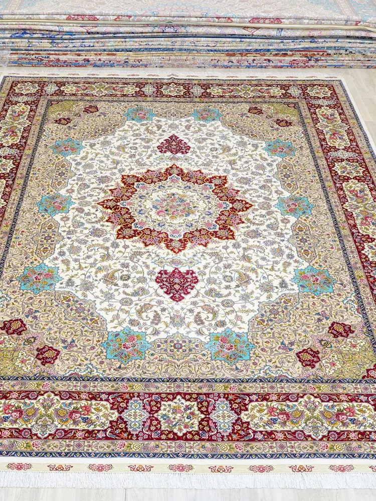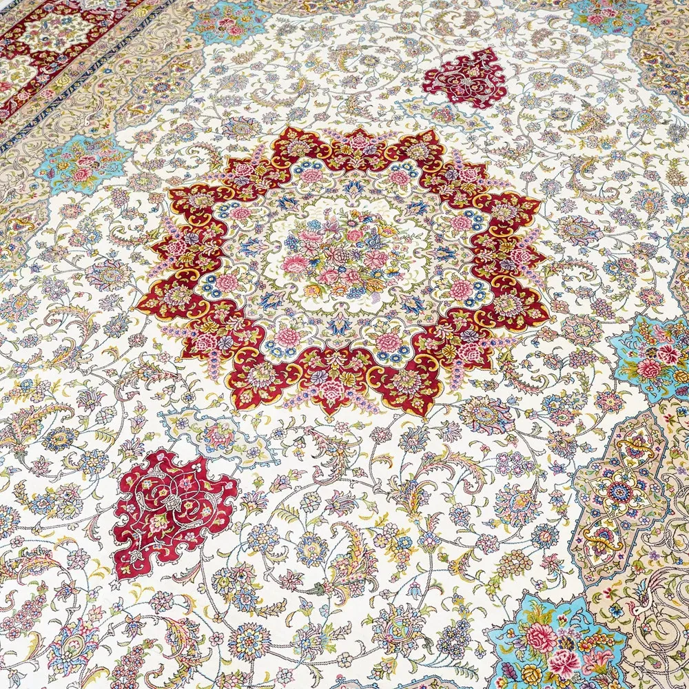天匠の手作りシルクカーペット - 寝室やリビングにぴったりの270x370cmの贅沢な絹のラグ。高級感あふれるデザインで、あなたの空間を華やかに演出します。手触りも抜群で、心地よいひとときを提供します。