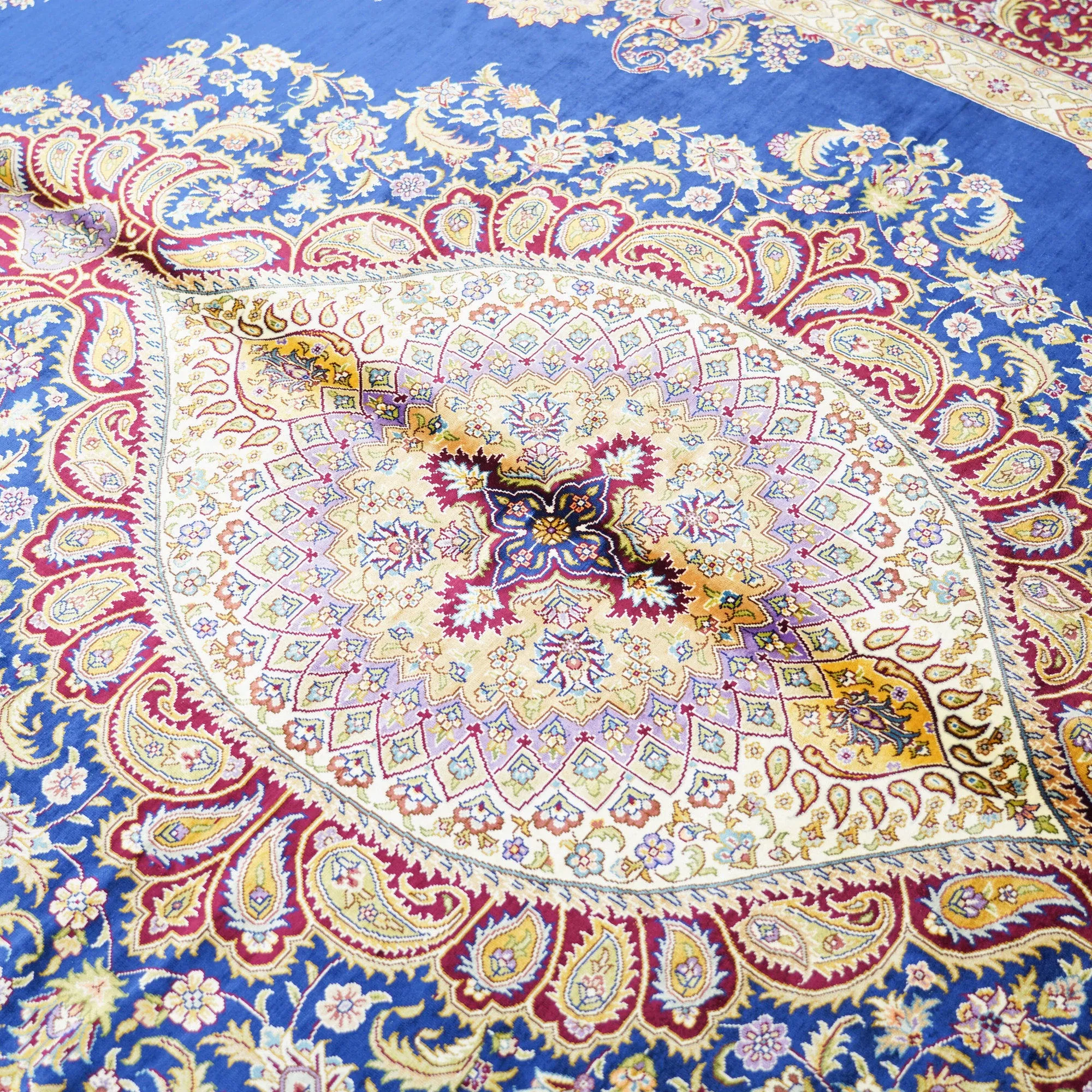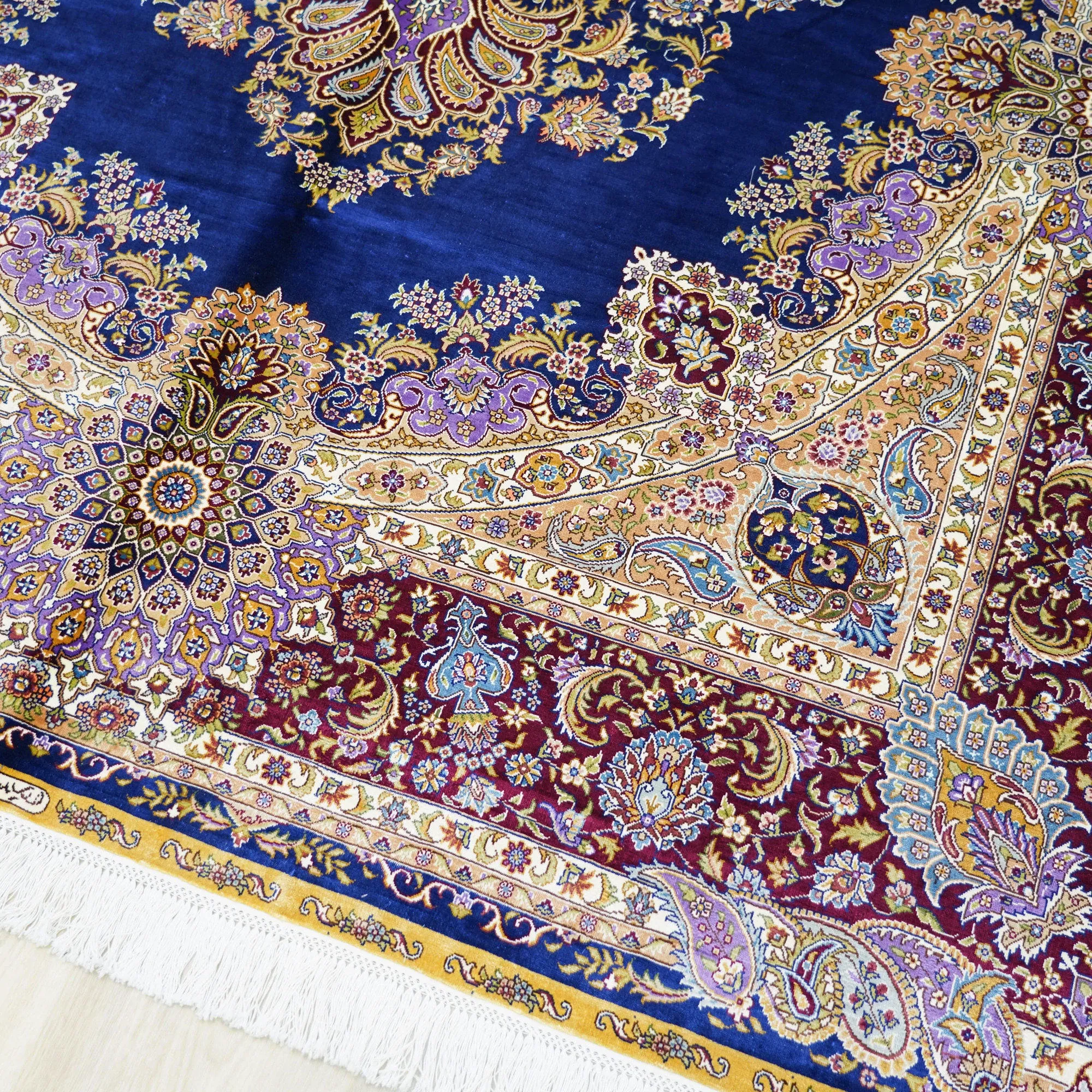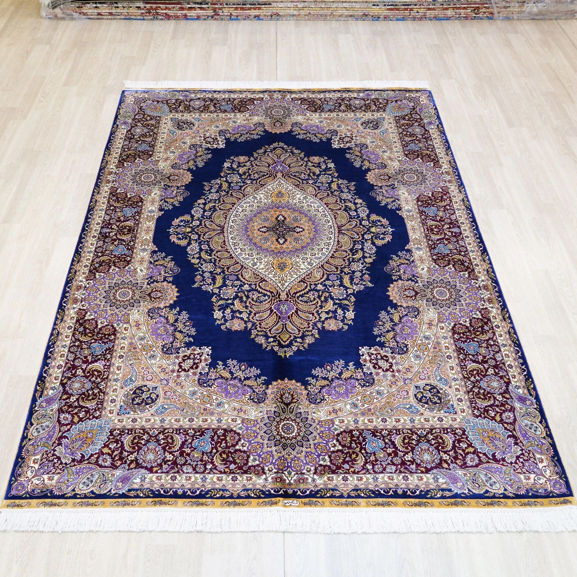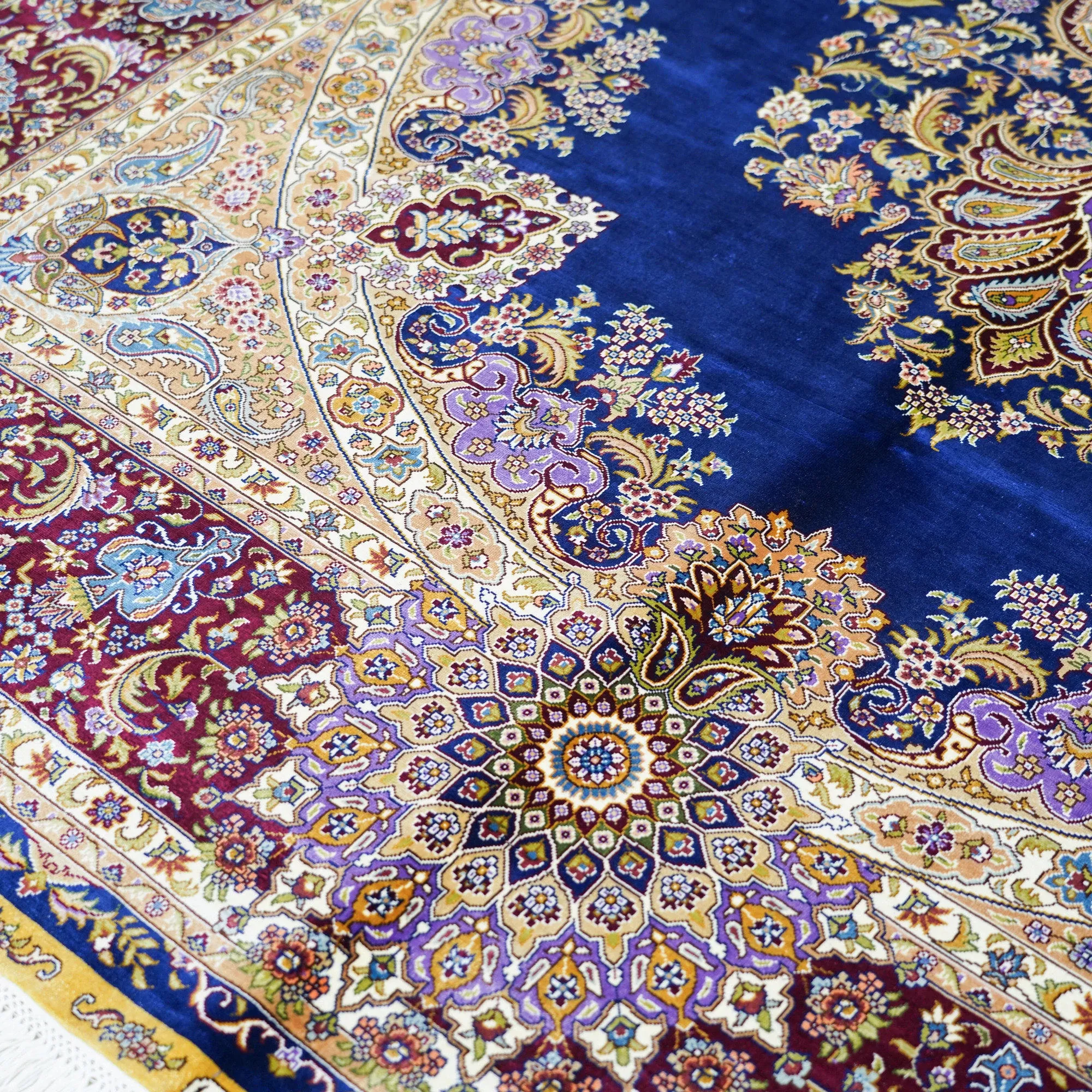 天匠の手作りシルクカーペット - クラシックなブルーのペルシャ絨毯、欧米向け高級仕様!180x270cmの贅沢なサイズで、あなたの空間に優雅さをプラス!