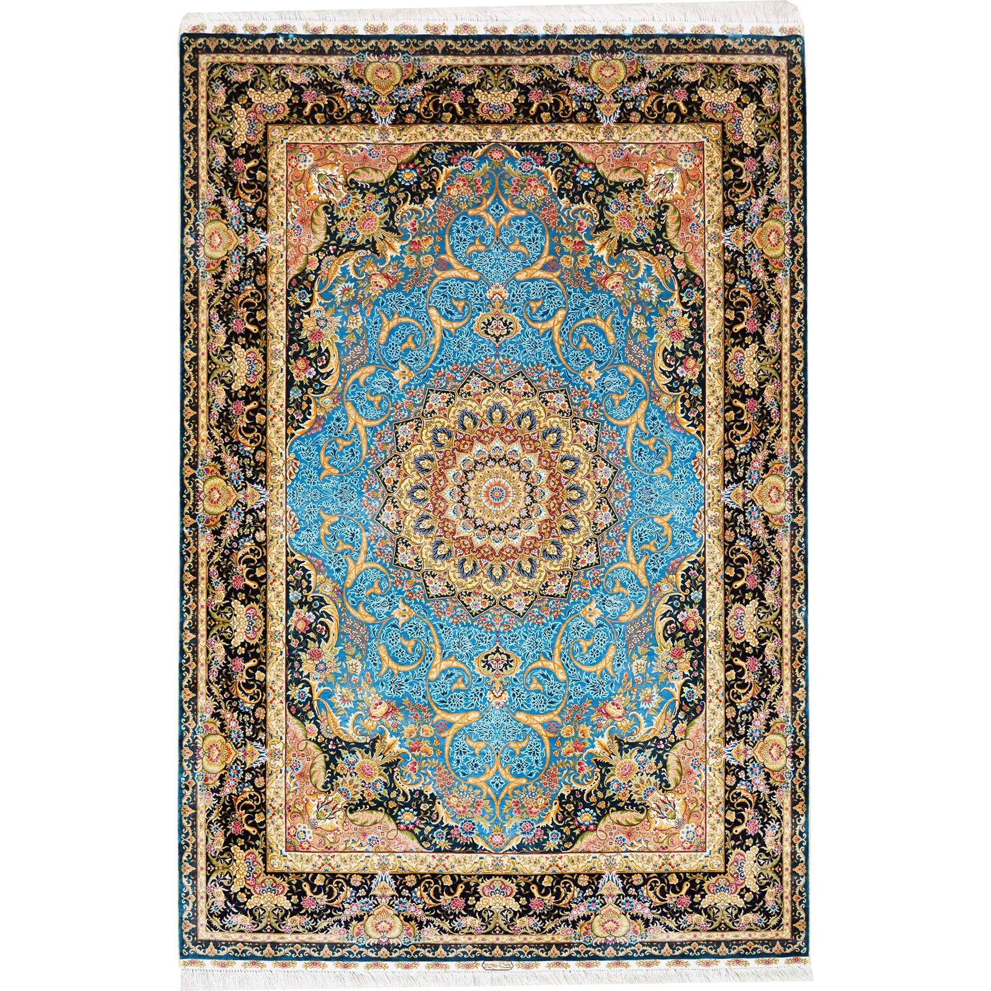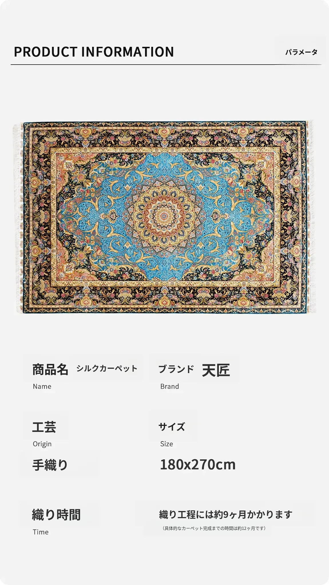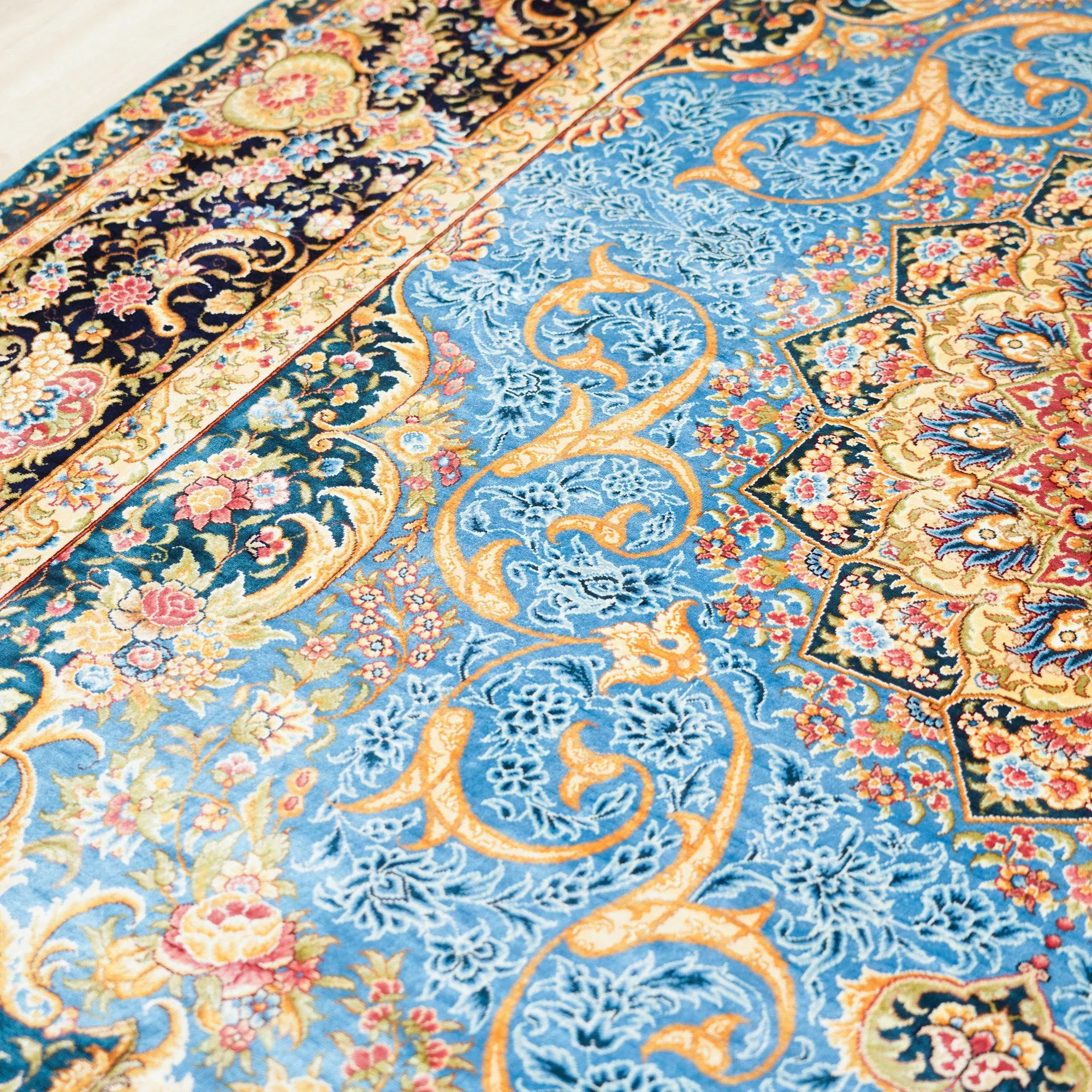 天匠の本物シルクラグ、天青色の手作りペルシャ絨毯!欧米の別荘にぴったりな180x270cmの高級インテリアアイテム。贅沢な肌触りと美しいデザインで、あなたの空間を華やかに彩ります。