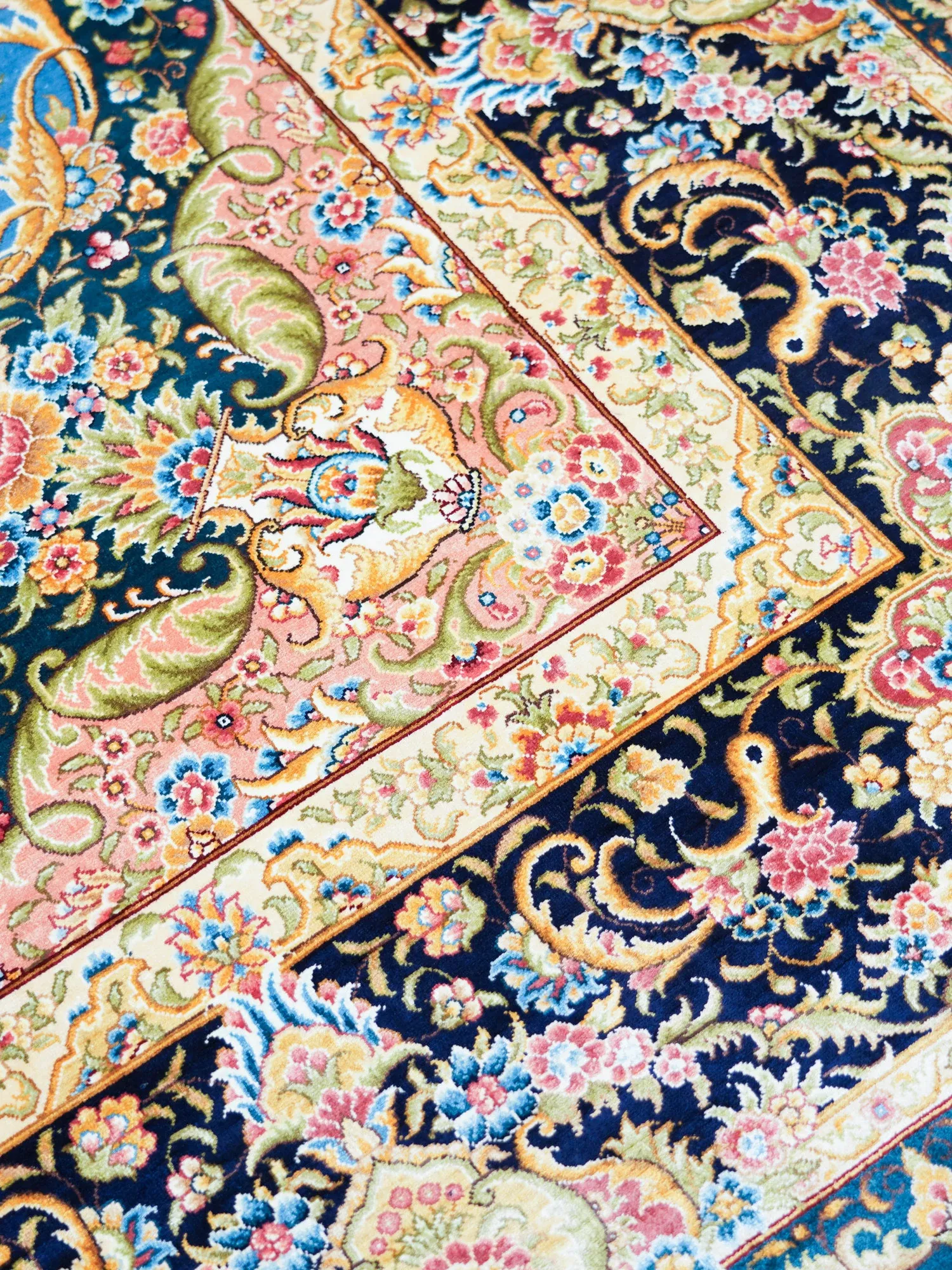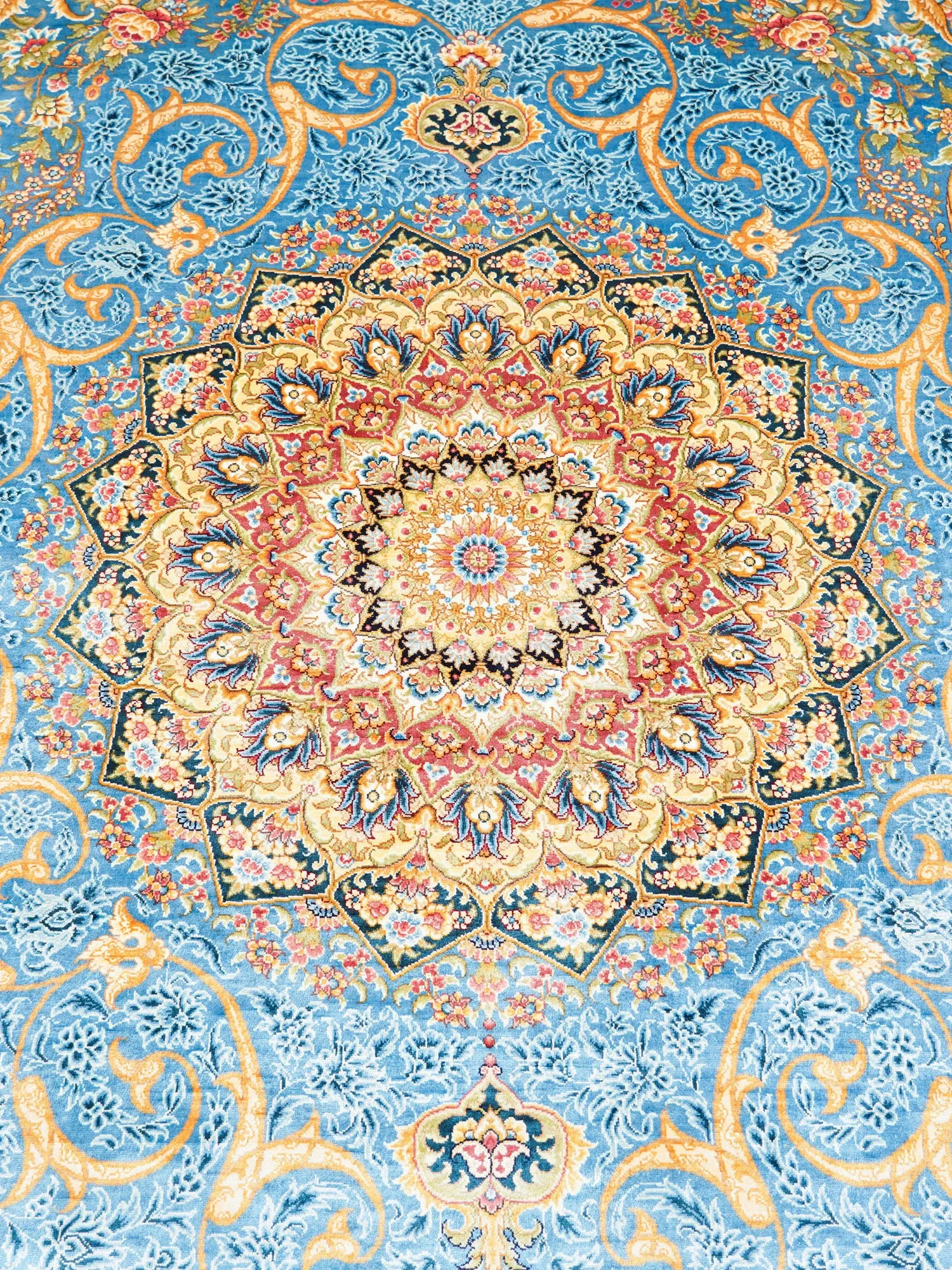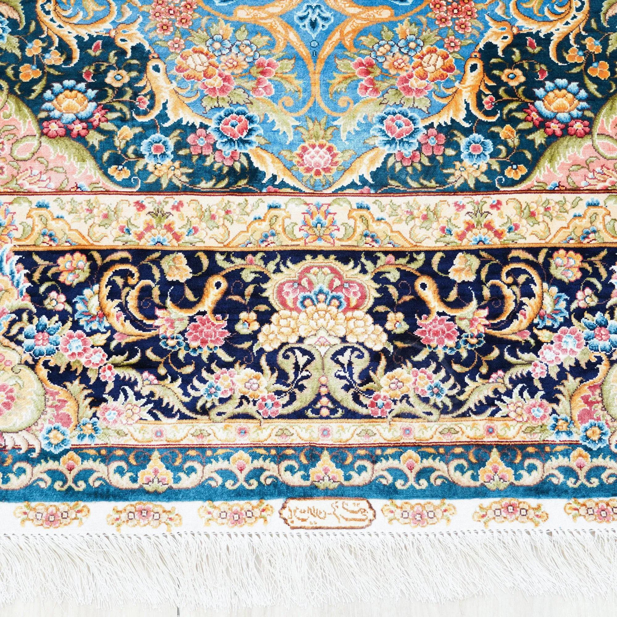 天匠の本物シルクラグ、天青色の手作りペルシャ絨毯!欧米の別荘にぴったりな180x270cmの高級インテリアアイテム。贅沢な肌触りと美しいデザインで、あなたの空間を華やかに彩ります。