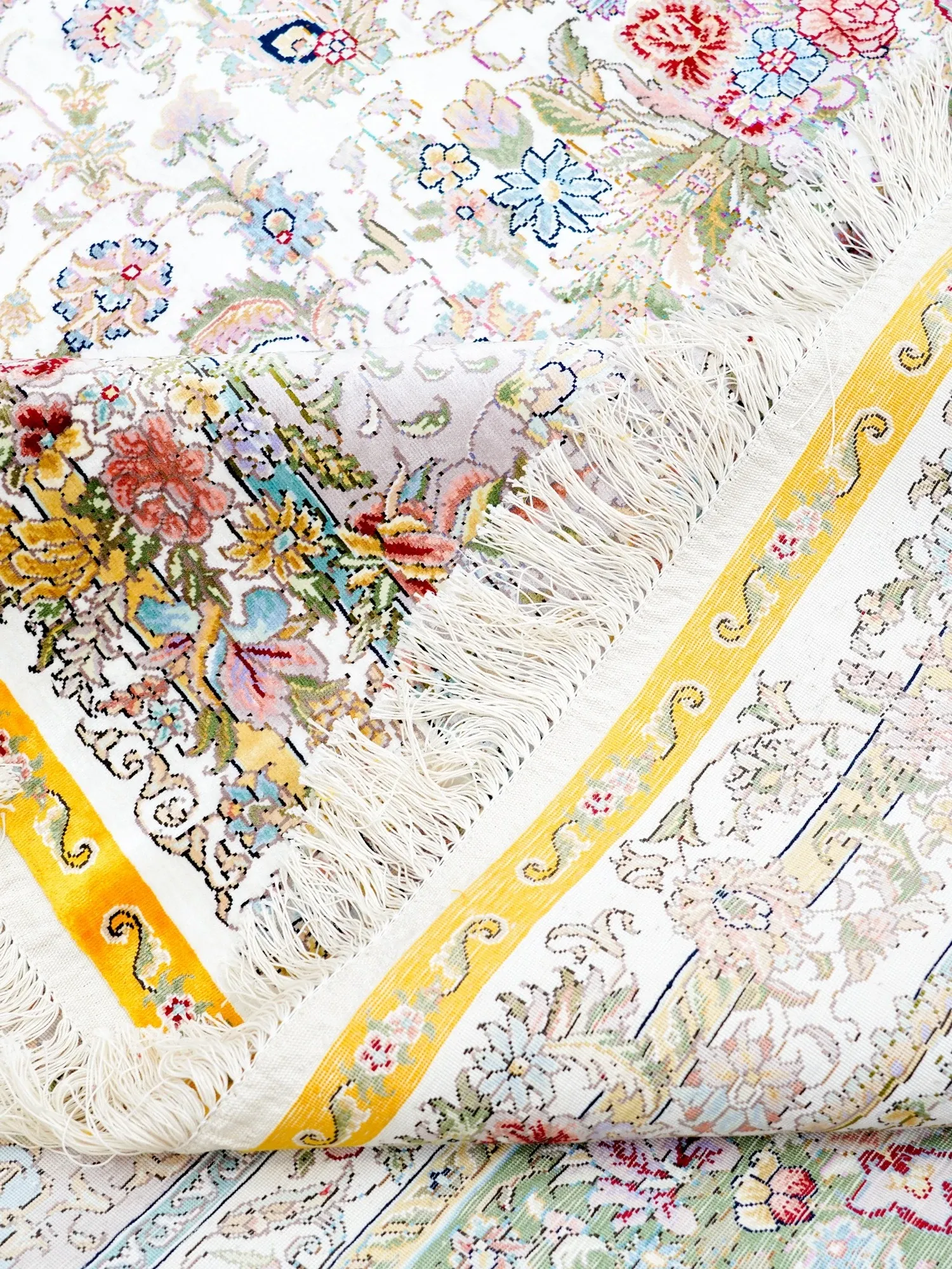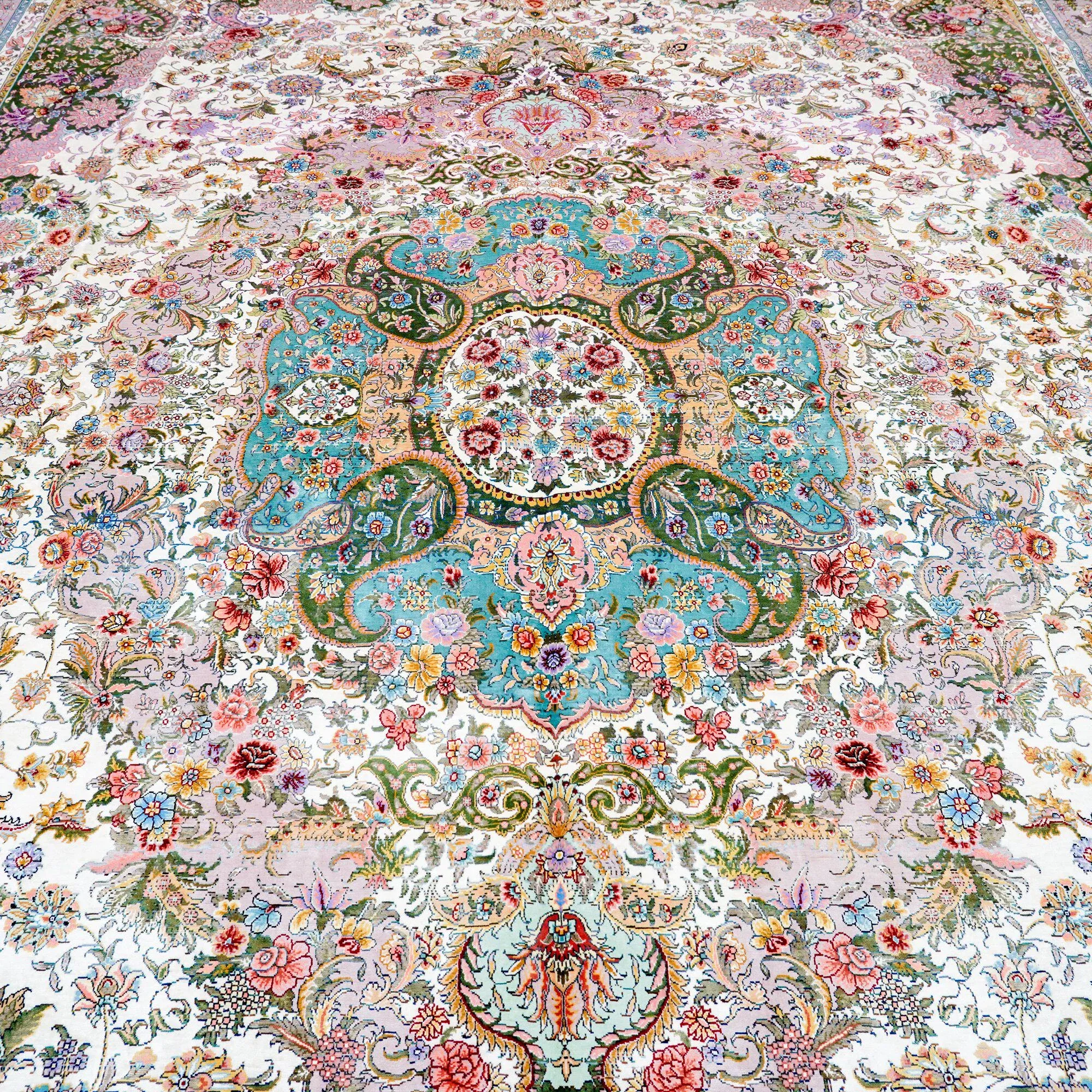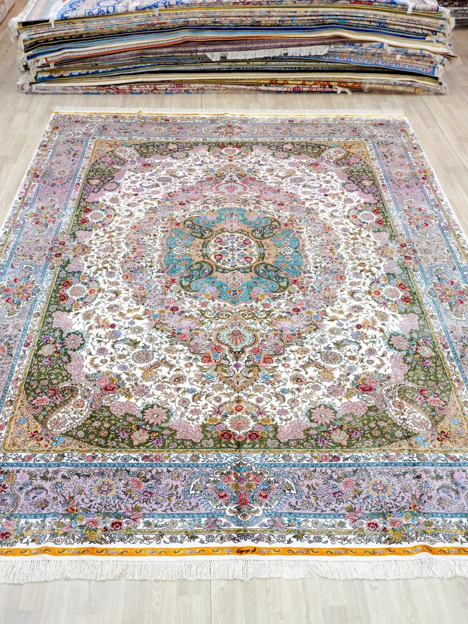天匠の手作りシルクカーペット - イラン製の高級ヴィラ向けアートカーペット、310x430cmの贅沢なサイズで、あなたの空間を華やかに彩ります!