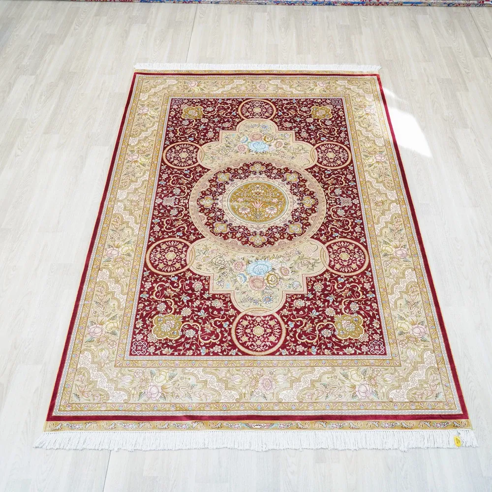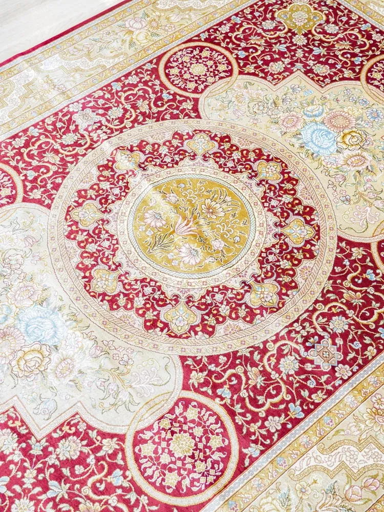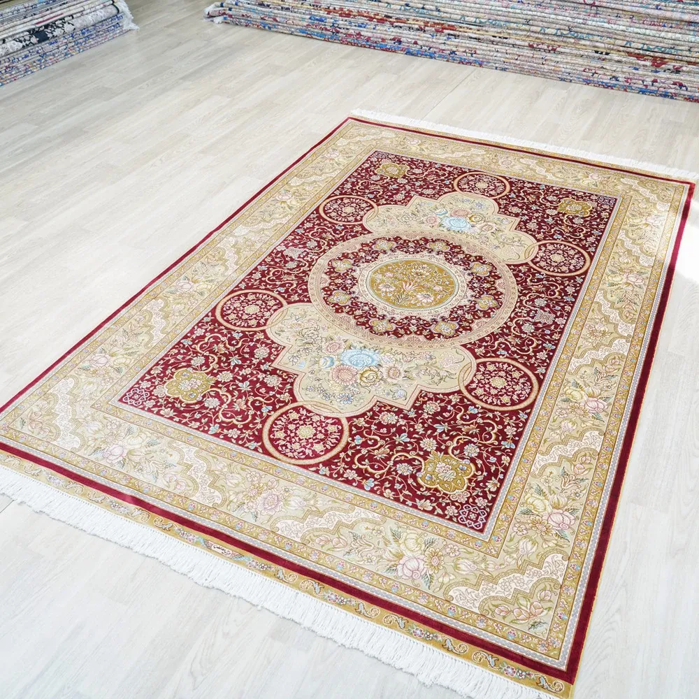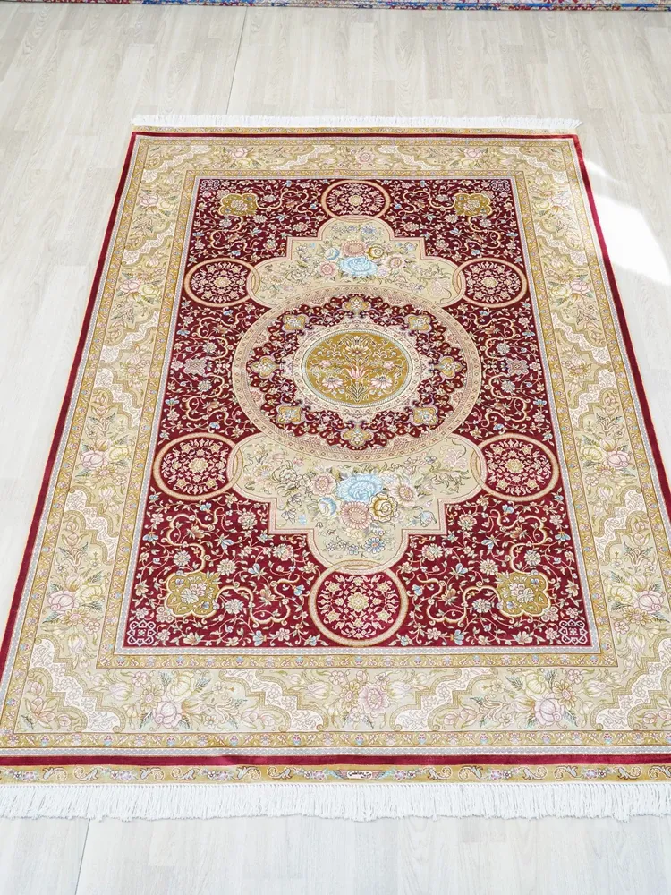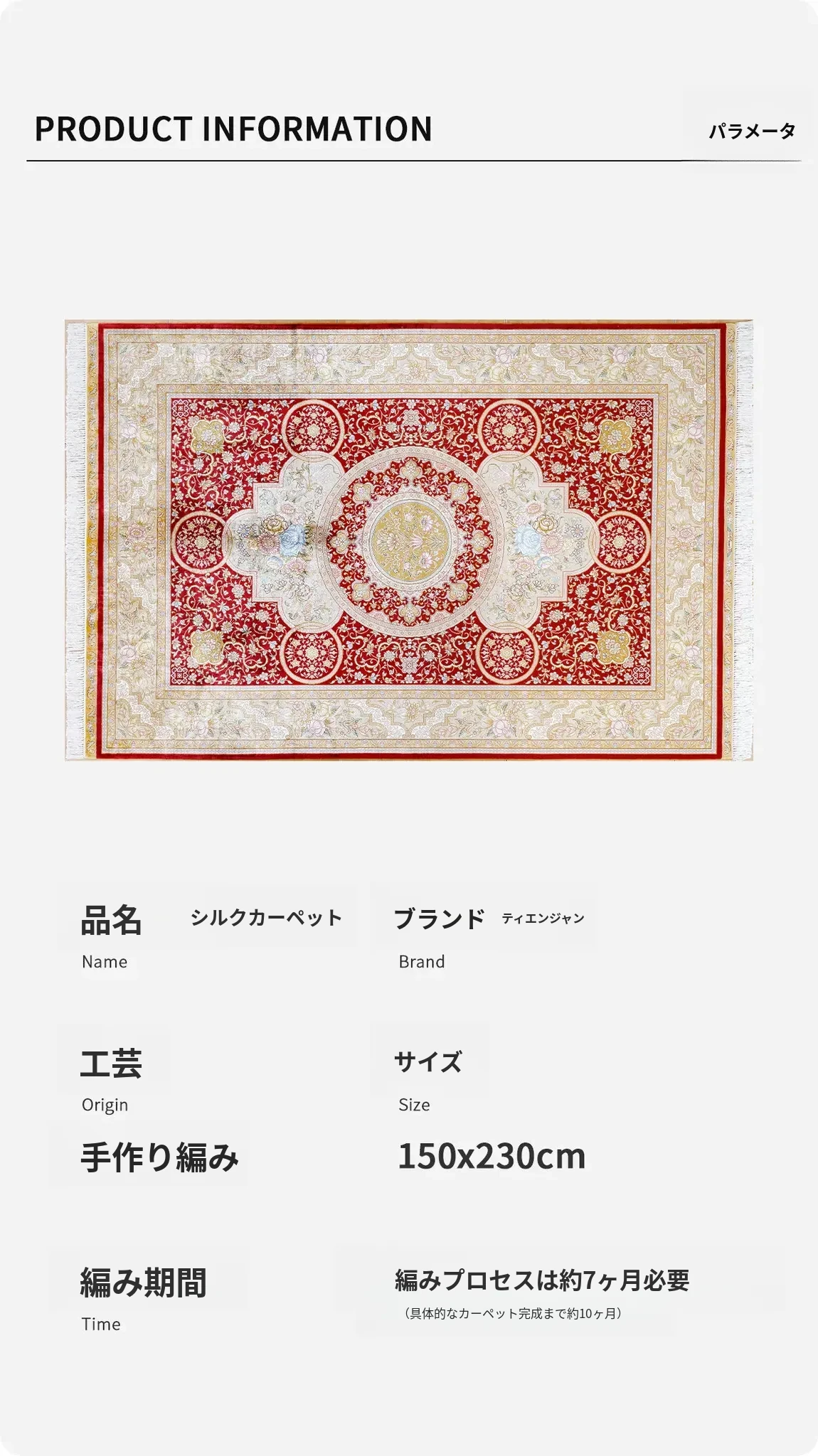 天匠の手作り本シルクカーペット - 鮮やかな赤色のペルシャ絨毯、リビングや寝室、書斎に最適!150x230cmのサイズで、高級感と温もりを演出します。あなたの空間を特別なものに変える一品です!