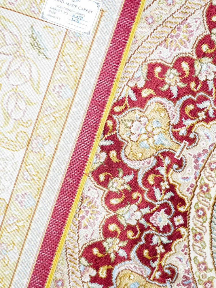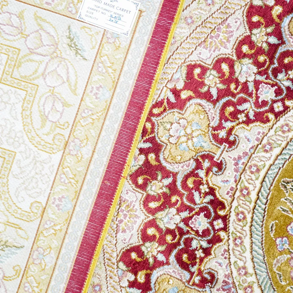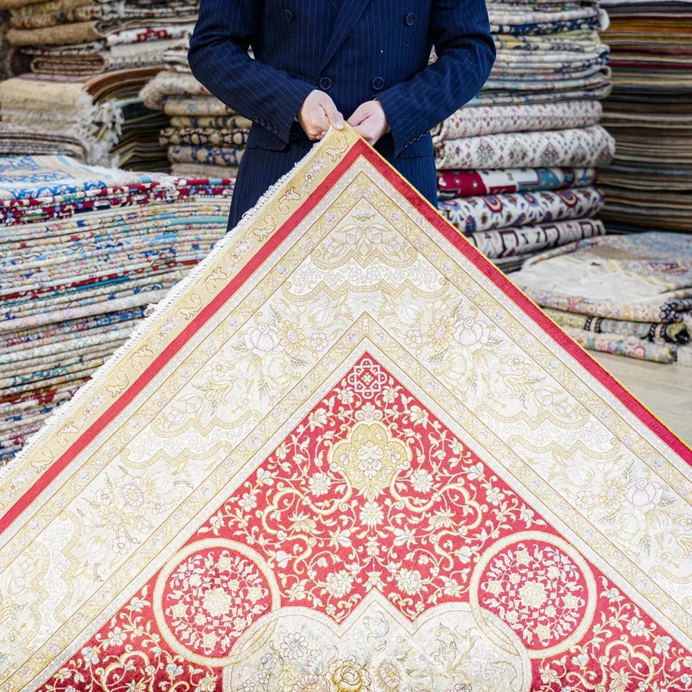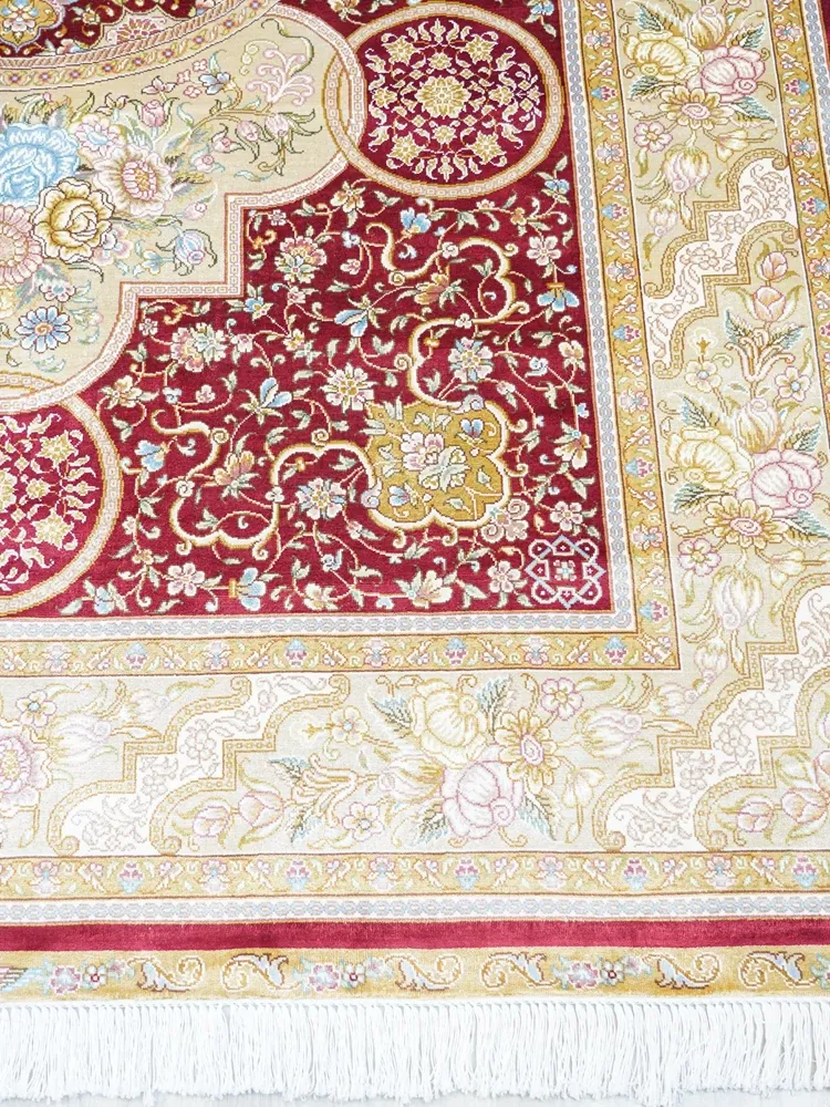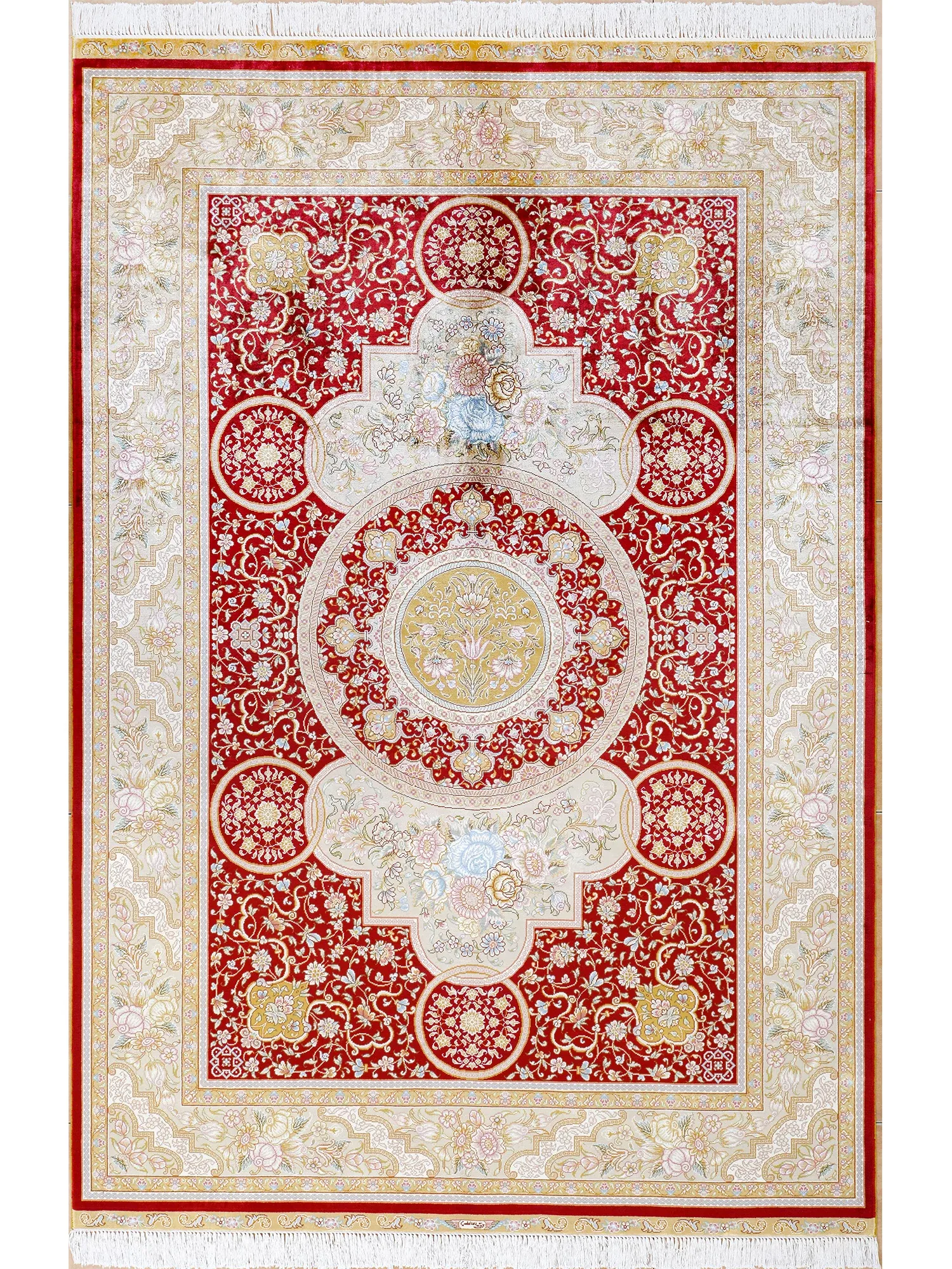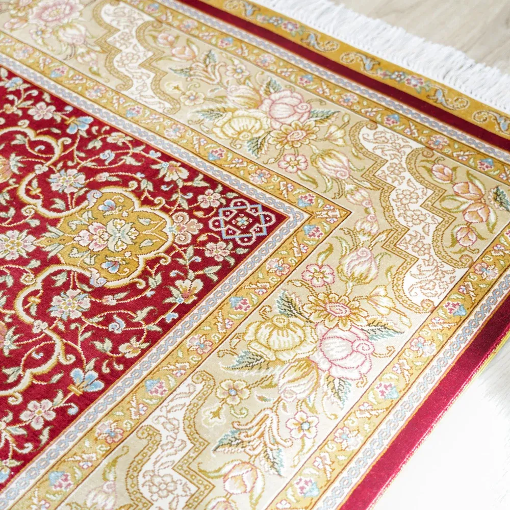 天匠の手作り本シルクカーペット - 鮮やかな赤色のペルシャ絨毯、リビングや寝室、書斎に最適!150x230cmのサイズで、高級感と温もりを演出します。あなたの空間を特別なものに変える一品です!