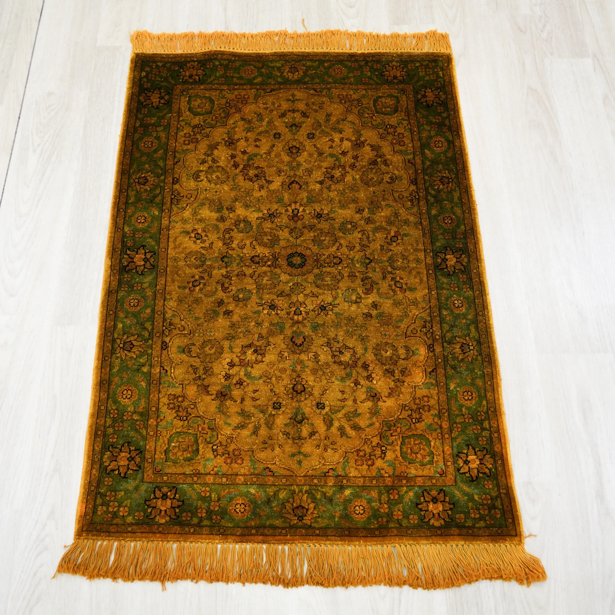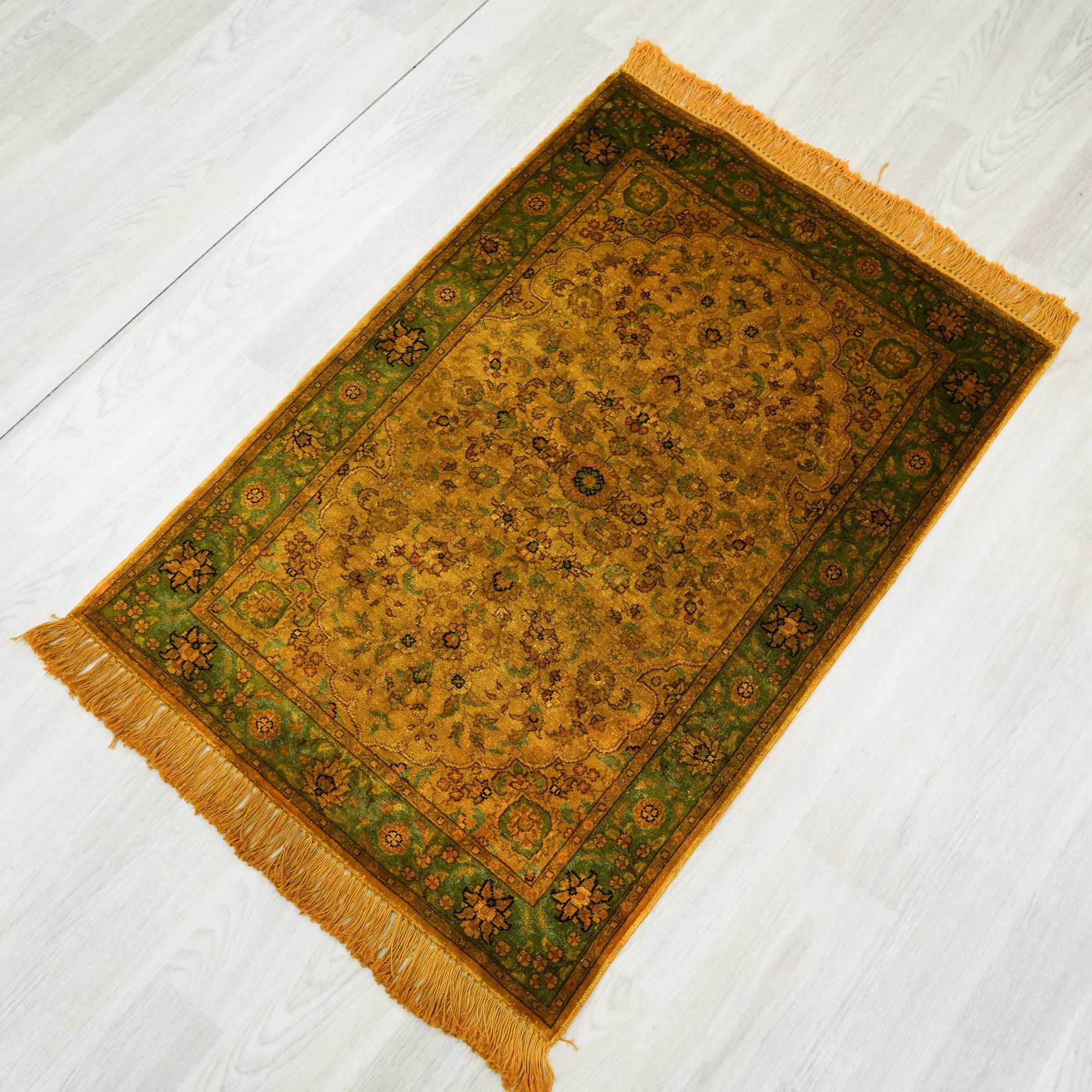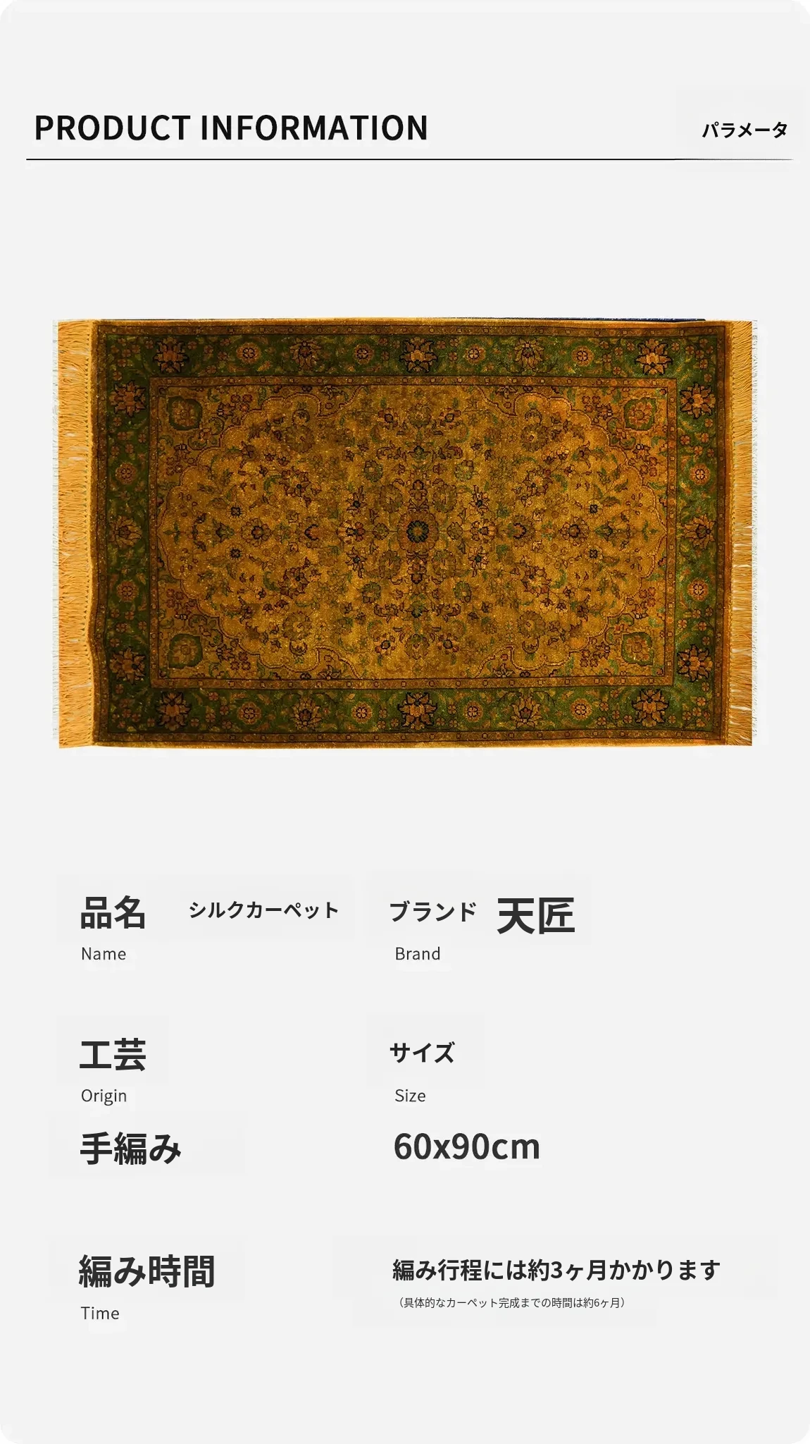 天匠手作の本物シルク製ペルシャカーペット - リビングや書斎にぴったり!贅沢な60x90cmサイズで、インテリアを華やかに演出します。お家に温かみと高級感をプラス!