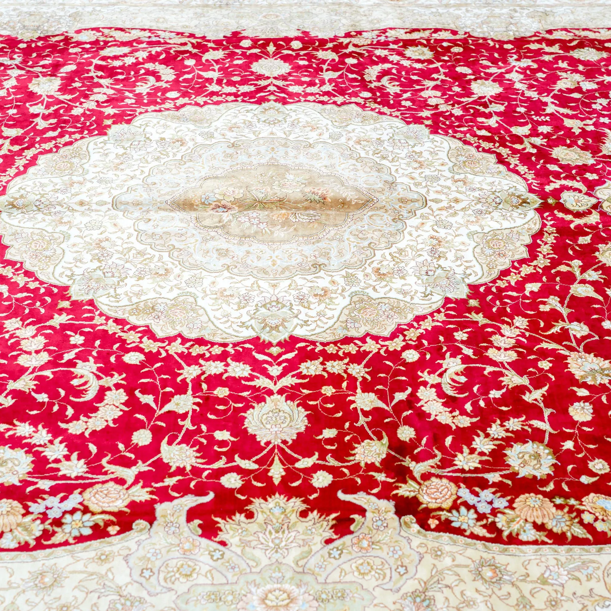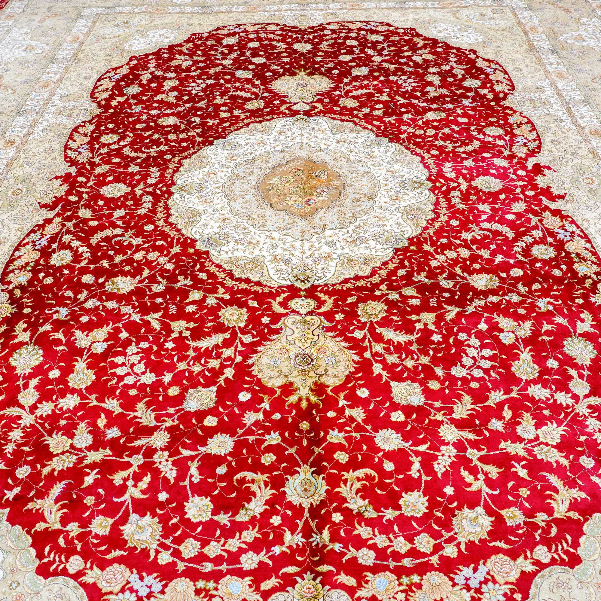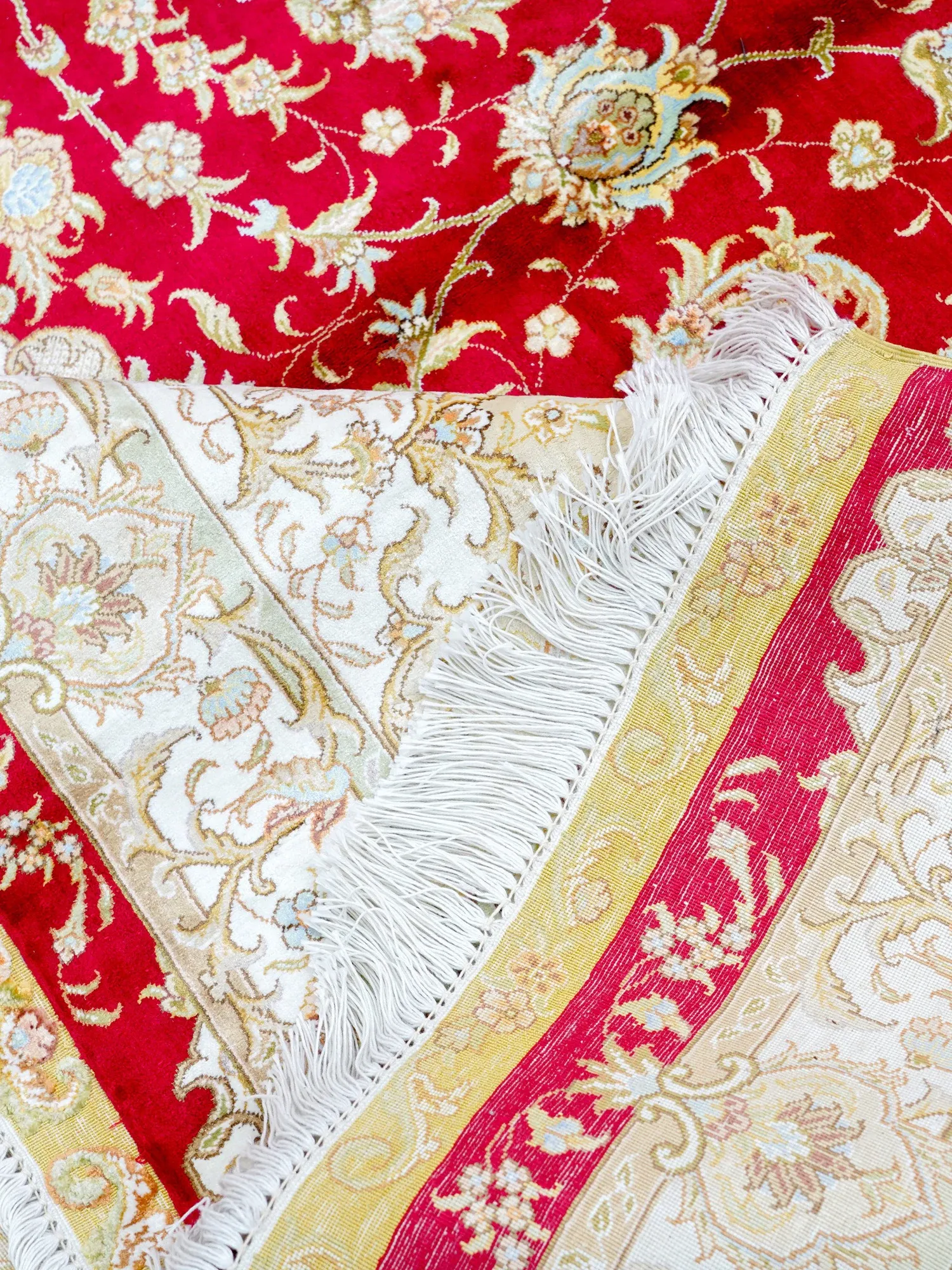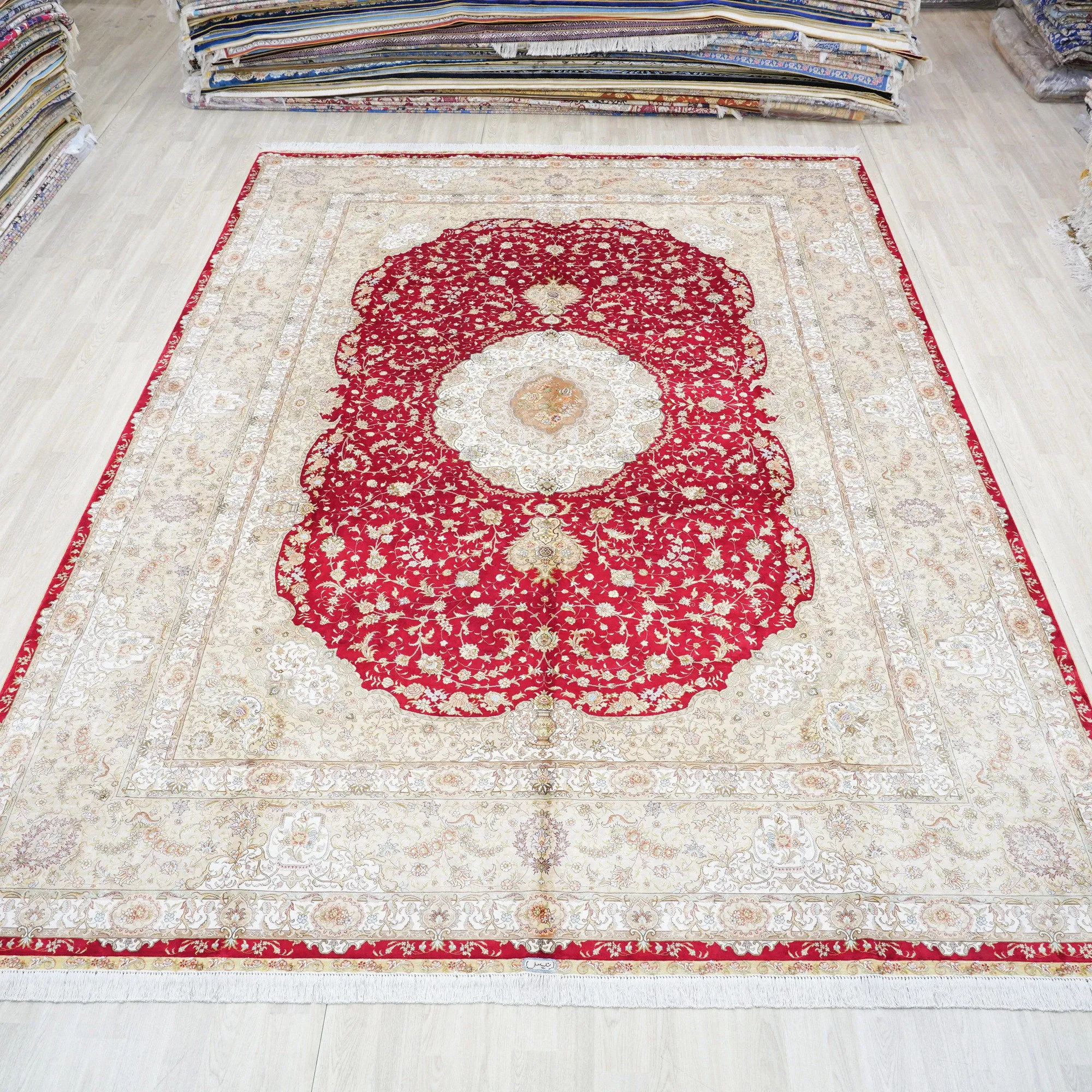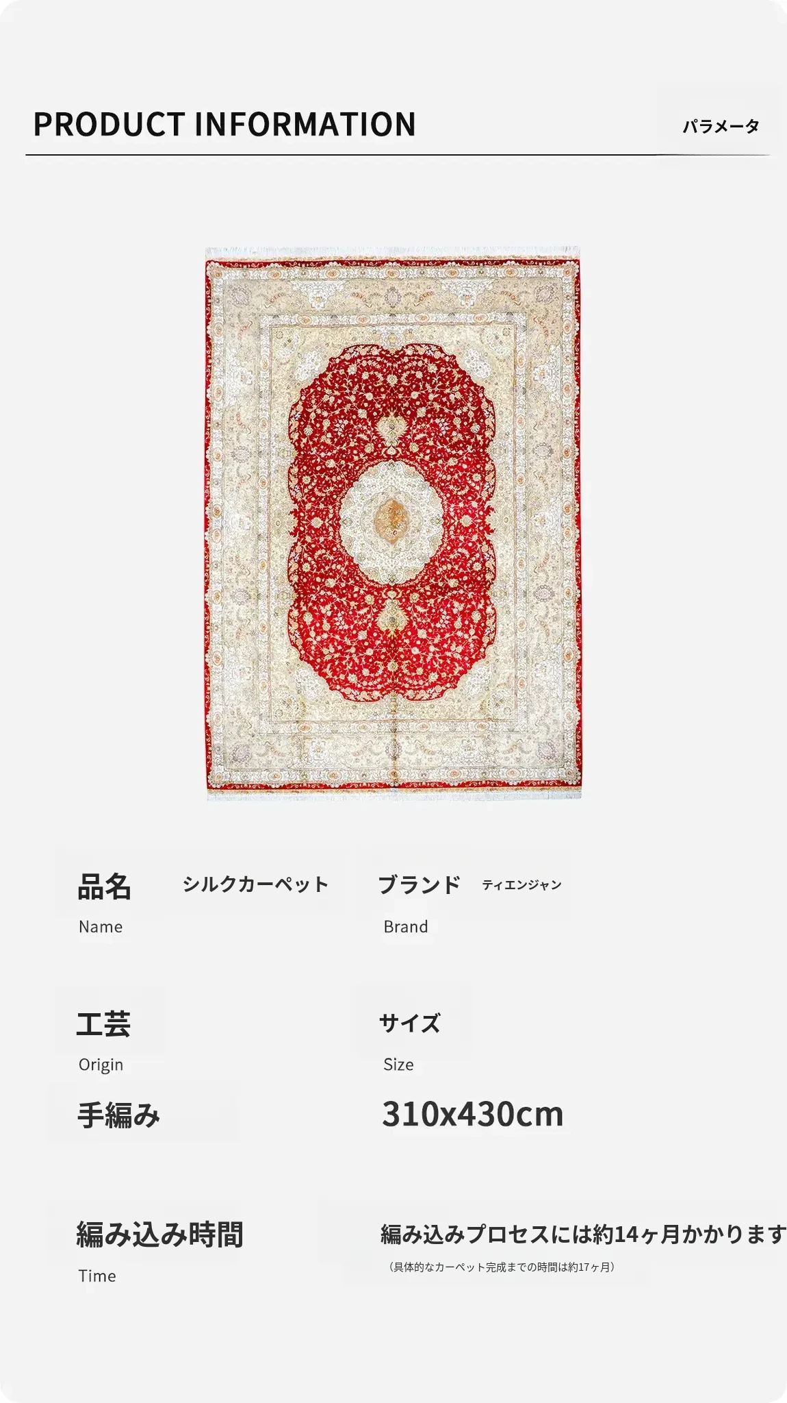 高級手作真丝ペルシャ絨毯 - 鮮やかな赤色が映える310x430cmのリビング用カーペット、贅沢な空間を演出!