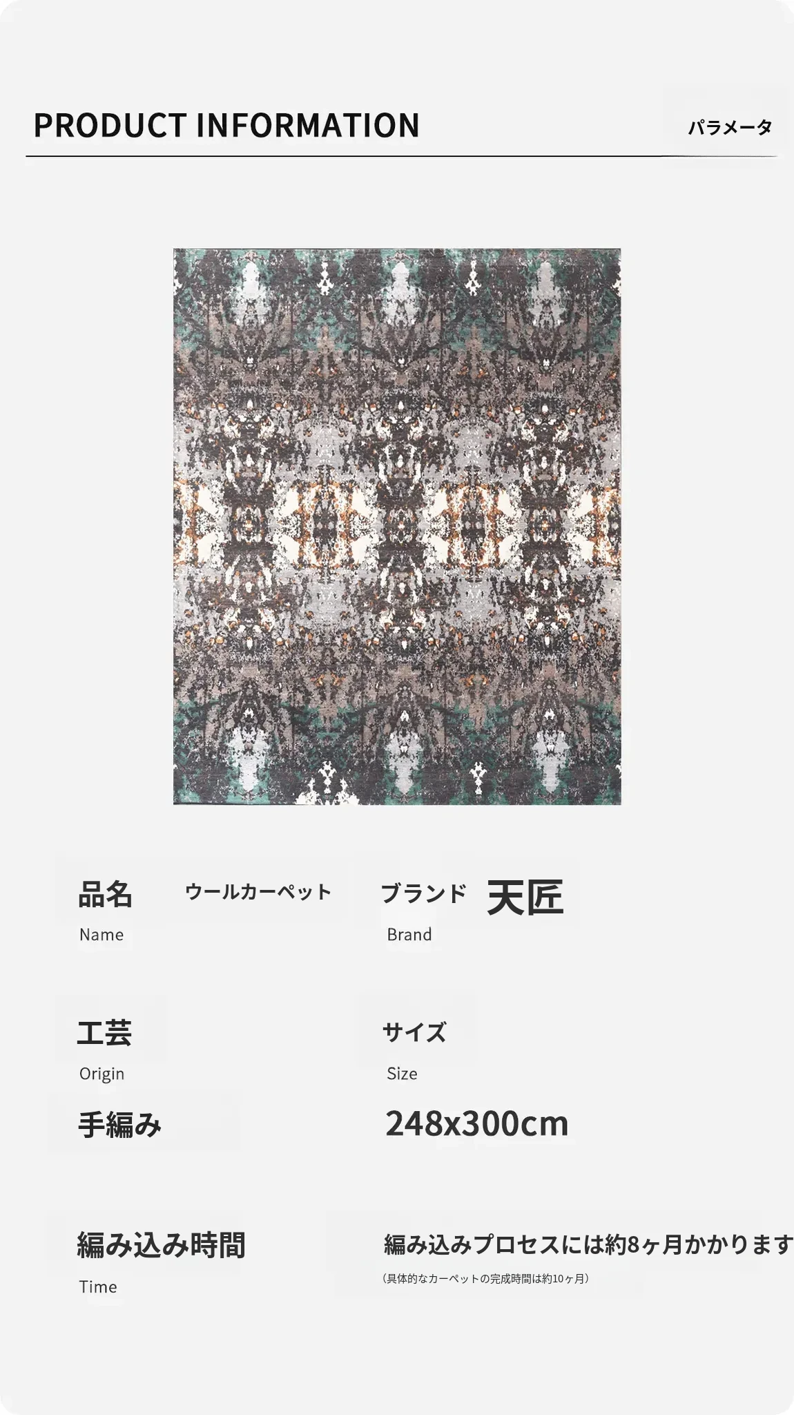 天匠輸入手作ウールカーペット - 高級感溢れるモダンデザイン、どんなインテリアにもマッチ!248x300cmの贅沢なサイズで、別荘や寝室に最適な一枚。