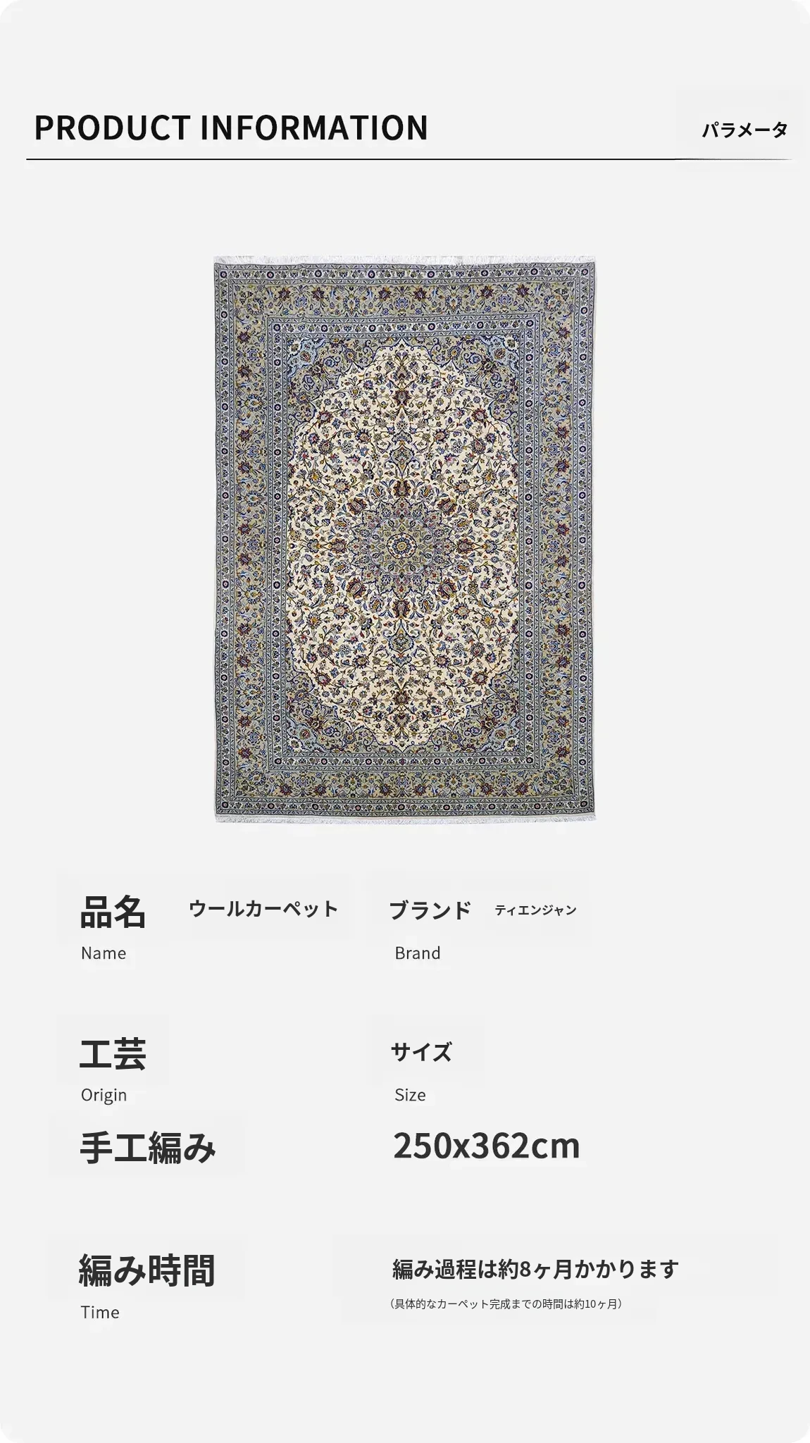 天匠の輸入ハンドメイドウールカーペット - ホルムアルデヒドフリー&無臭、汚れに強い!リビングにぴったりな250x362cmのオールマイティカーペット。
