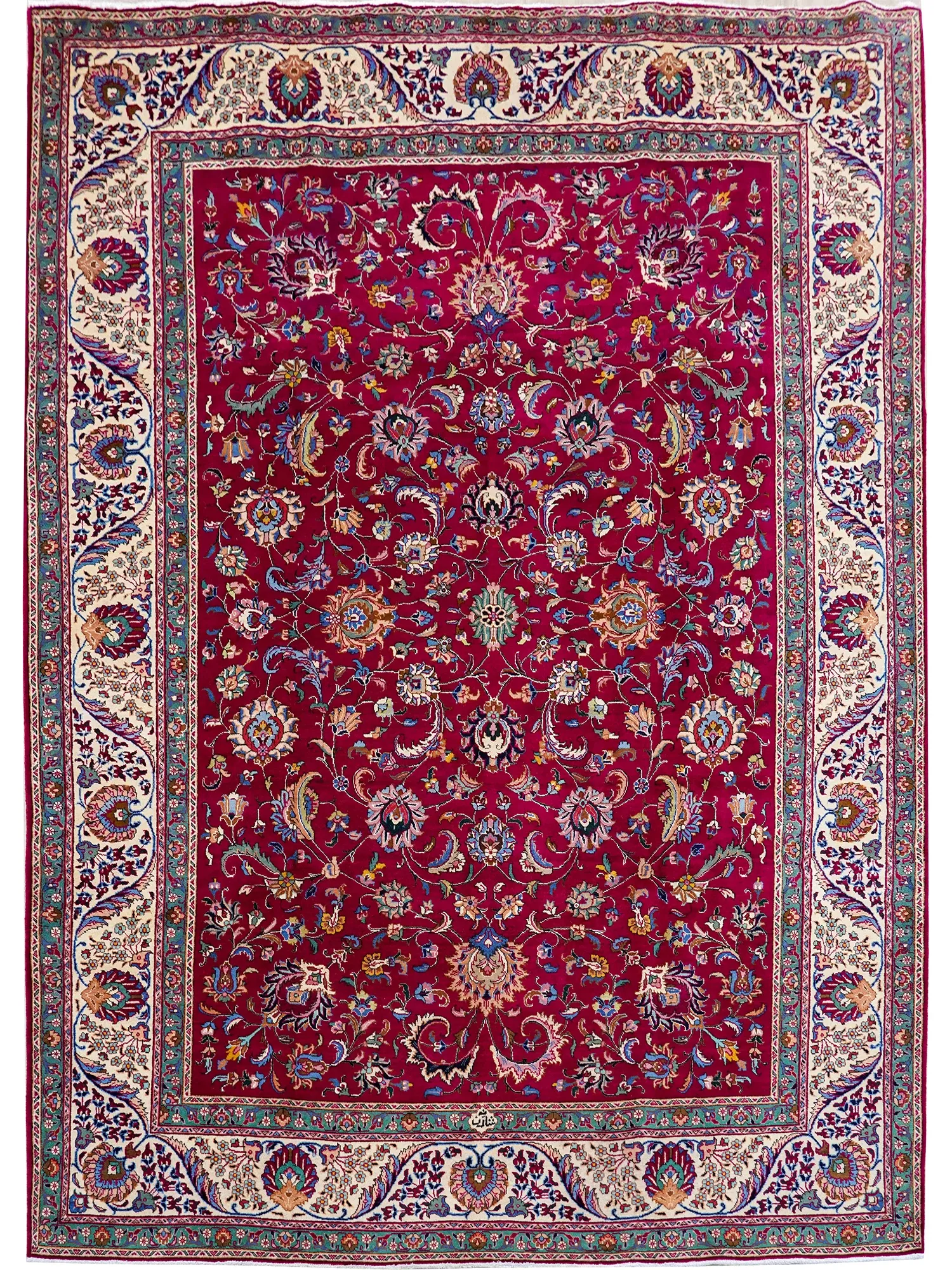 職人の手作りウールカーペット、ペルシャ風デザイン!広々とした366x549cmのサイズで、欧米スタイルのリビングにぴったり。おしゃれで温かみのある空間を演出します!