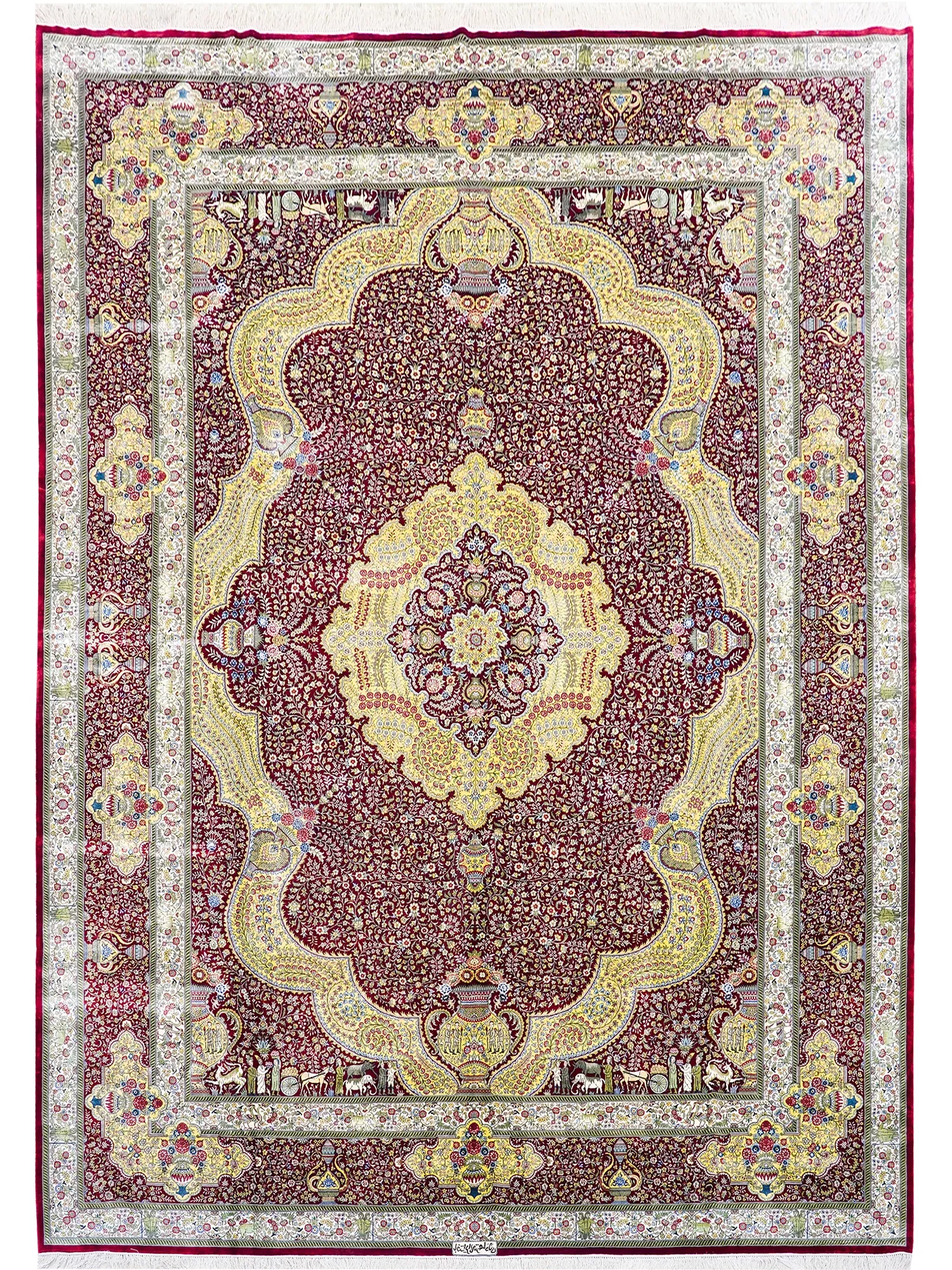 匠心手作の本真綿シルクカーペット 鮮やかな赤色のペルシャ絨毯 イラン直輸入のアメリカンスタイル 310x430cmの広々サイズ!お部屋を華やかに彩ります。