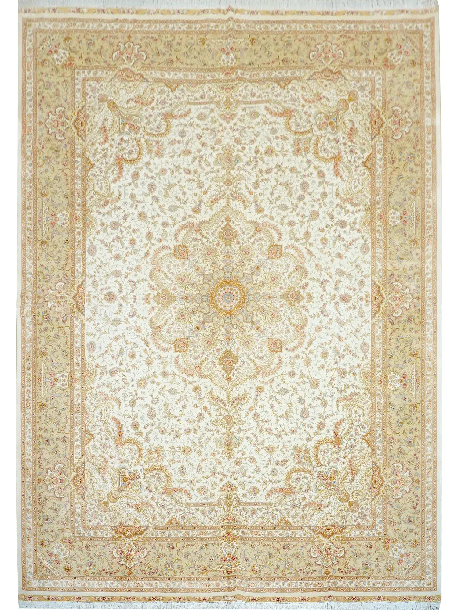 手作りのイラン産シルクカーペット - 美しいペルシャ模様、305x427cm、贅沢な空間を演出する本物のシルク素材!