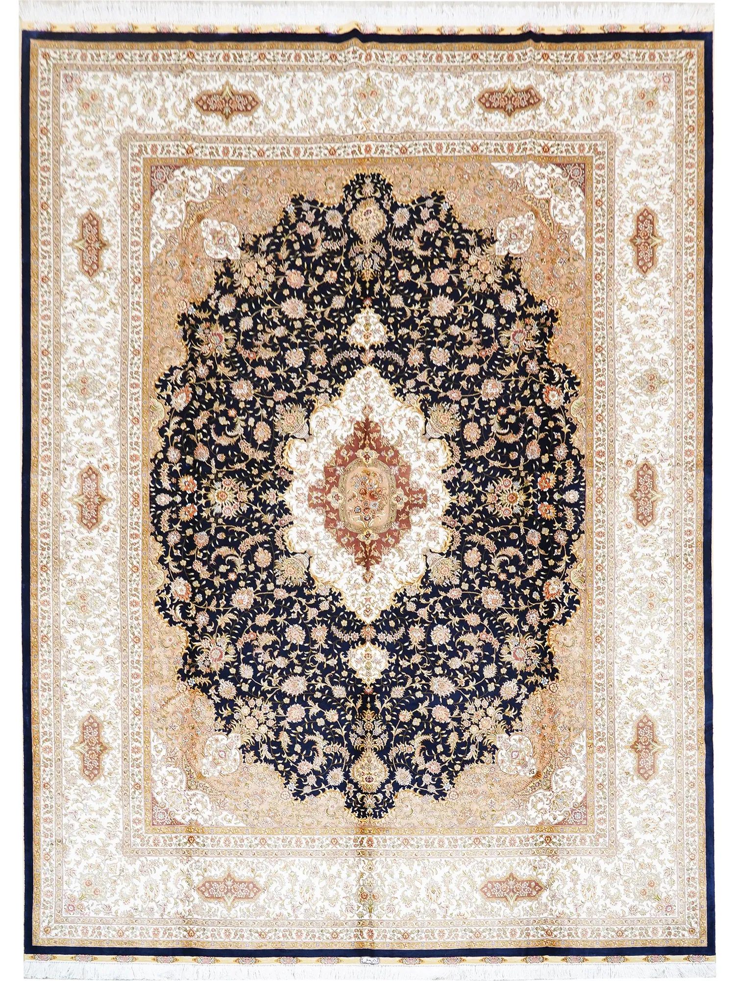 天匠手作の本物シルクラグ - 深い青色のリビング・寝室用、イラン製ペルシャカーペット(310x430cm)。高級感溢れるデザインで、贅沢な空間を演出します。