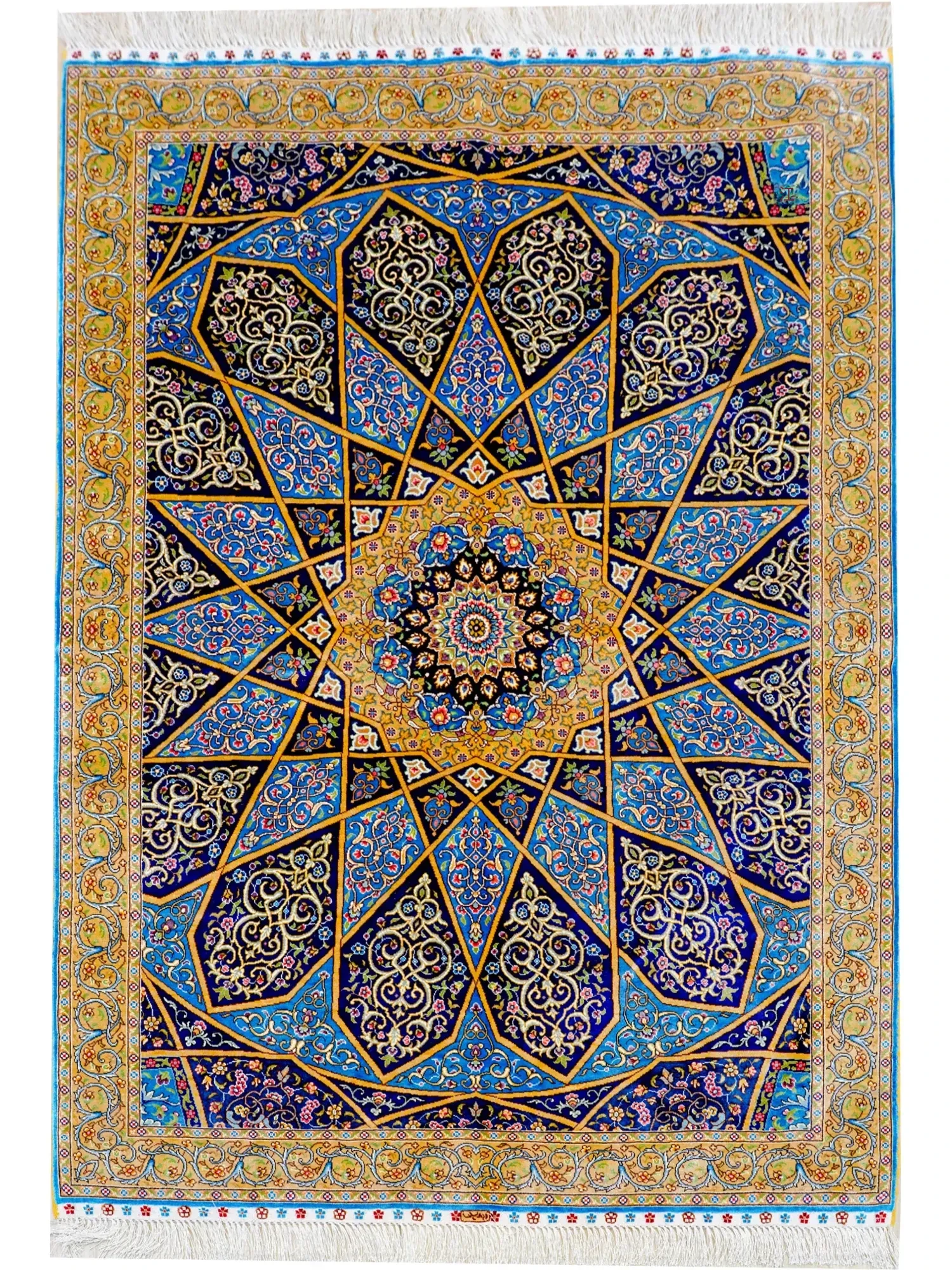 天匠の手作りシルクカーペット - ペルシャデザイン、120x180cm、手結びで職人が編んだ高級絹のラグ。寝室にぴったりの贅沢なインテリアを演出します!