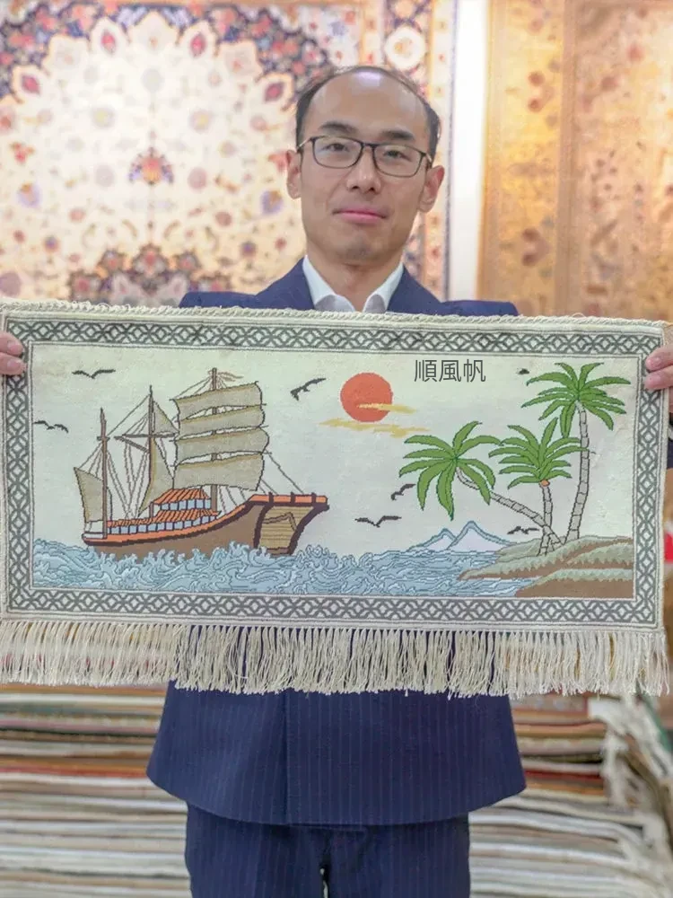 天匠のペルシャ絨毯 - 船が順調に進む風景画デザイン、職人手作りのシルクタペストリーで、あなたの空間を華やかに彩ります。